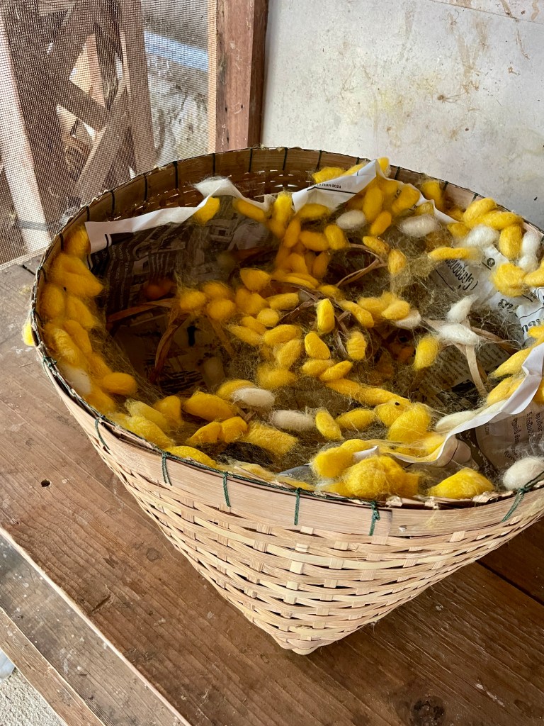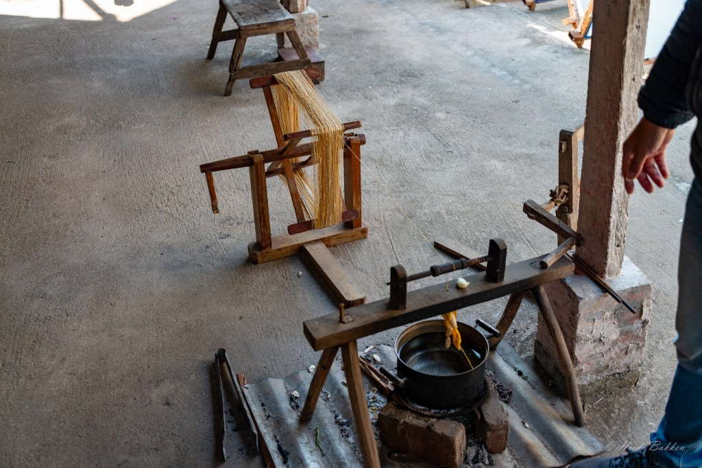 Resultatet av silkeormenes harde arbeid – og menneskene som tar jobben med å videreutvikle tråden – blir vakre skjerf, duker og veggtepper i silke.