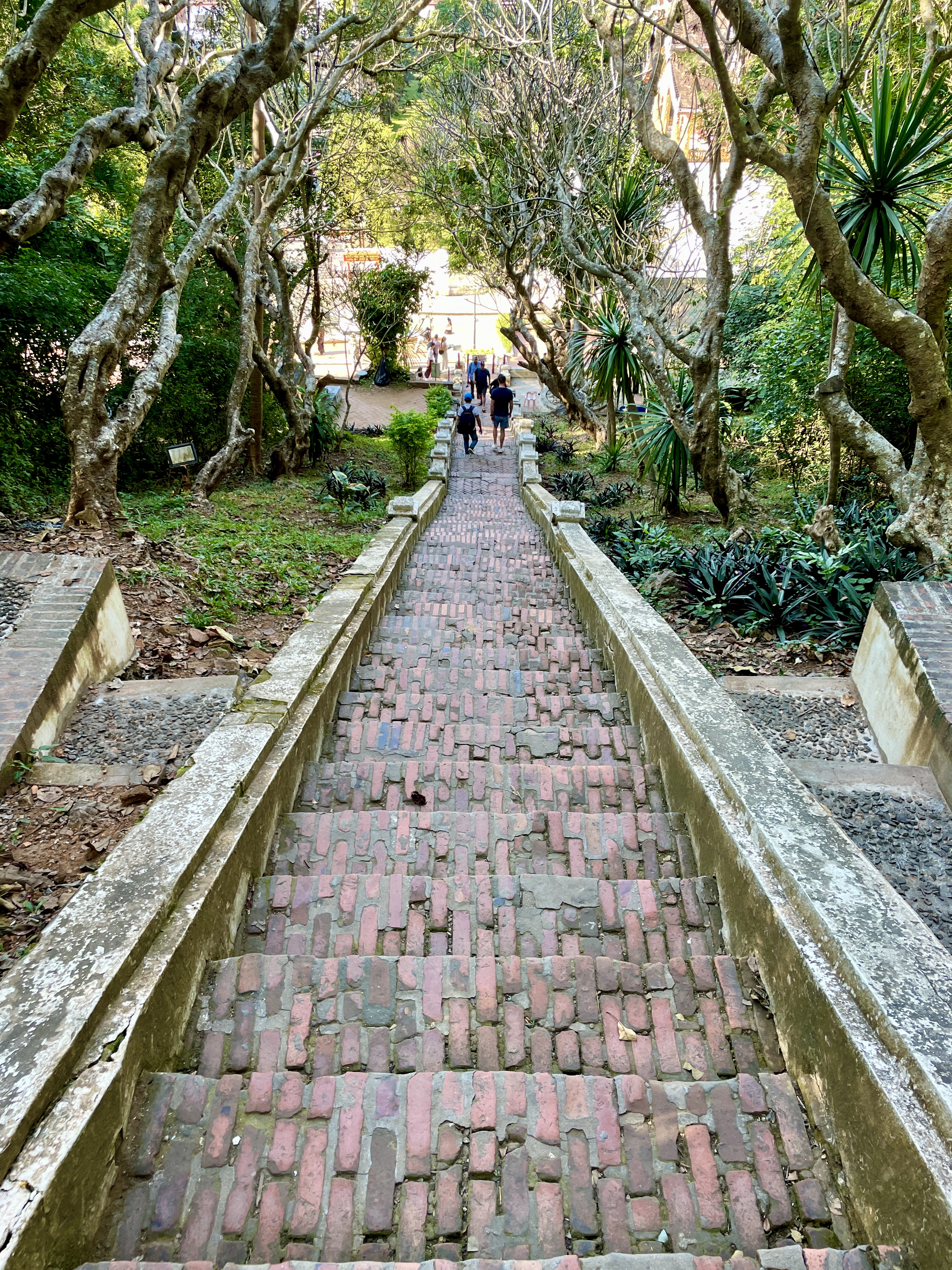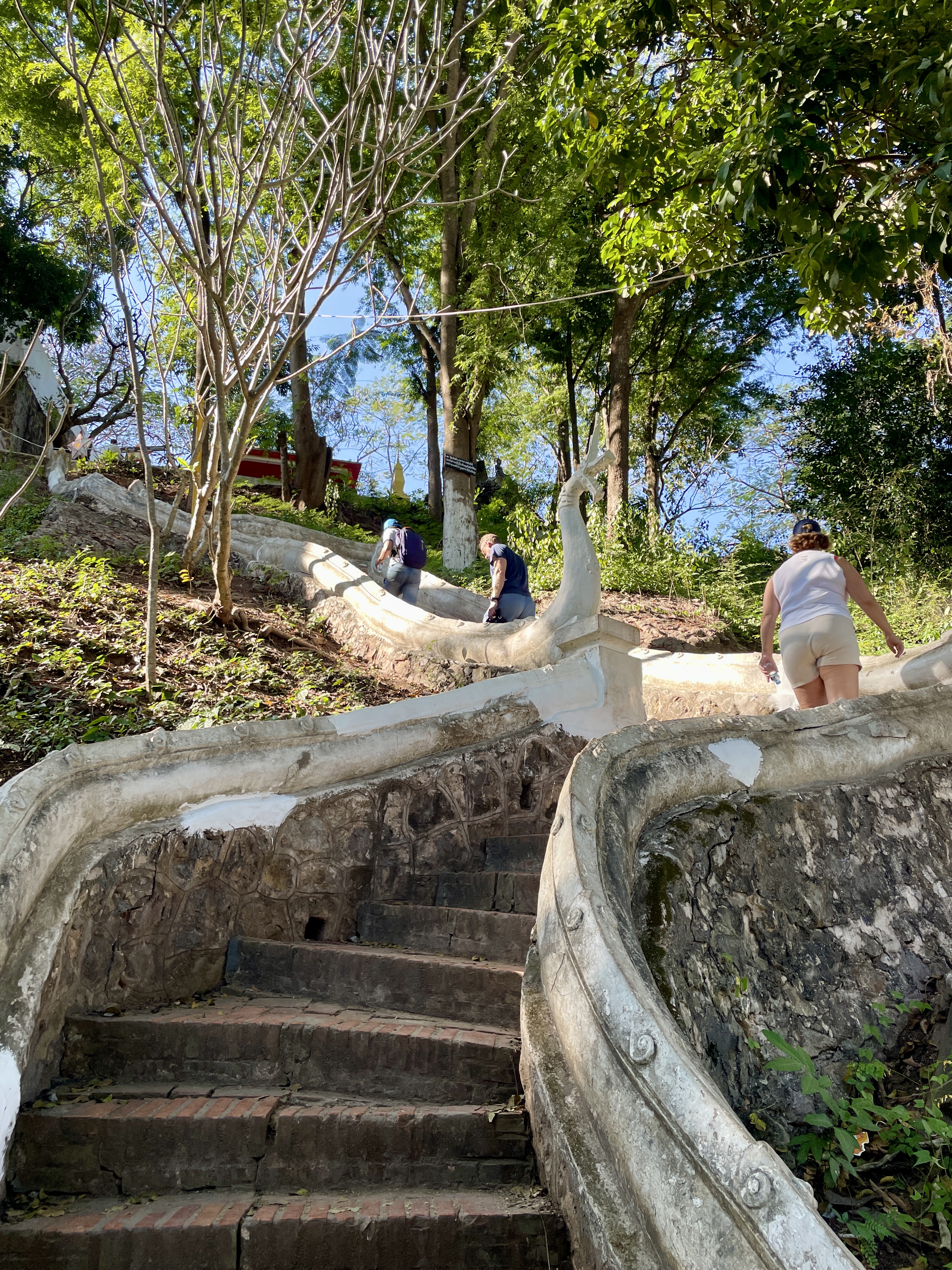 Guiden vår lanserte forslaget om å ta en topptur opp Mount Phou Si, som på Lao språket betyr “Hermit Mountain”. Toppen ligger midt i sentrum av Luang Prabang, på halvøya mellom Mekong- og Nam Khan-elvene. Høyden (ca 100 hm) er hellig for lokalbefolkningen. Opp er det, i følge guiden vår, 410 trappetrinn og ned 328 (den veien vi gikk opp og ned vel å merke). Verdens korteste topptur. Turen var vel verdt en litt forhøyet puls i noen minutter da man på toppen har 360 graders utsikt over Luang Prabang.