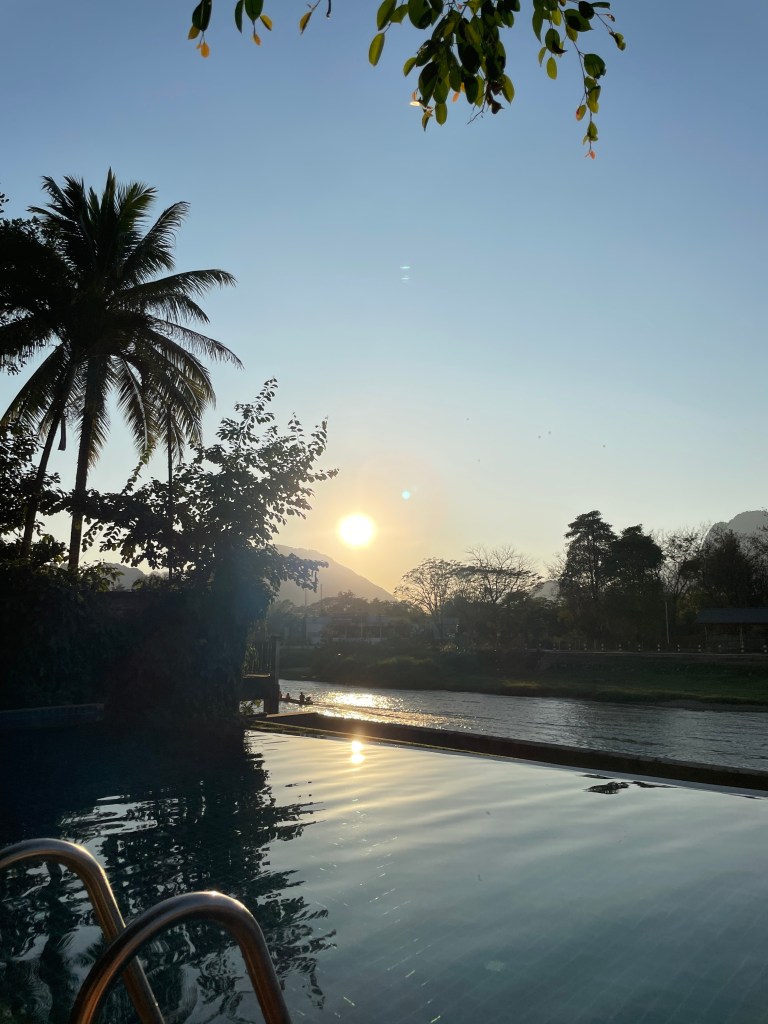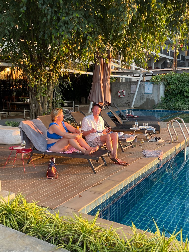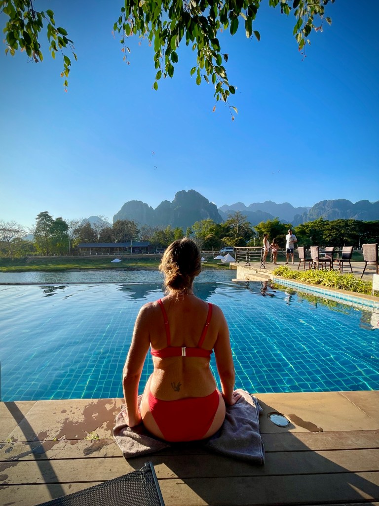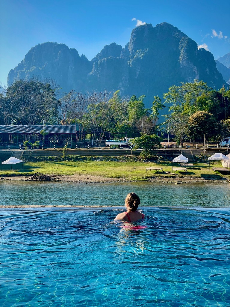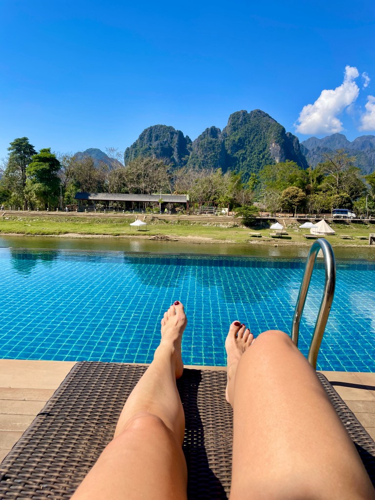 Vi begynte med chill ved bassenget i den noe høylydte duren fra elvebåtene. Derfra kunne vi ligge og nyte utsikten mot kalksteinsfjellene som er skogkledde helt til topps og som minnet sterkt om landskapet i Avatar-filmene. Frodig og fantastisk!