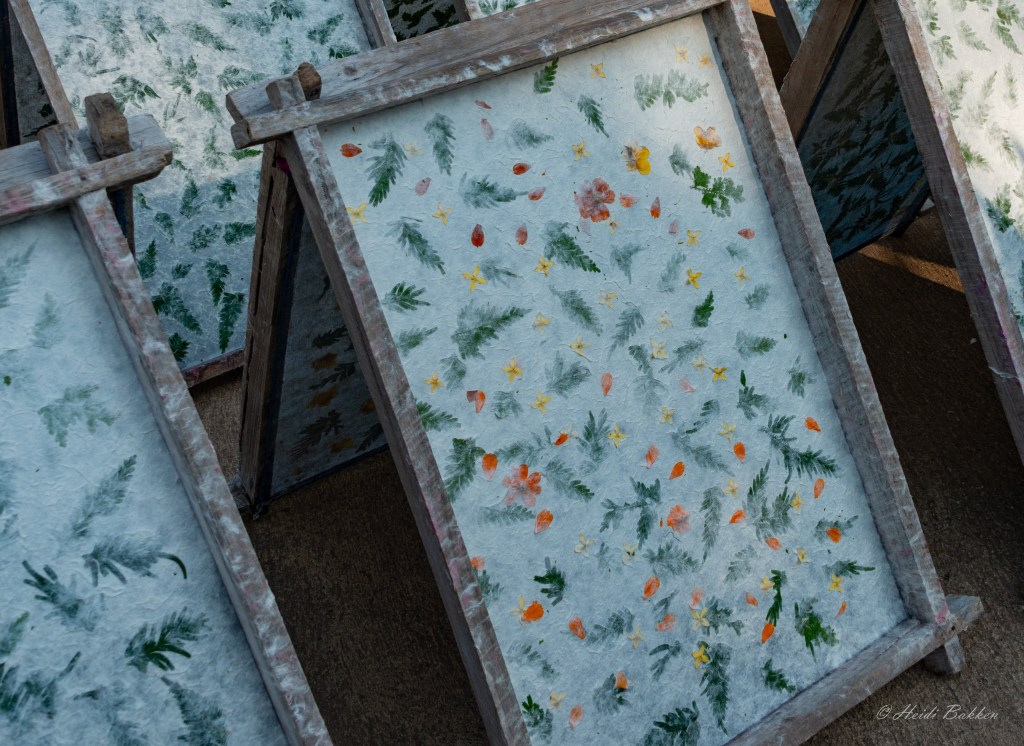 Barken bløtlegges i vann i flere timer, eller dager, før den kokes til grøt med lut for å bryte ned fibrene. Så bankes fibrene før de igjen blandet med masse vann (se fibergrøten i bilde 3). Videre helles denne grøten i en ramme med et tynt filter. Mette hjalp til med å pynte akkurat dette «arket» med blader. Etter at de var ferdige med pyntingen, ble rammen løftet opp og satt til tørk i solen. De tørre arkene dras ut av rammene og brukes til blant annet lykter, lampeskjermer og vakre kort.