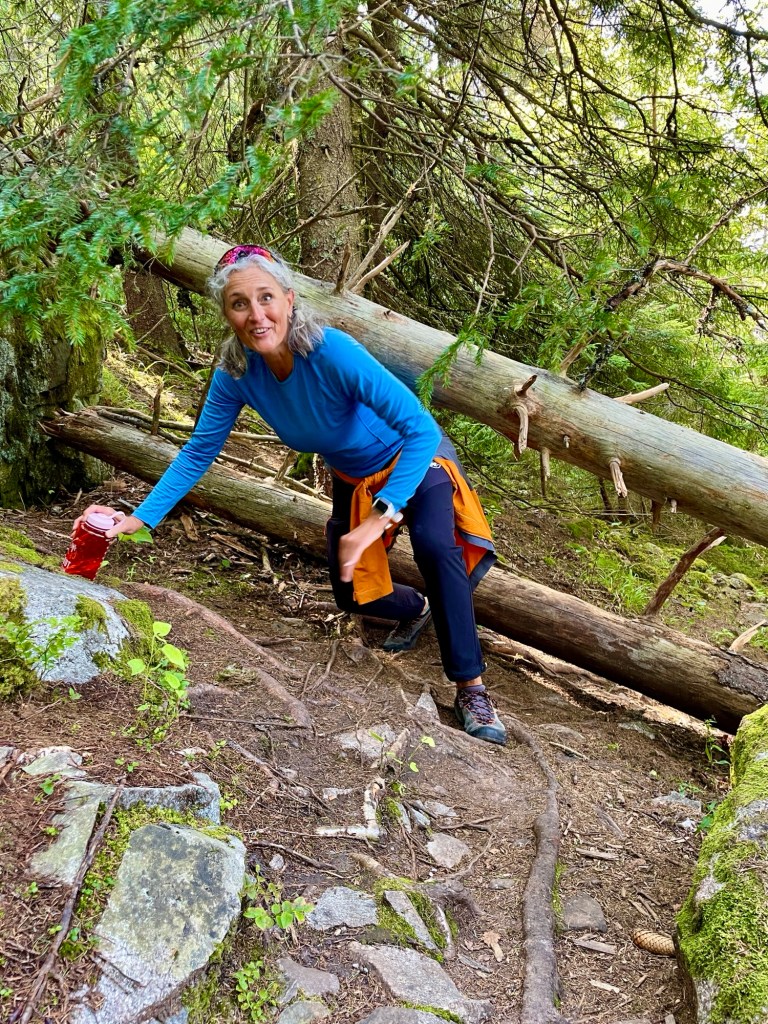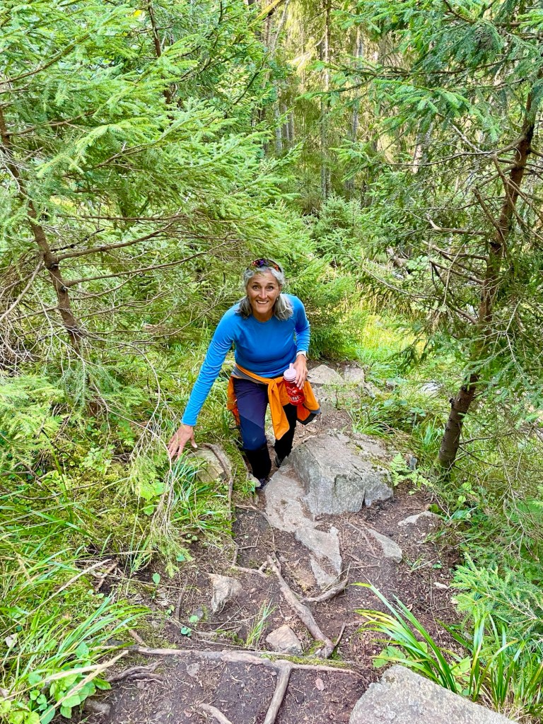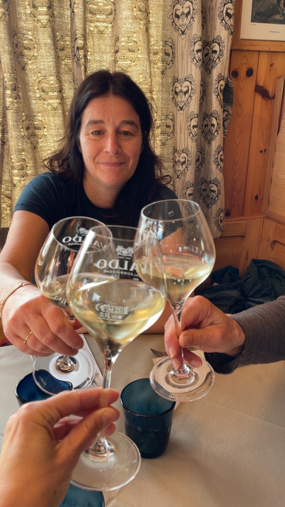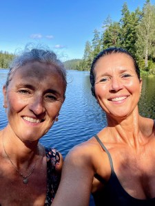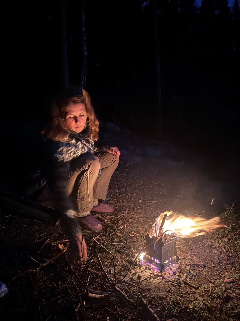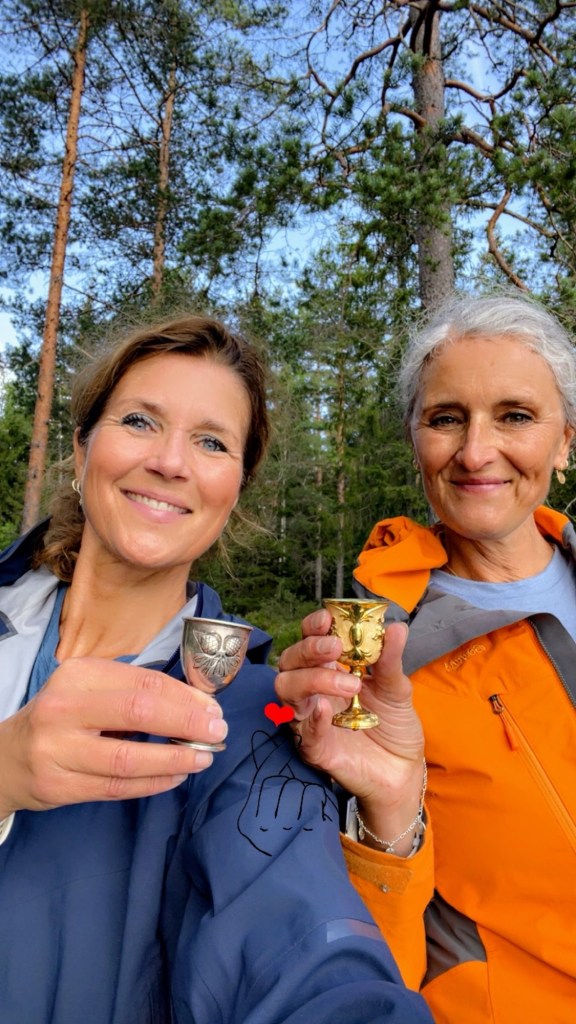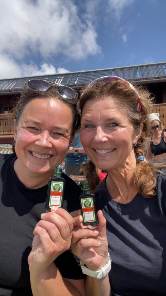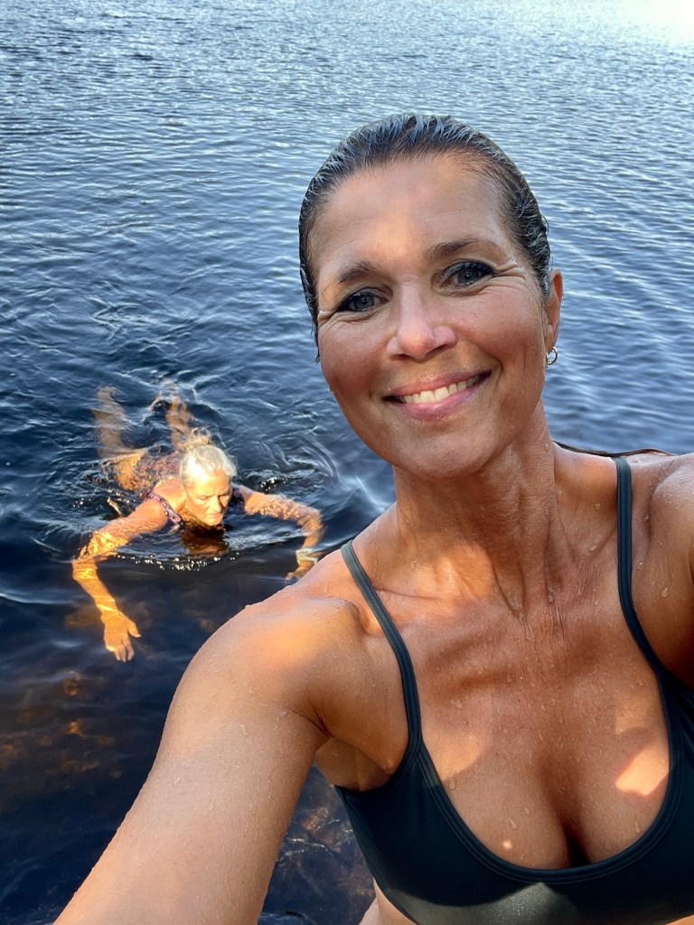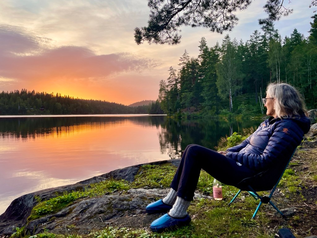 Mindre vin i flasken betyr mindre tyngde og mer luft og heisann – vinen ser sitt snitt til en tur. Kvelden lakker og lir og det kommer tre menn forbi på sup og i kajakker. De lurer på om vi tilfeldigvis kanskje mangler en flaske vin? Tror du ikke at flasken hadde stukket av igjen – og denne gangen var den nesten på vei ned bekken til Mosjøen. Gutta var galante. Tilbød seg å hente den til oss og fortalte samtidig at de hadde badestamp på andre siden av vannet.