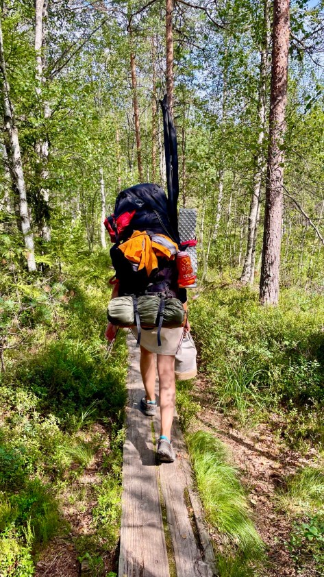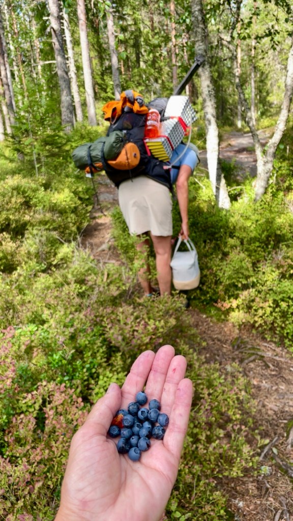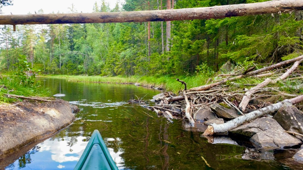 Det var litt pent der synes jeg. Stillere enn ute på Mosjøen, mye skog tett ned til vannet, noen høye klipper, et par steder man kunne se for seg at man kunne campe. Jeg pekte og foreslo steder vi kunne slå leir, men jeg kjenner Hilde så godt at jeg fort skjønte at denne verden ikke stod til forventningene. Hilde var skuffet. Vi måtte videre. Ingen tvil om det. Vi fikk humpet oss gjennom sundet igjen og fortsatte nordover til enden av Mosjøen. Der dro vi kanoen på land og gikk for å utforske.