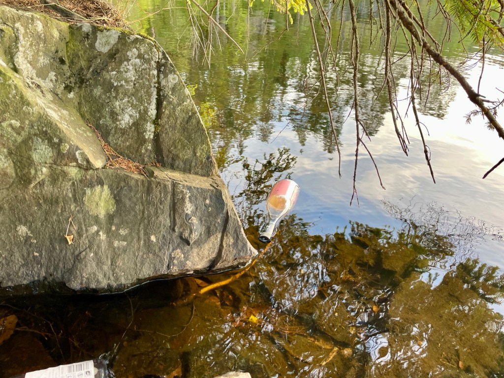 Som seg hør og bør på tur hadde vi med oss vin. I plasflaske denne gangen. Flasken ble lagt i vannkanten og lå der trygt og hvilte mot en stein. Men så oppdager vi plutselig at den er på vei ut i verden helt på egenhånd.