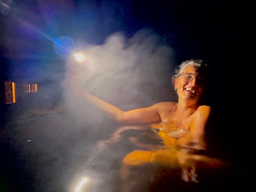 Det var fullmåne og gutta lurte på om vi kunne gjøre en liten byttlåning av båt. Hvis de fikk låne vår kano, som lå nede ved Mosjøen, kunne vi få låne deres robåt, på Tonevann. Vi ble også utfordret til å ta en dupp i badestampen, som fremdeles skulle holde 40 grader. Vi takket ja til byttelånet og gikk i robåten.