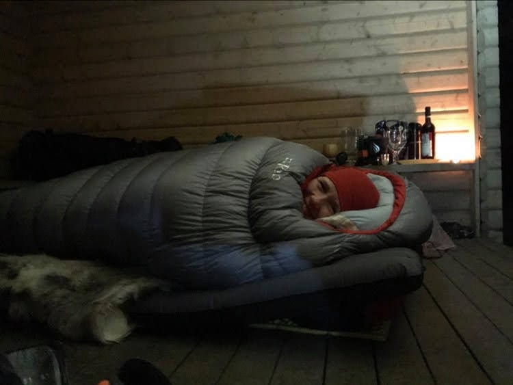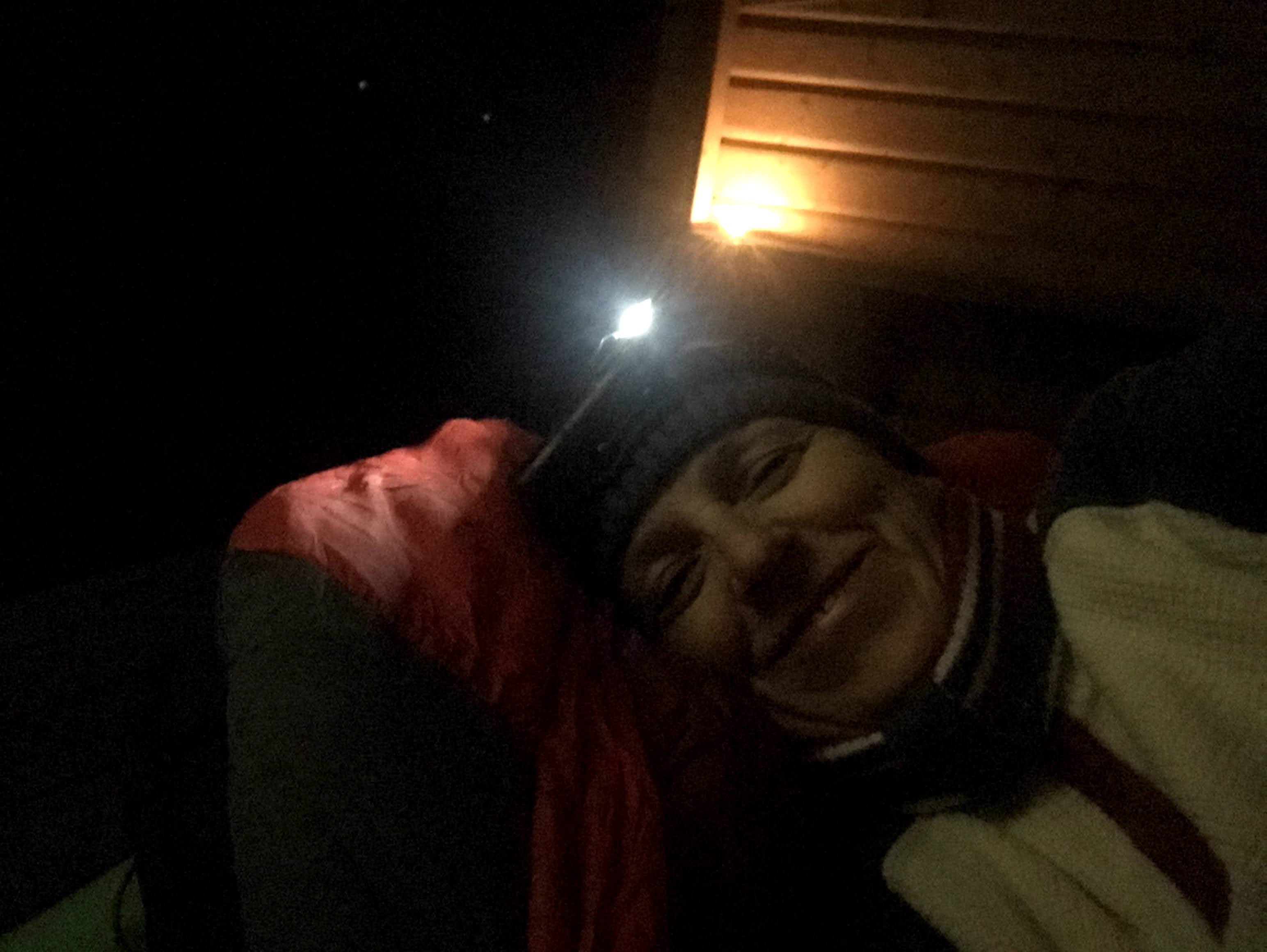 I køya har jeg to liggeunderlag (ett term-a-rest og ett Exped med dun). Over dette har jeg en god og varm sovepose. Dette skal jeg komme meg opp i . Det var nok ikke verdens mest elegante entring av hengekøye, men til å være et første forsøk er jeg fornøyd. Jeg åler og vrikker og får liggeunderlag ganger to og sovepose og meg selv til slutt i en helt perfekt posisjon. Dunjakken fungerer som hodepute.