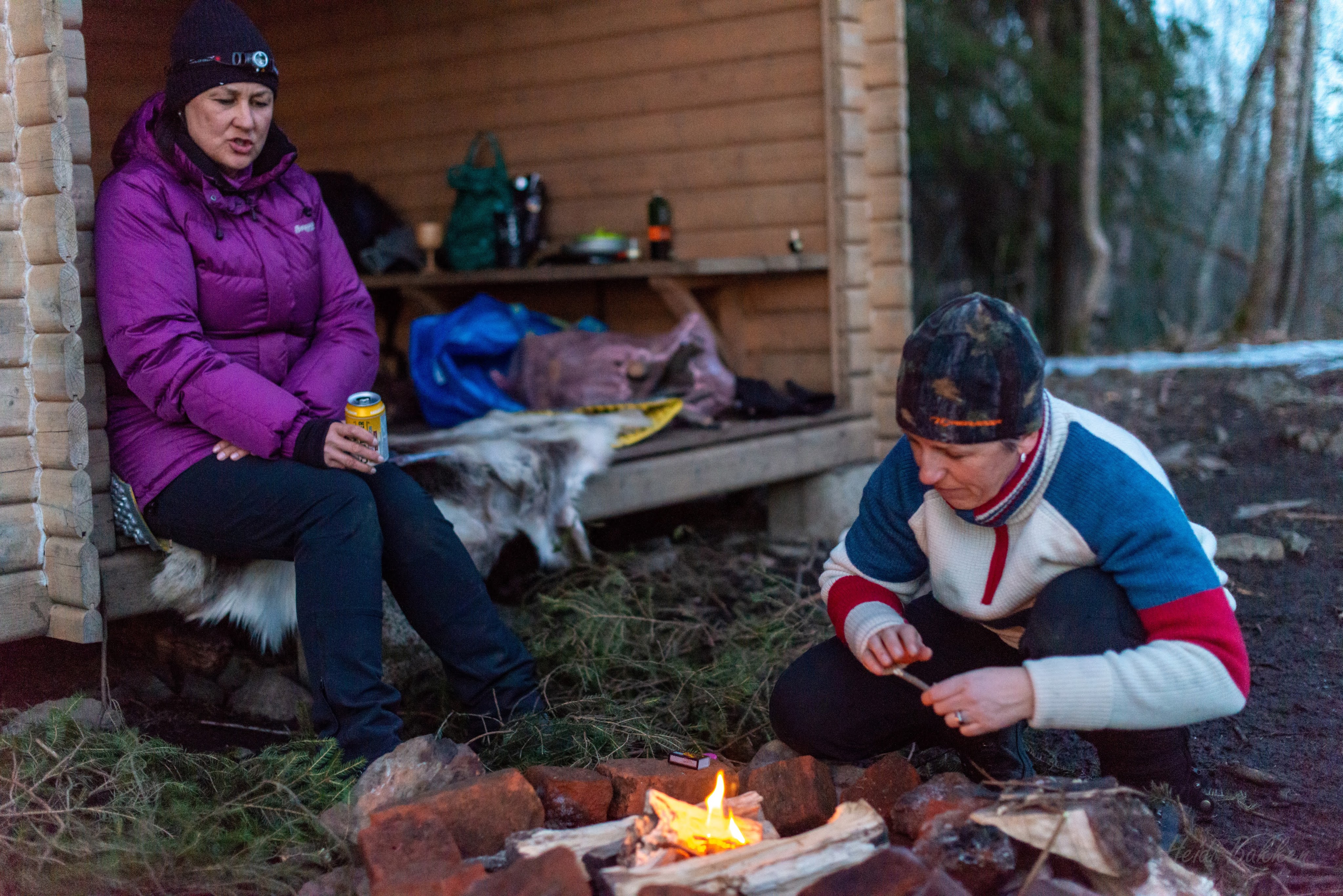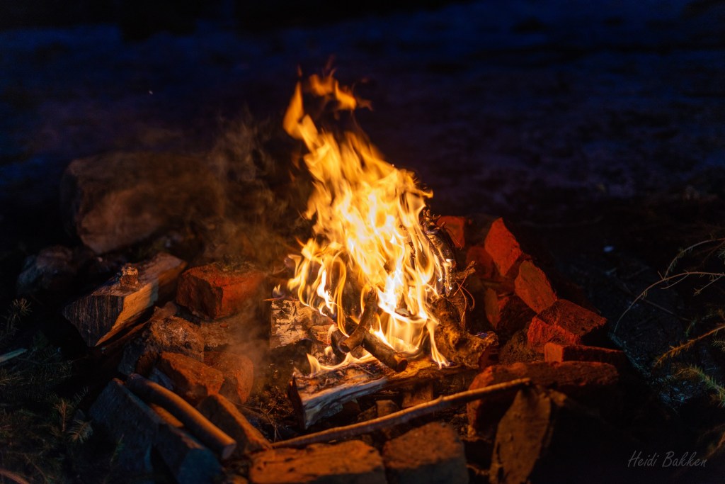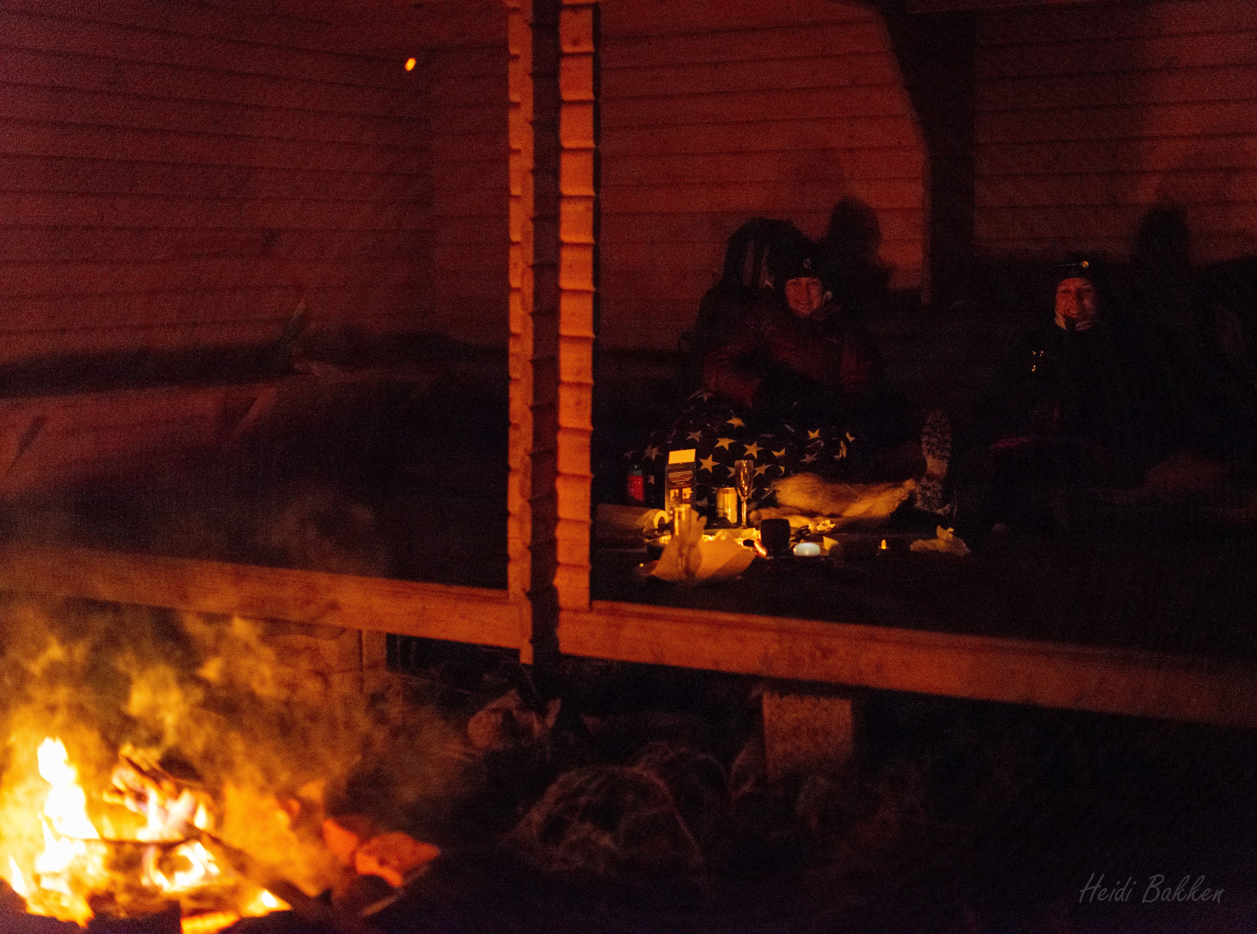 Kvelden sniker seg sakte på, disen legger seg som et slør over enden av tjernet og vi sitter ved bålet til det brenner nesten helt ned. Sjelen er rolig og jeg er klar for min første natt i hengekøye.