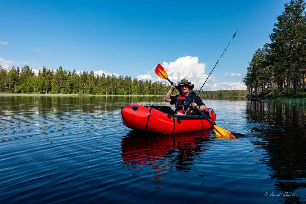 Morgenkaffen ble inntatt i vannkanten før vi tok et nydelig morgenbad i 22 graders fløyelsmykt ferskvann. Etter frokost rigget vi oss til i hver vår flåte og la ut på padletur med fiskesnørene på slep.