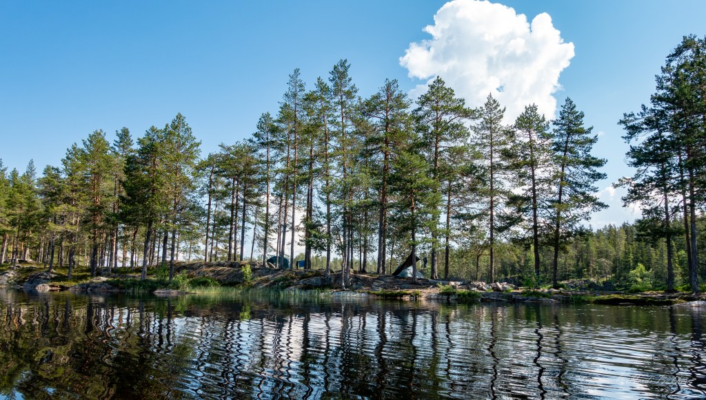 Underveis noterte vi oss fremtidige mulige leirplasser. Sola skinte fra en klar blå himmel, trær og svaberg speilet seg i den blanke vannoverflaten, naturen var stille bortsett fra litt fuglekvitter og lykken klukket rundt packraftene.