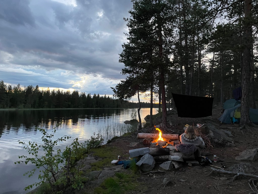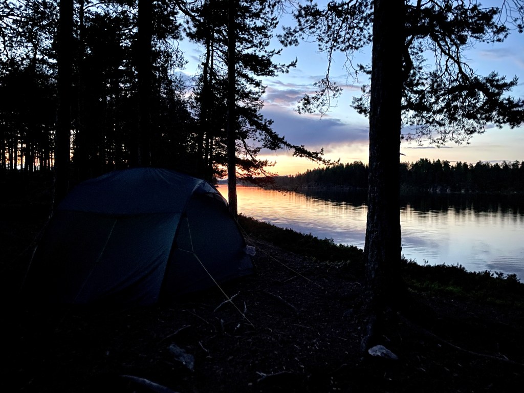 Kvelden går fort når man skal padle, slå leir, bade og lage middag. Før vi visste ordet av det hadde natten senket seg og da tok det ikke lang tid før vi krøp til køys.