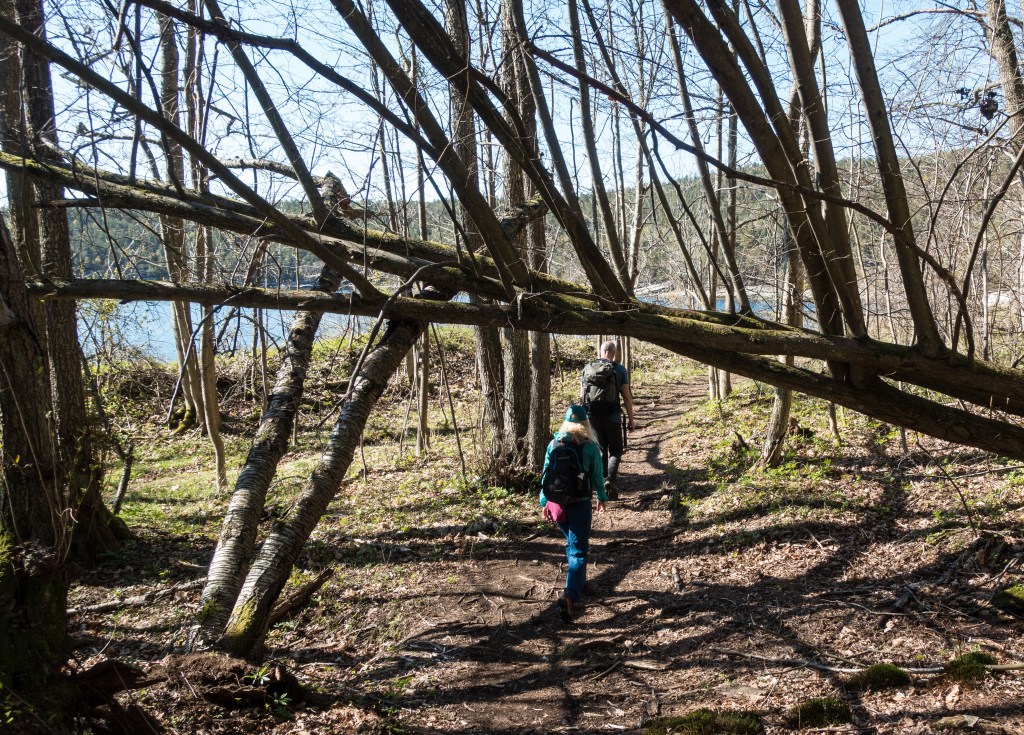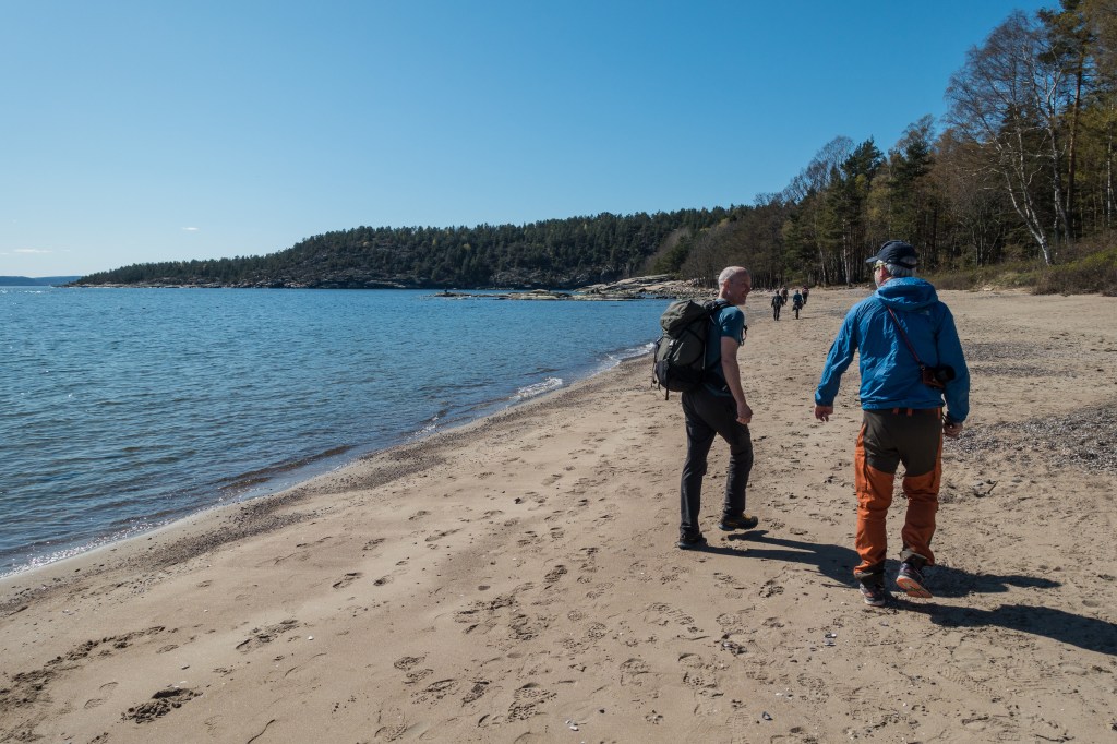 Fra Stikkvann gikk turen på Sandstien mot Bjørnåsen. Sandstien er en gammel historisk ferdselsvei (oldtidsvei) over Hurumhalvøya mellom Fergestad ved Oslofjorden og Hurum kirke. På denne pittoreske veien har det lokale historielaget satt opp postoppslag med interessant historie fra området. Det ble selvfølgelig litt høytlesning av de som ikke trengte briller.