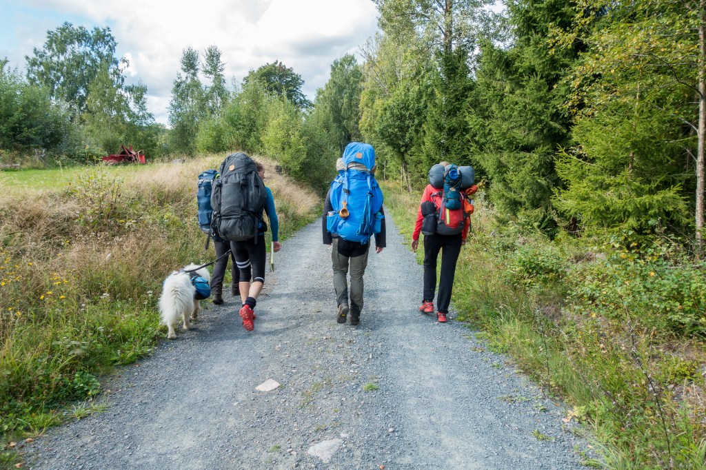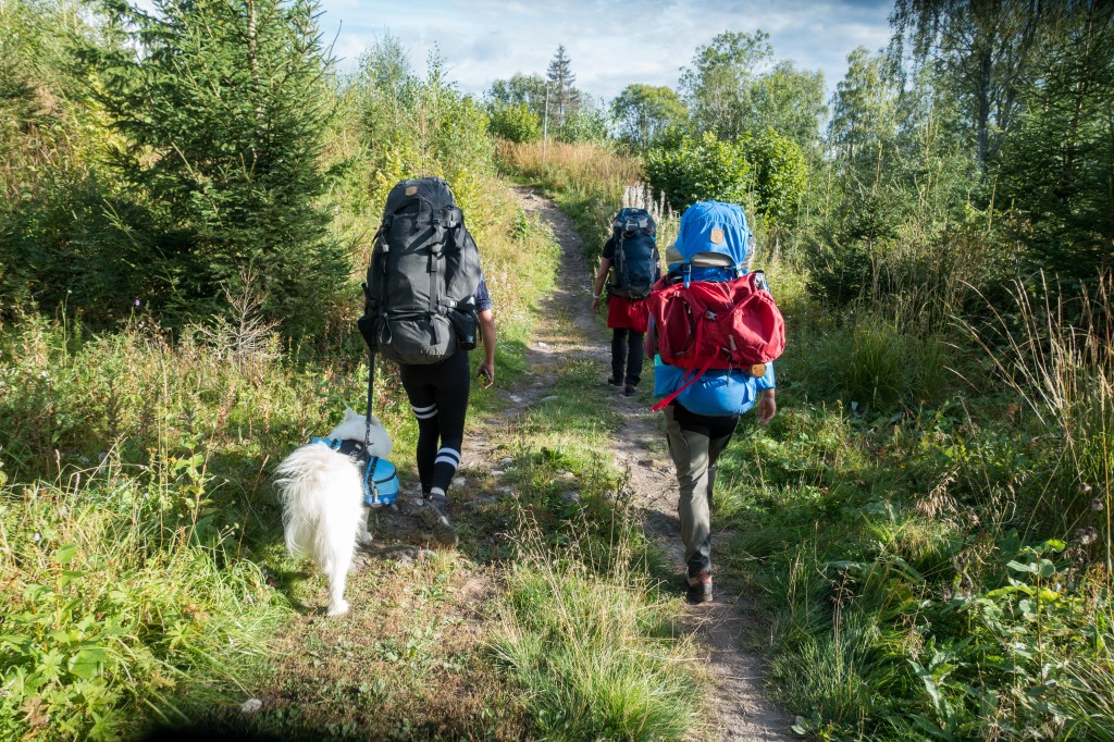 Læringspunkt nr. 2: Riktig festing av packraft på sekk. Vi hadde sett en video på Youtube og tenkte at dette kan vi. Vi kunne det nesten. For slapt strammede stropper gir deg en packraft som siger nedover og som ender opp med å dunke deg i knehasene. Ikke ideelt når det skal spaseres et stykke. For stramt festet mot toppen av sekken så får du packraften i hodet og må gå duknakket og myse mot bakken. Også slitsomt. Etter noen forsøk sitter teknikken og vi har lært.