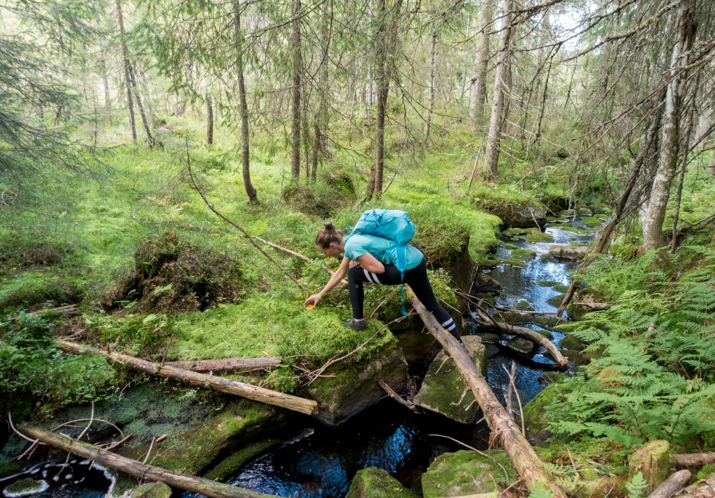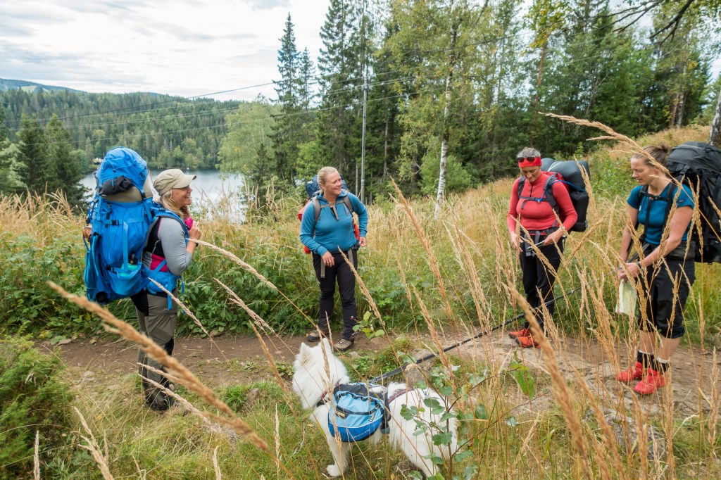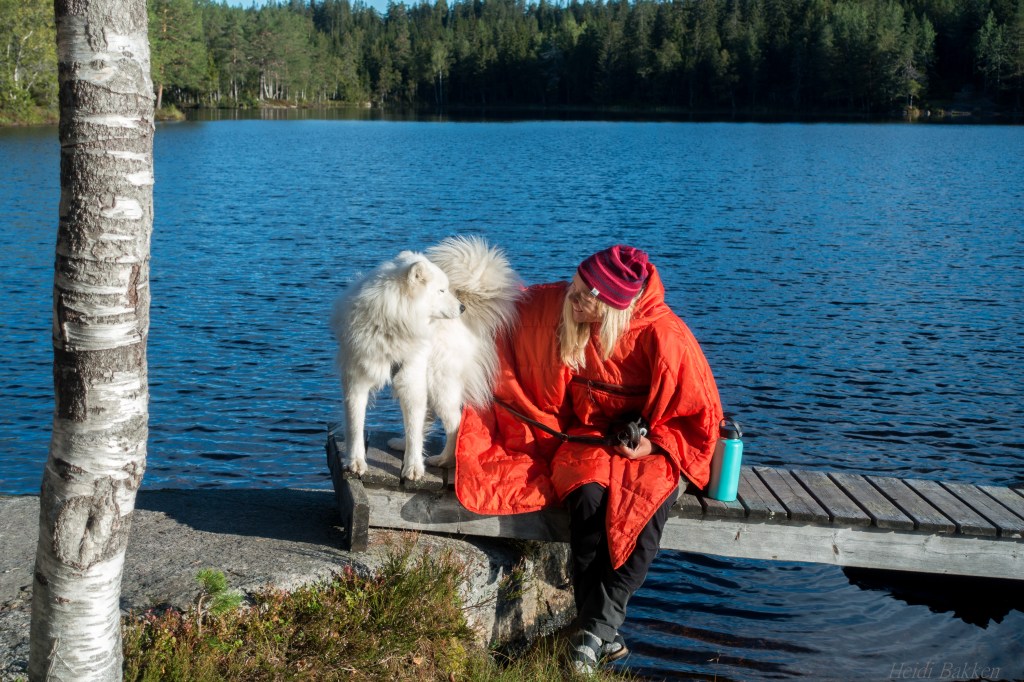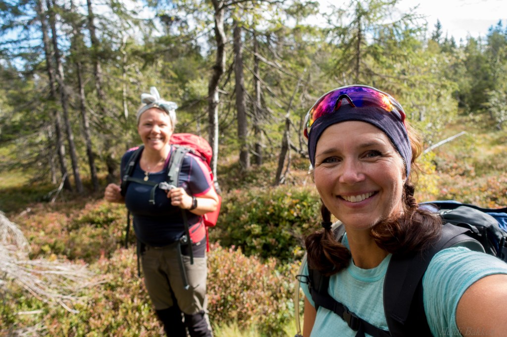 Etter å ha padlet hele Mylla gikk vi land for å krysse over til det neste vannet; Ølja. Vi hadde aldri gått med packraften på ryggen og jeg gledet meg skikkelig til å se Hilde Lillian manøvrere alt utstyret opp på ryggen. Livets små gleder! Det noteres at gleden var størst ved å se Hilde Lillian med ekvipasjen på ryggen. En sekk med packraft som veier minst 25 kg og som fungerer som et digert segl er krevende å gå rundt med – og kanskje ikke så gledelig. Spesielt i motvind kjennes det mer som å gå i ett motstrømsbasseng på land enn noe annet.