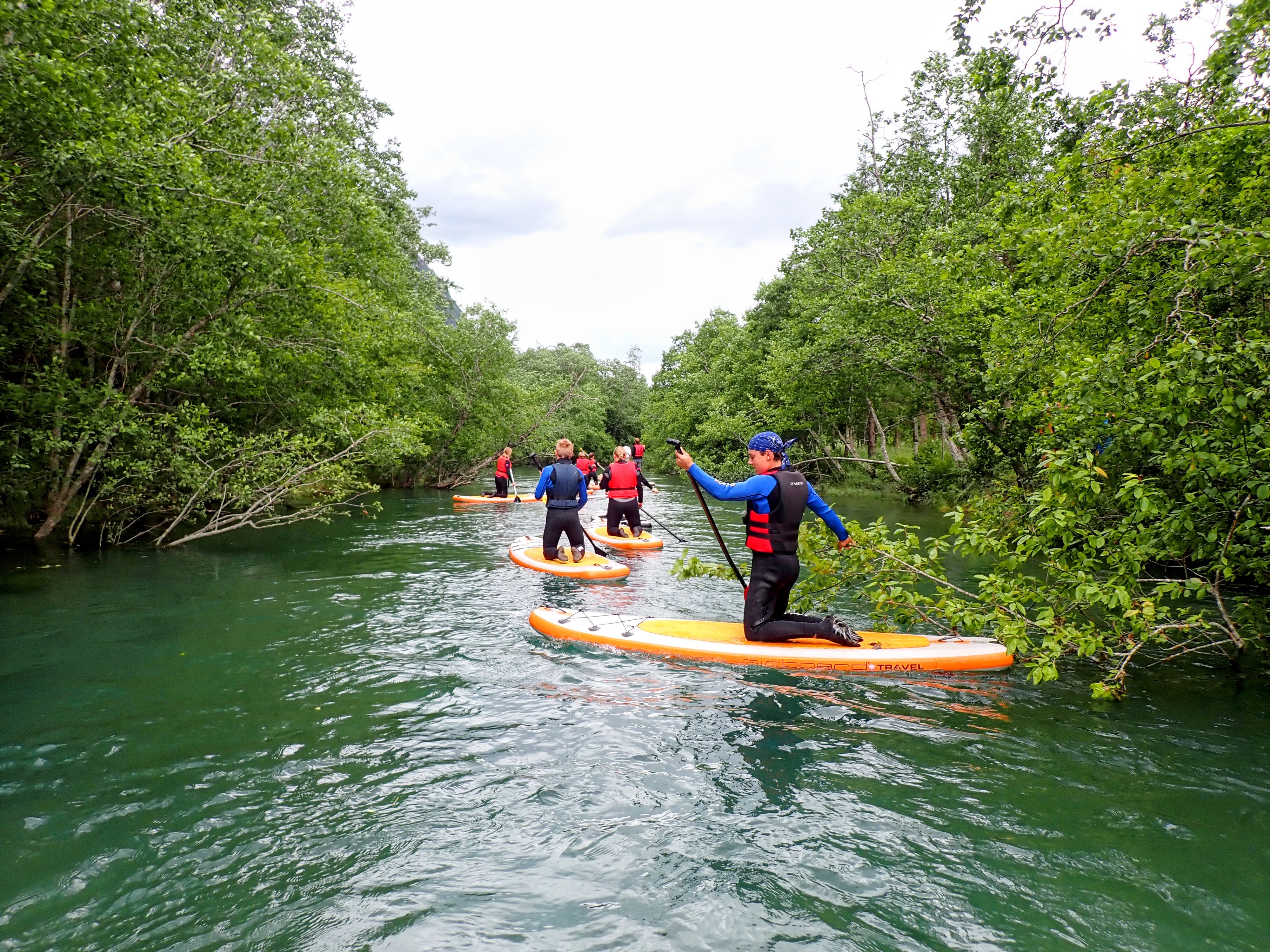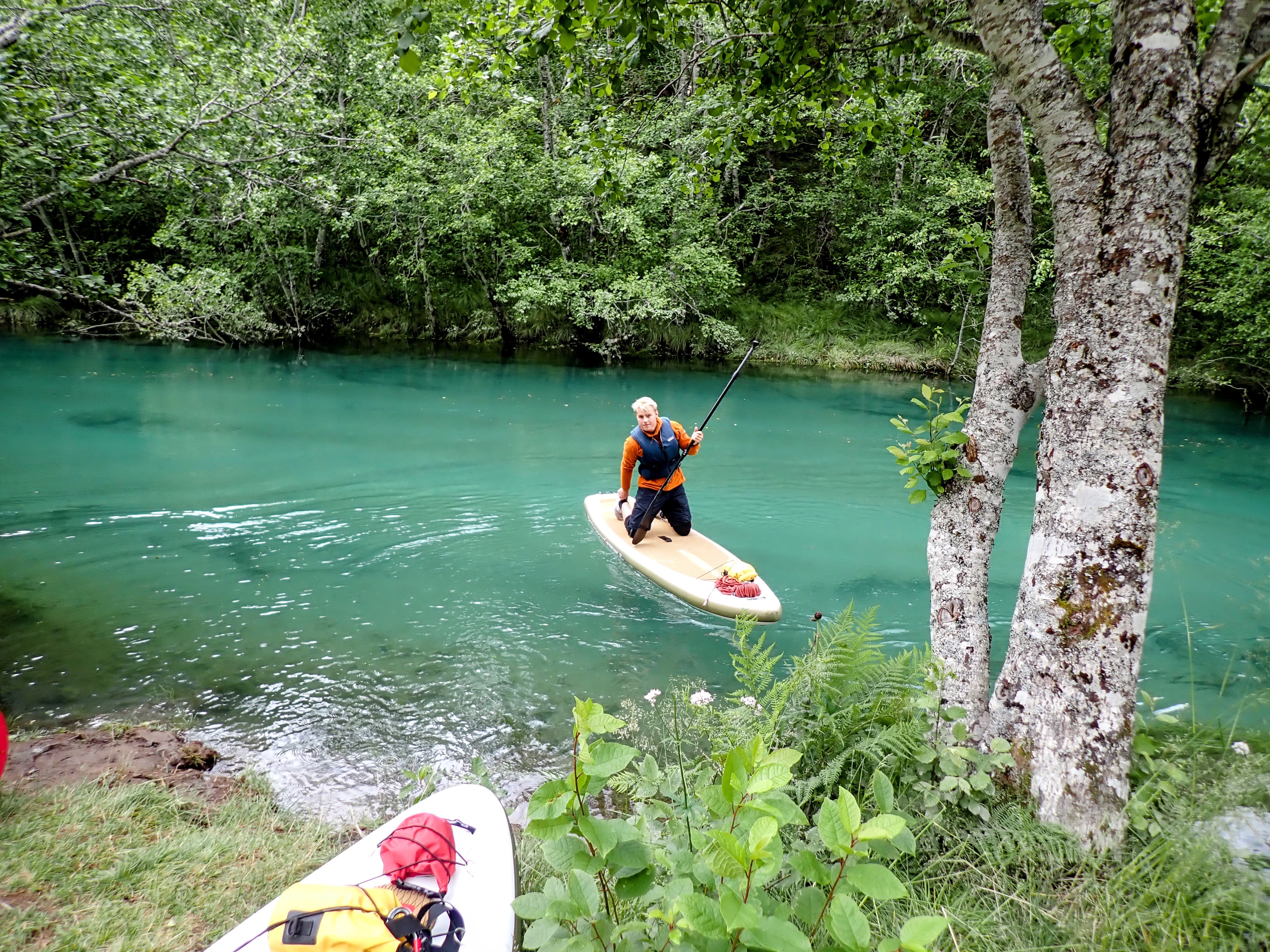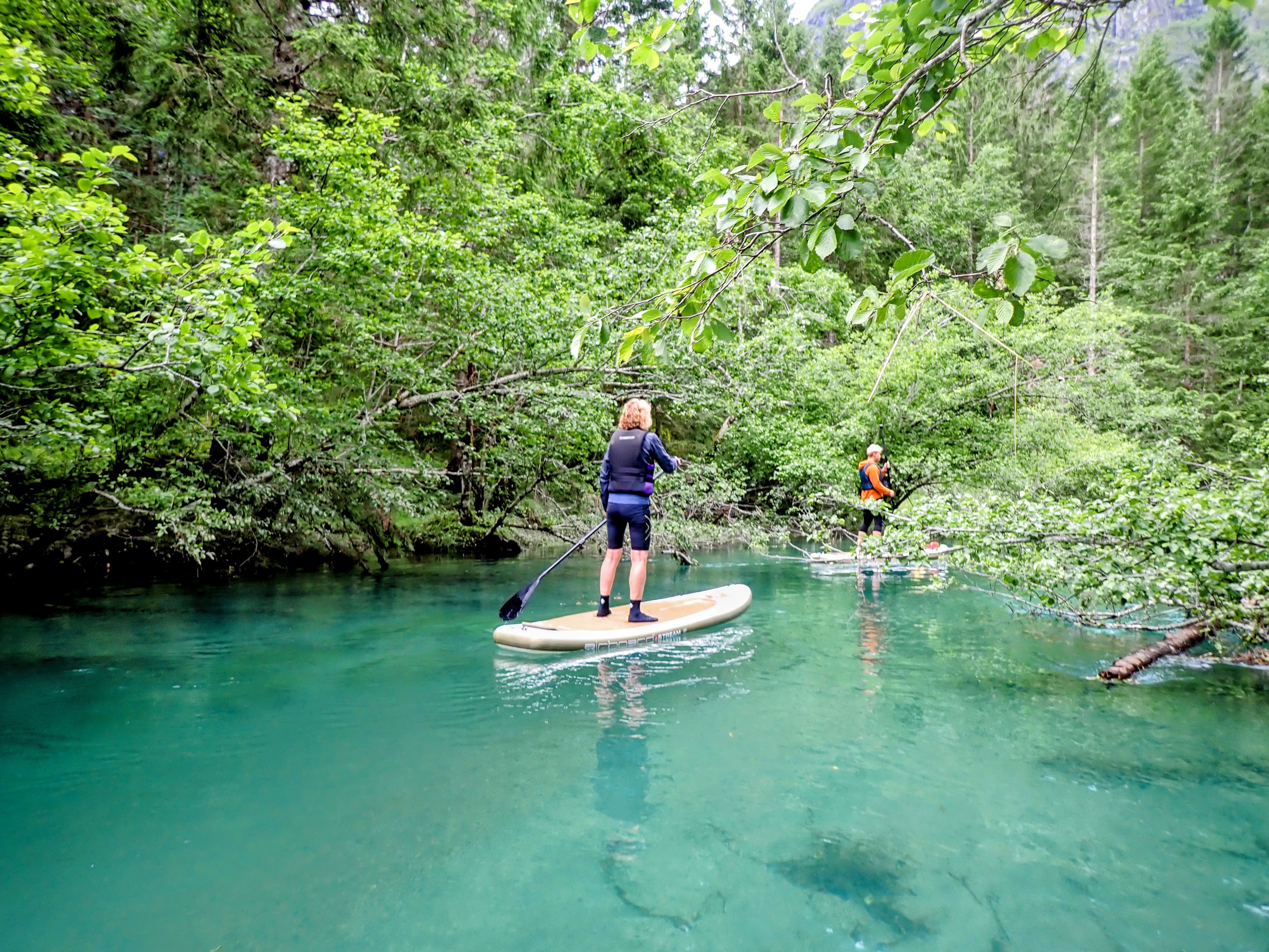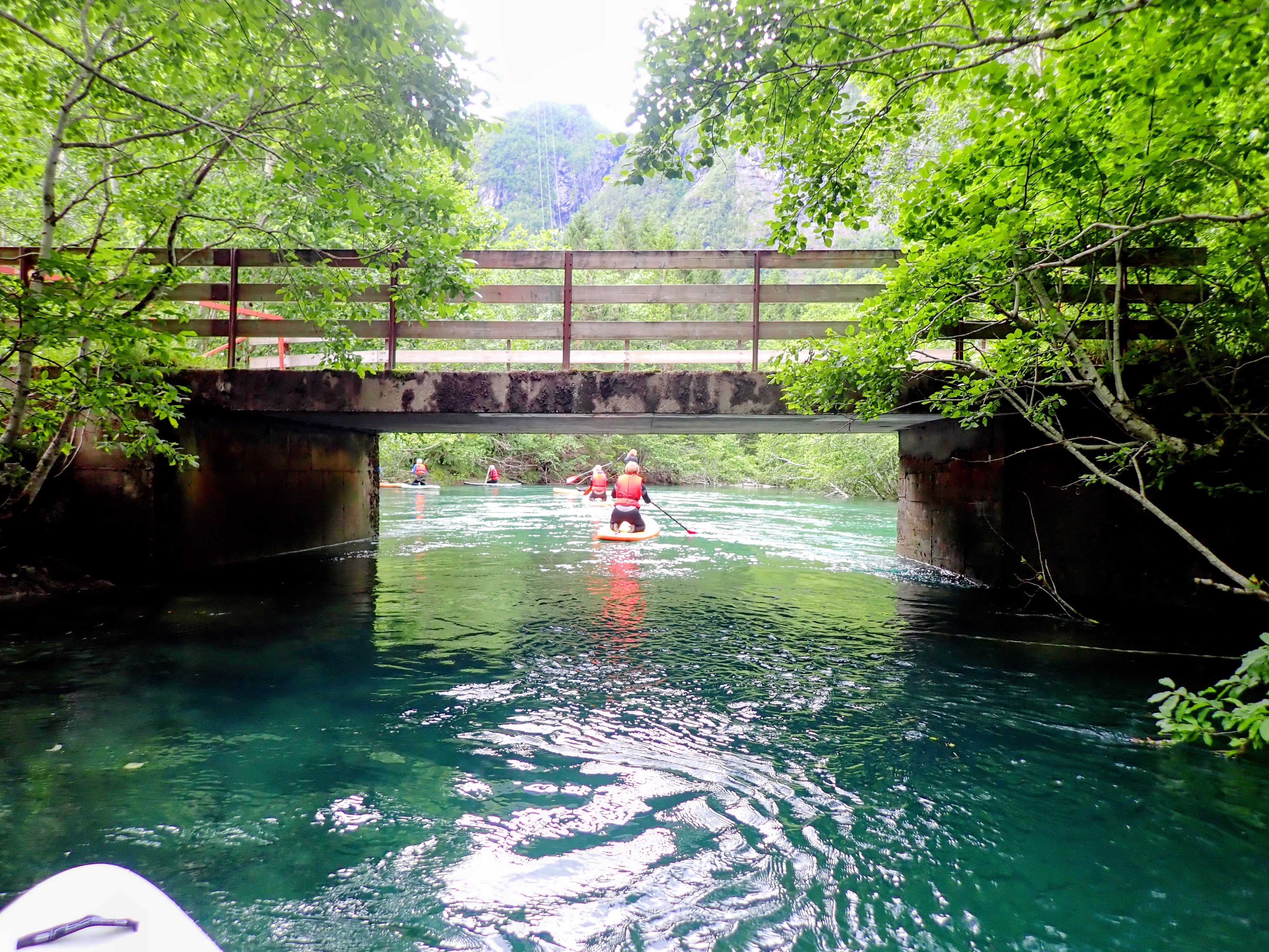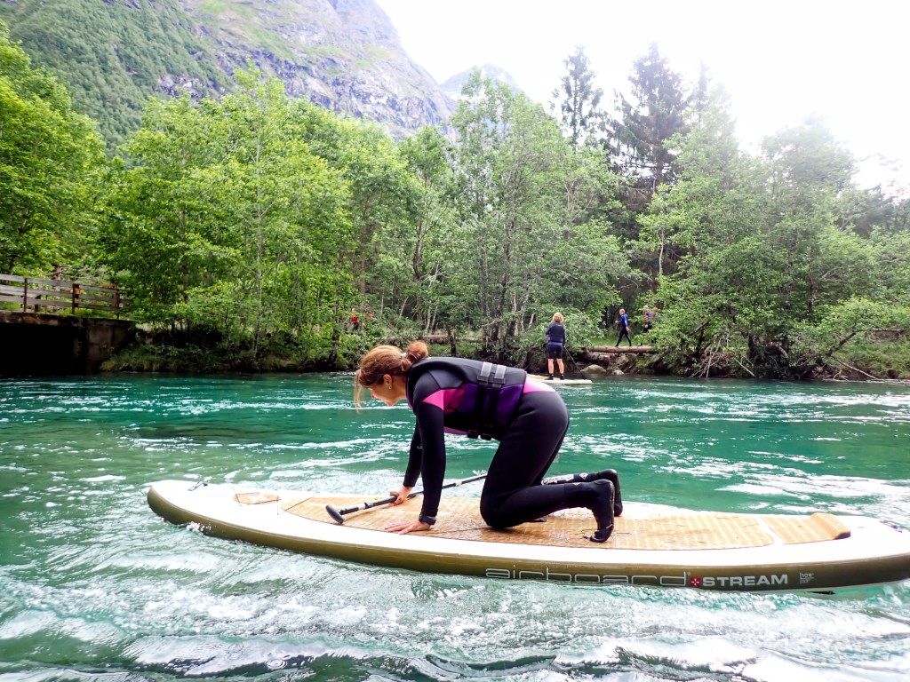 Vel utpå starter de fleste med å stå på knærne på brettet. Det er kun én deltager med som har gjort dette før og som til og med takket nei til våtdrakt. Hun og guidene står på brettet. Vi andre holder oss til lavt tyngdepunkt. Jeg kjenner kreftene i vannet og må ta skikkelig i for å klare å padle motstrøms. Og hvert tak truer med å sende meg hodestups i vannet. Spennende!