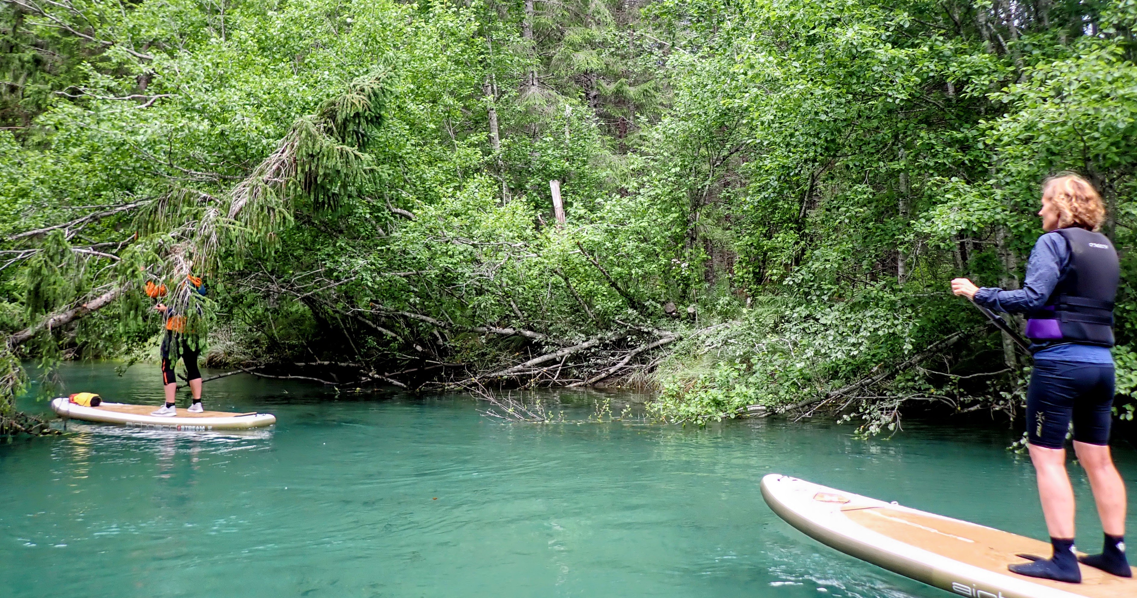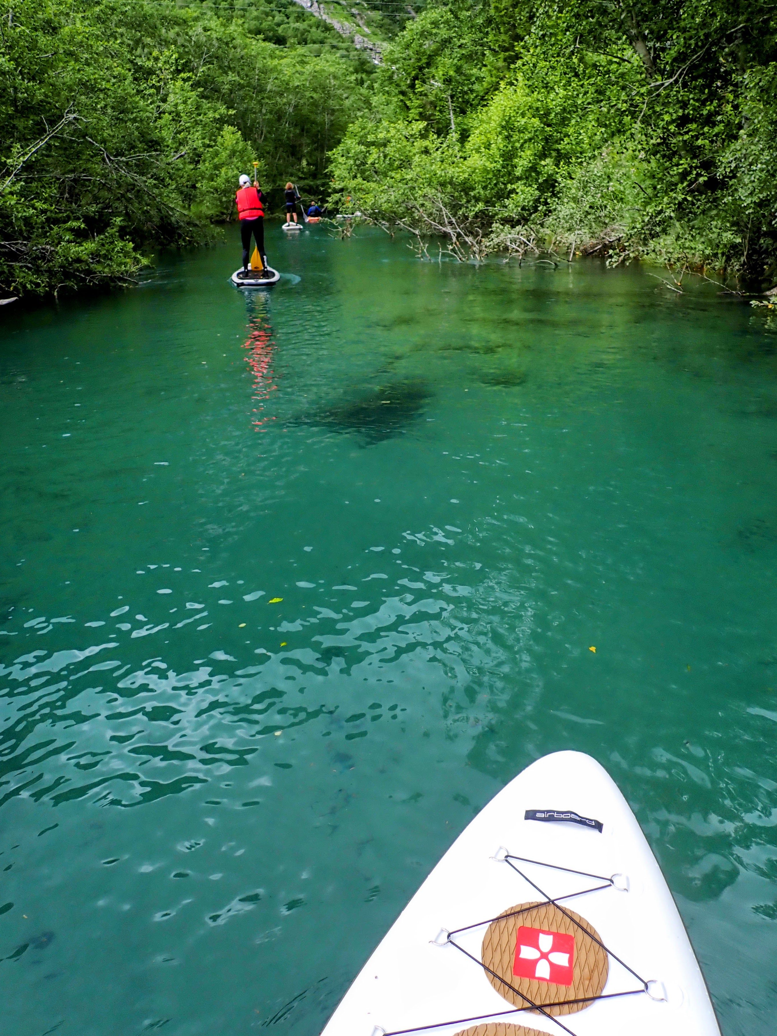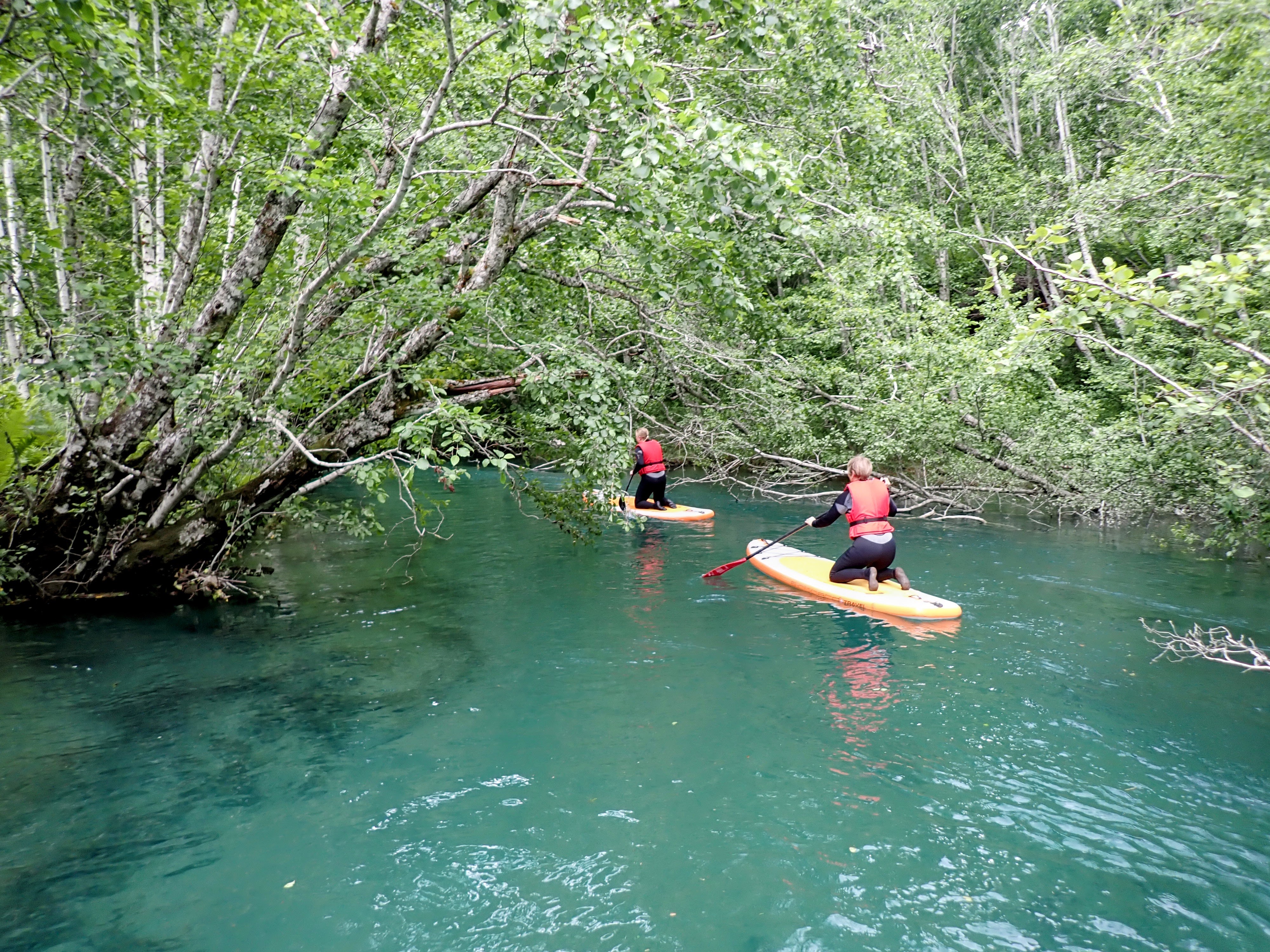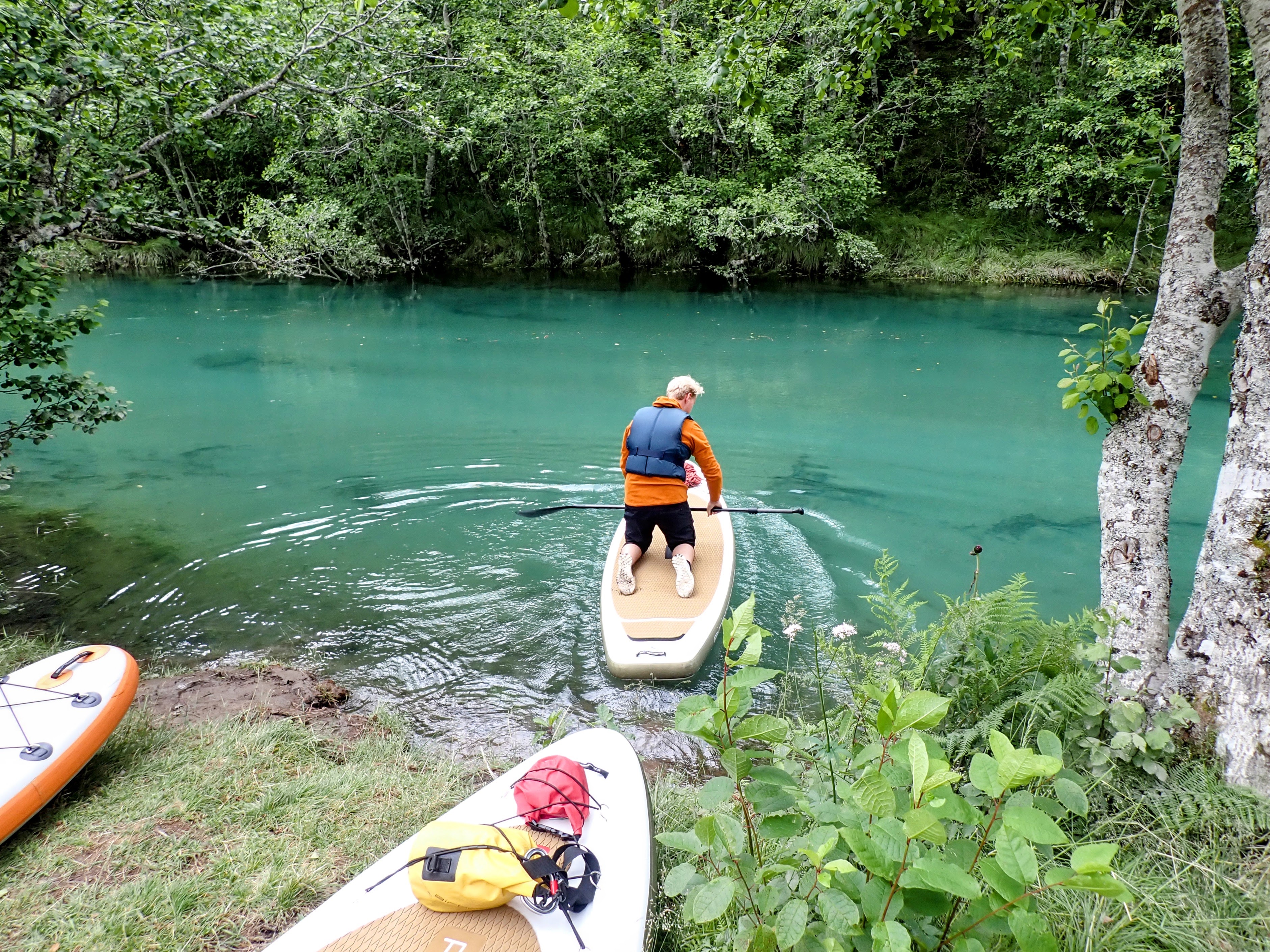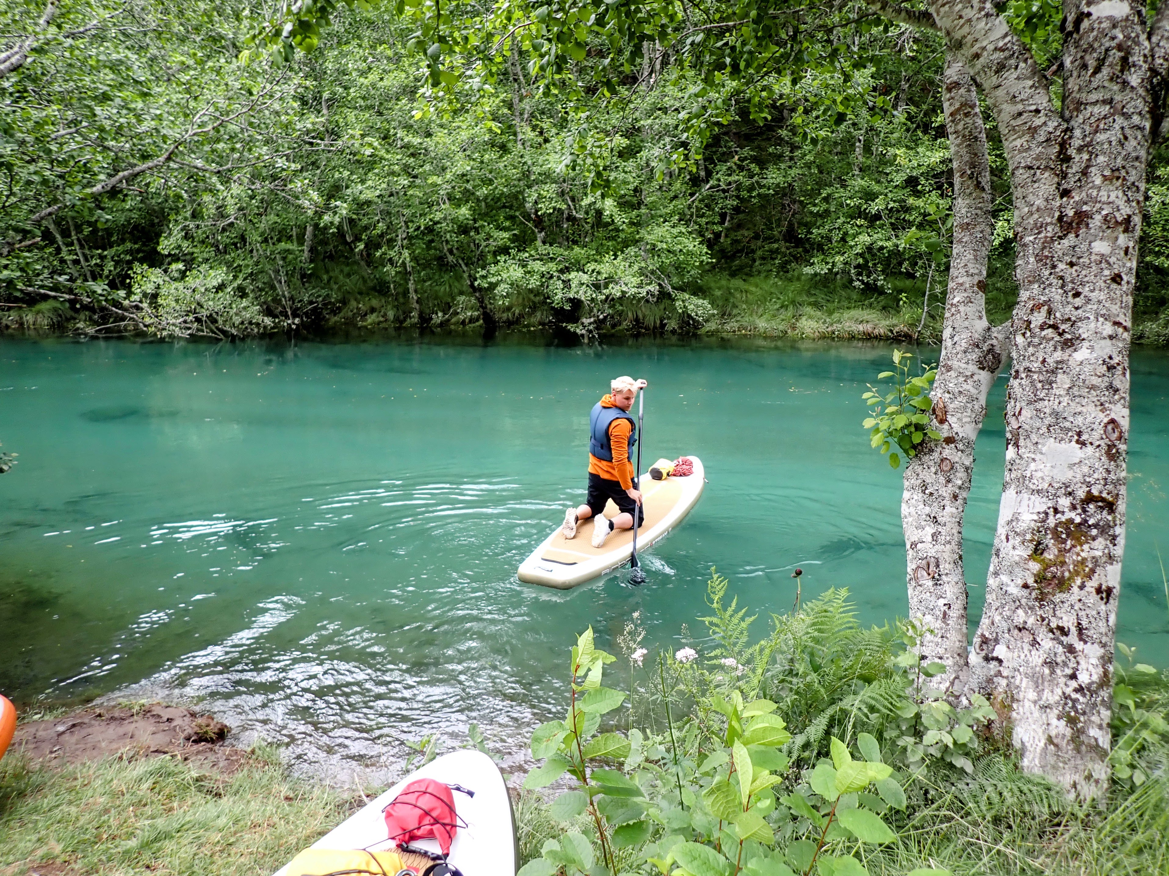 Vel utpå starter de fleste med å stå på knærne på brettet. Det er kun én deltager med som har gjort dette før og som til og med takket nei til våtdrakt. Hun og guidene står på brettet. Vi andre holder oss til lavt tyngdepunkt. Jeg kjenner kreftene i vannet og må ta skikkelig i for å klare å padle motstrøms. Og hvert tak truer med å sende meg hodestups i vannet. Spennende!