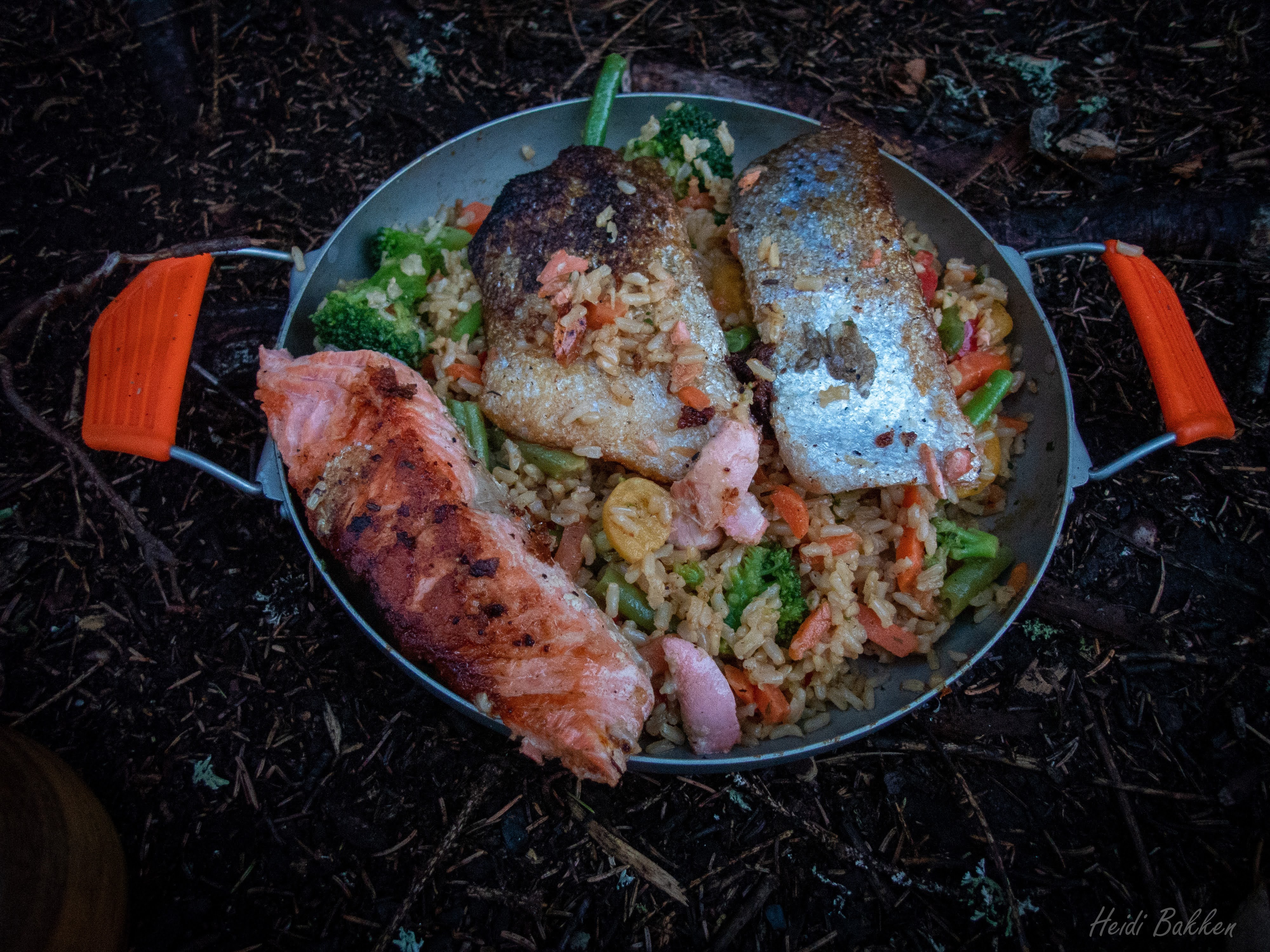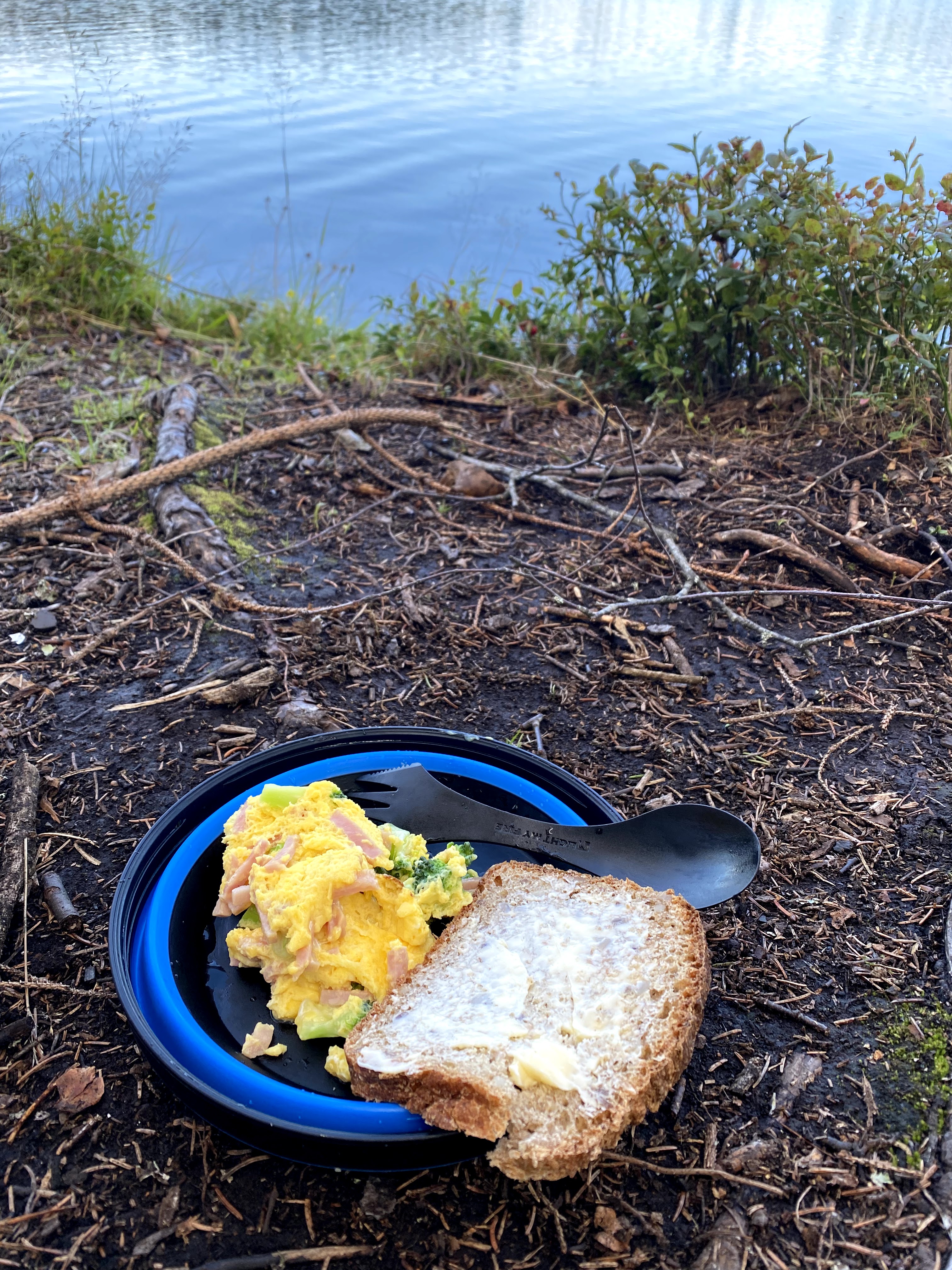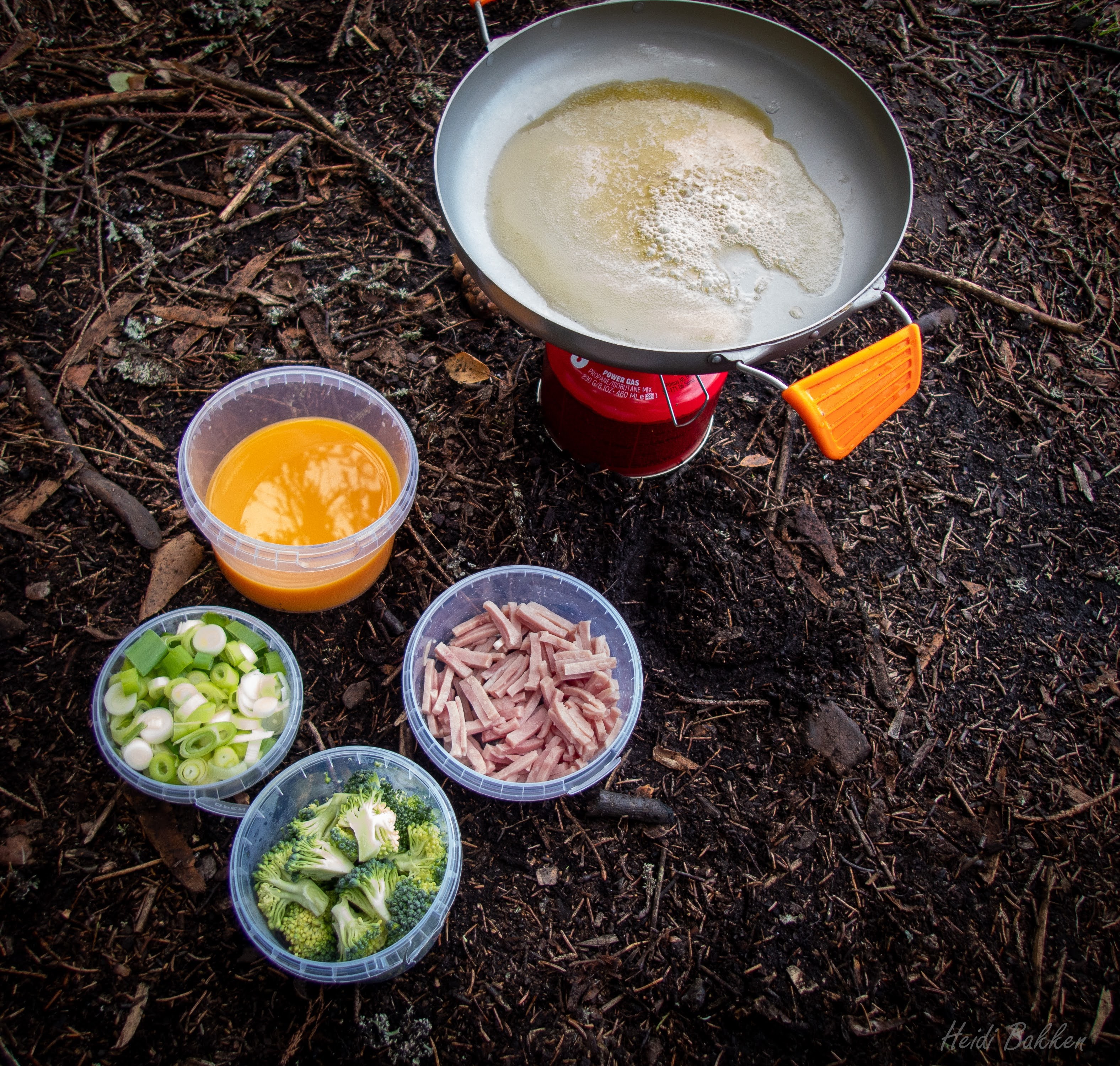 Frokosten ble inntatt rundt bålet. Noen var betraktelig mer avanserte enn andre. Det var bacon og eggerøre, fruktsalat, havregrøt, pour-over kaffe og god stemning.