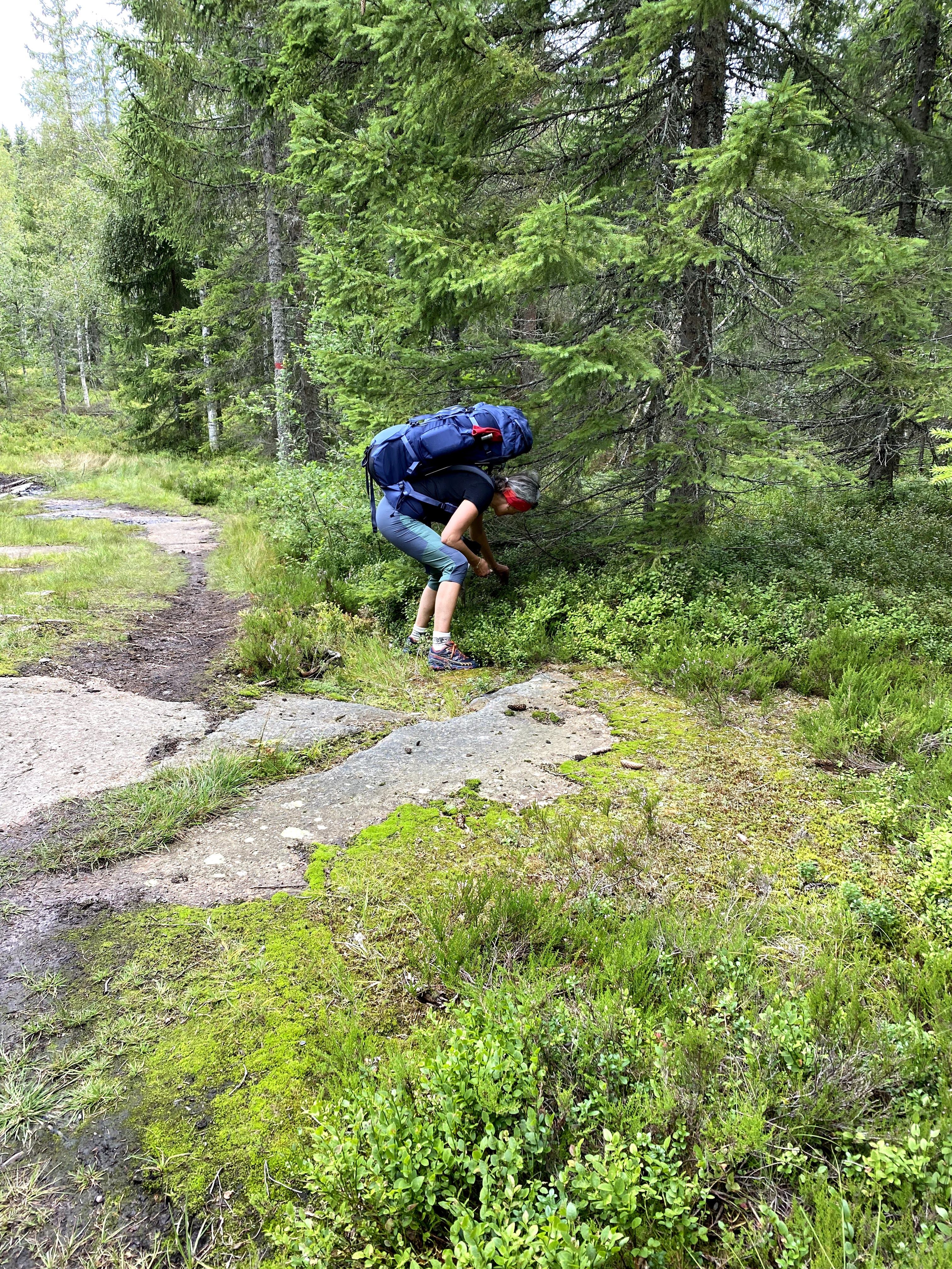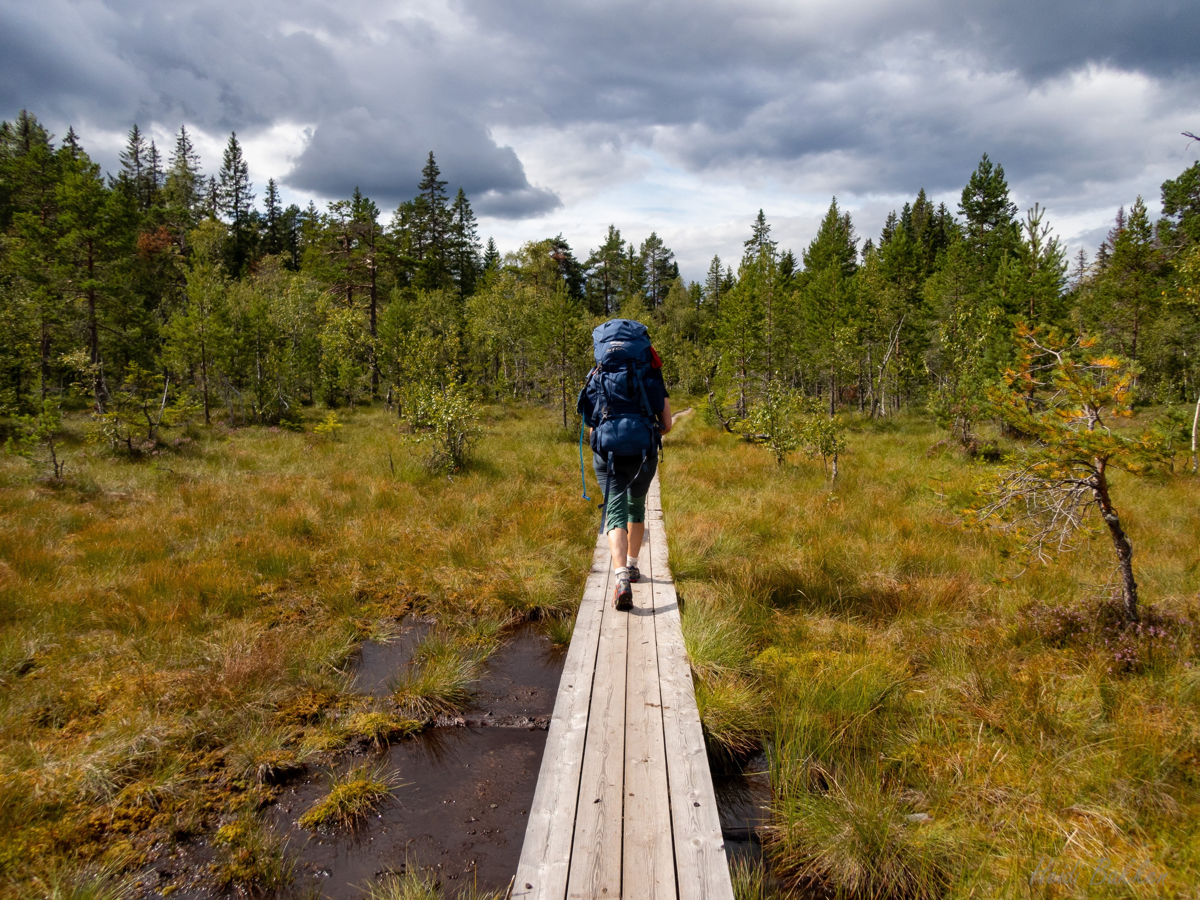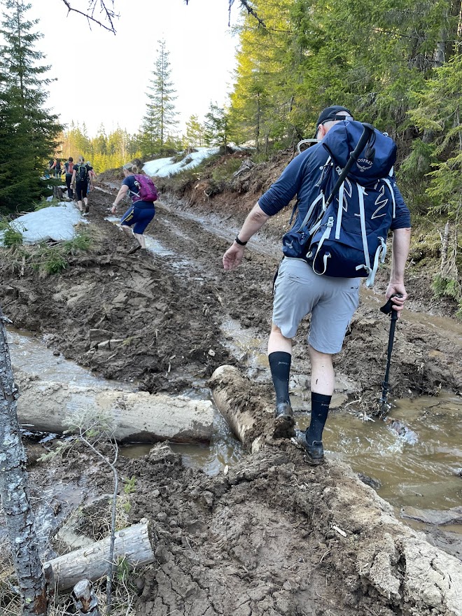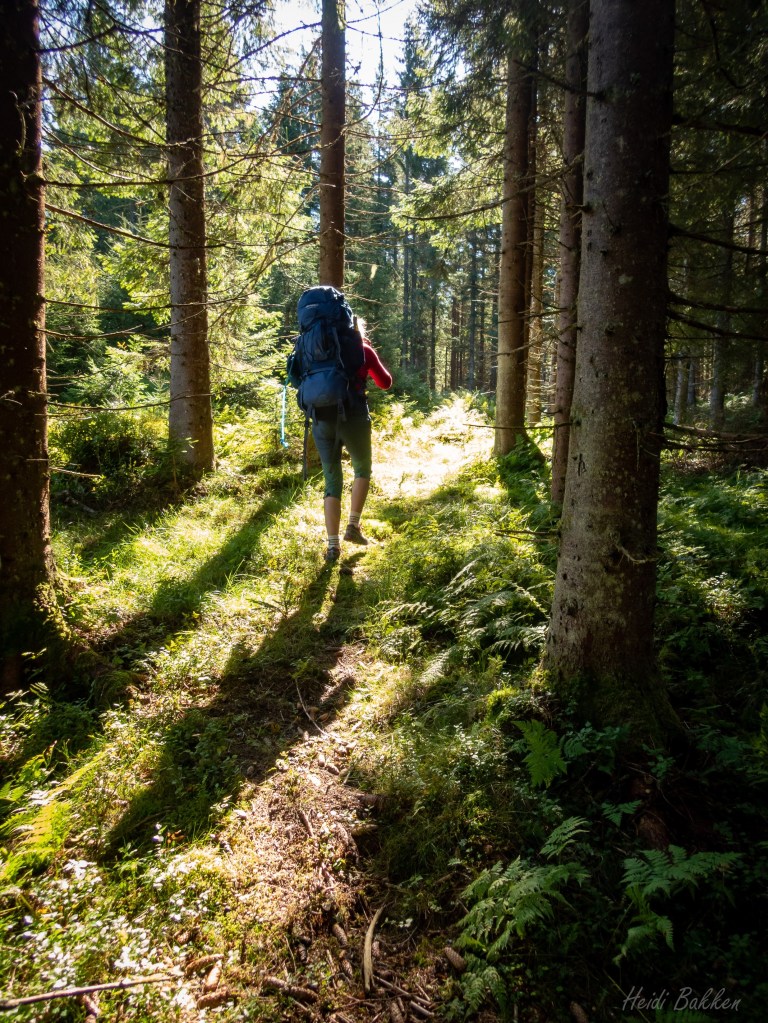 Veien vi går er ikke måkt, men vi går i smale hjulspor. Jeg balanserer like elegant som en mannequin på catwalken med en fot foran den andre. Eventuelt sjangler jeg fremover mens jeg prøver å holde meg på beina med 22kg bred last på ryggen, glatte sko uten pigger og avslått hodelykt.