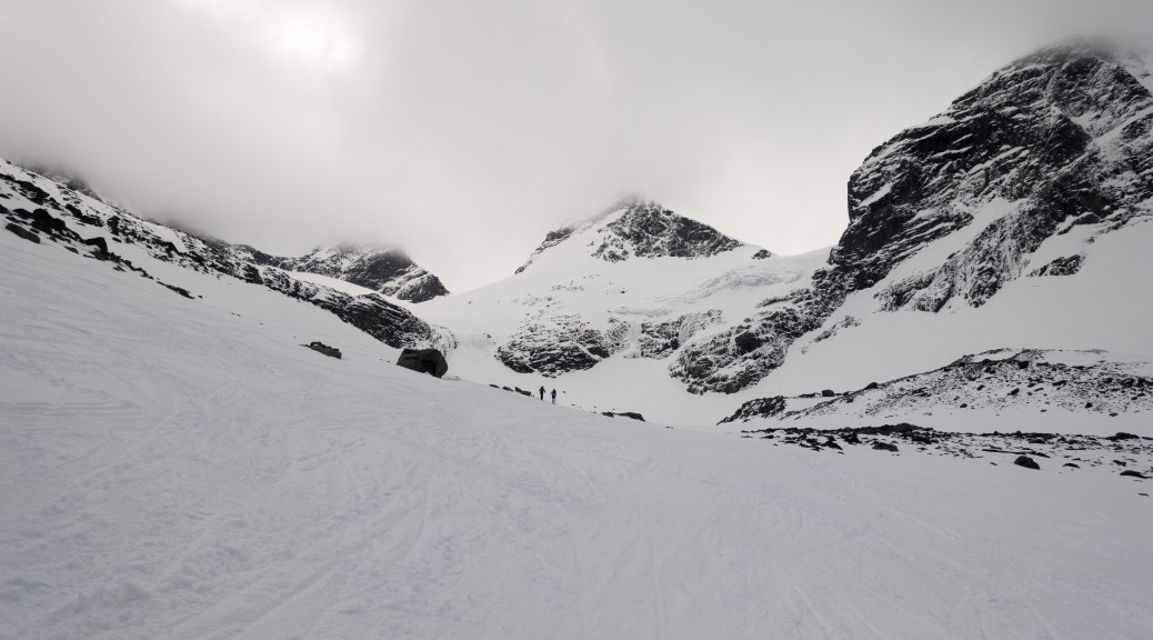 Da vi gikk innover hadde vi hele tiden utsyn mot målet, som ble mer og mer innhyllet i en stor og kraftig sky. I tillegg hadde det vært veldig mildt dagen før og ned mot -10 om natten så underlaget var steinhardt og skavlete. Jo lenger inn i dalen vi kom, dess kaldere og mer trekkfult ble det. Jeg begynte å kjenne på følelsen av at dette ikke akkurat var drømmeturen. Så da vi kom til innsteget på breen og så vi at de foran oss enten hakket seg vei opp innerst i brefallet og at de som valgte å skrå oppover i fjellsiden under Dyrhaugsryggen møtte en isete og veldig bratt fjellside bestemte jeg meg.