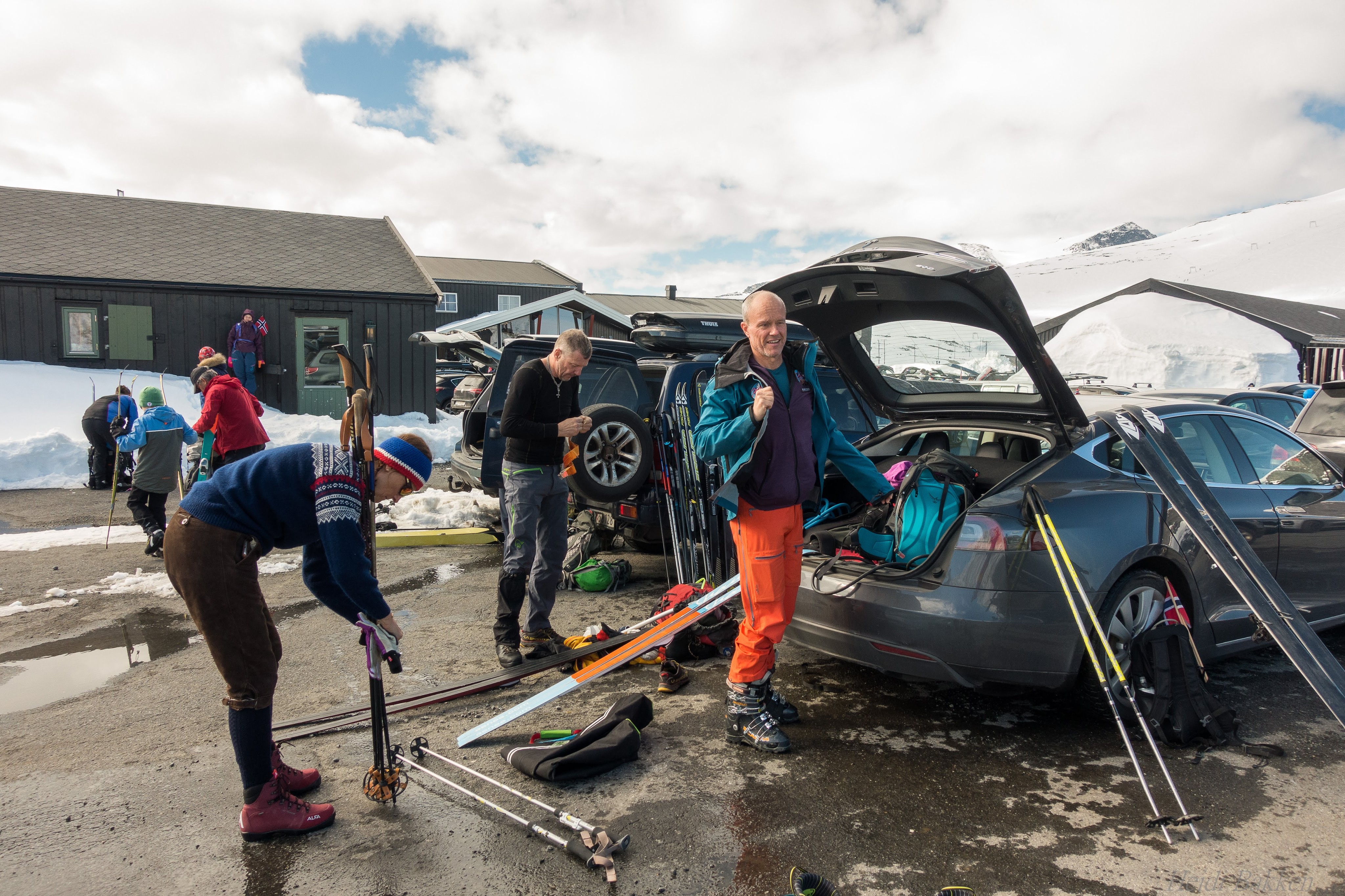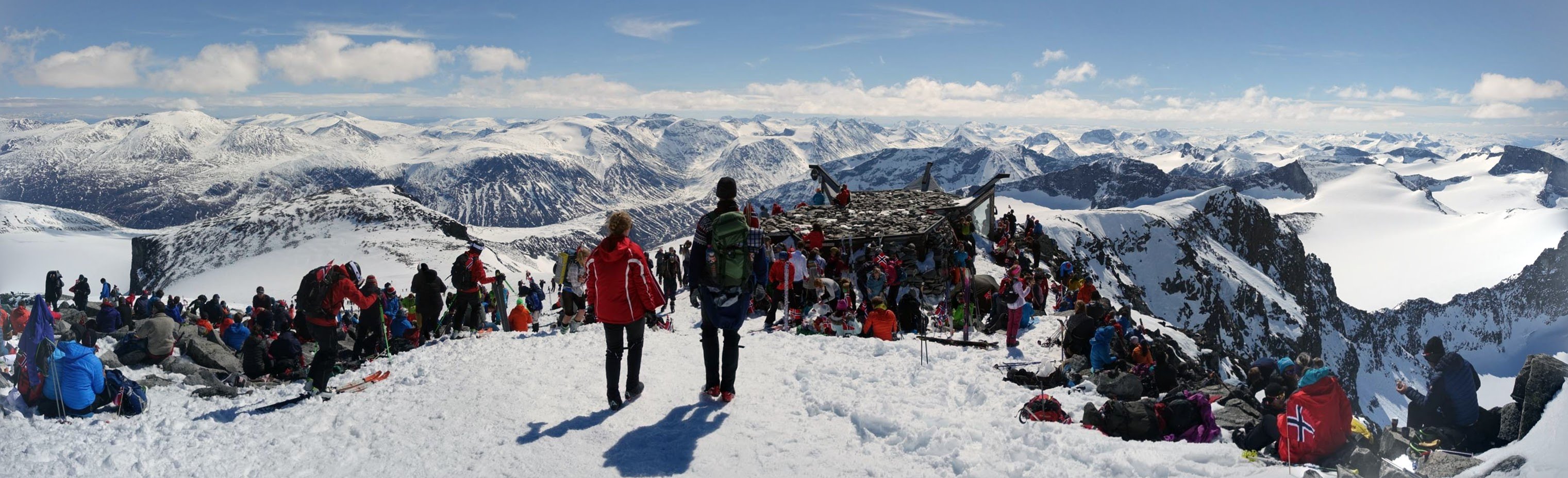 Vel fremme ved Juvasshytta gjør vi oss klare til avmarsj. Galdhøpiggen kan skimtes i bakgrunnen.
