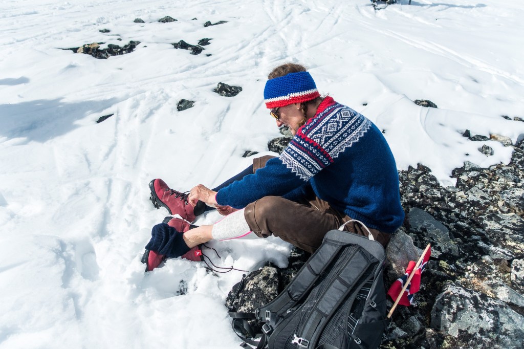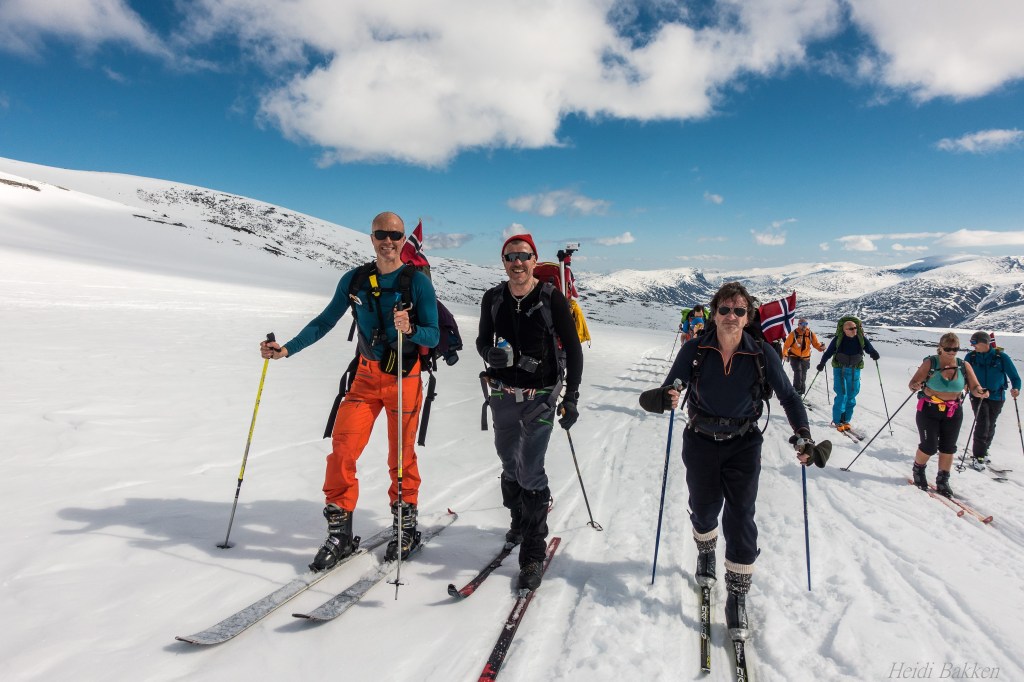 Vi valgte å gå turen fra Juvasshytta som er den letteste veien til Norges høyeste fjell, Galdhøpiggen (2469 moh). Turen opp er på ca 5 km og i underkant av 700 høydemeter. For å krysse Styggebreen må man om sommeren ha guide og gå i tau om man ikke selv er bre-kyndig. Om vinteren – eller for eksempel på 17. mai 2019 – er ikke det nødvendig. Sjekk uansett med lokalkjente før du begir deg avgårde på egenhånd. Det kan være sprekker som er nye av året.