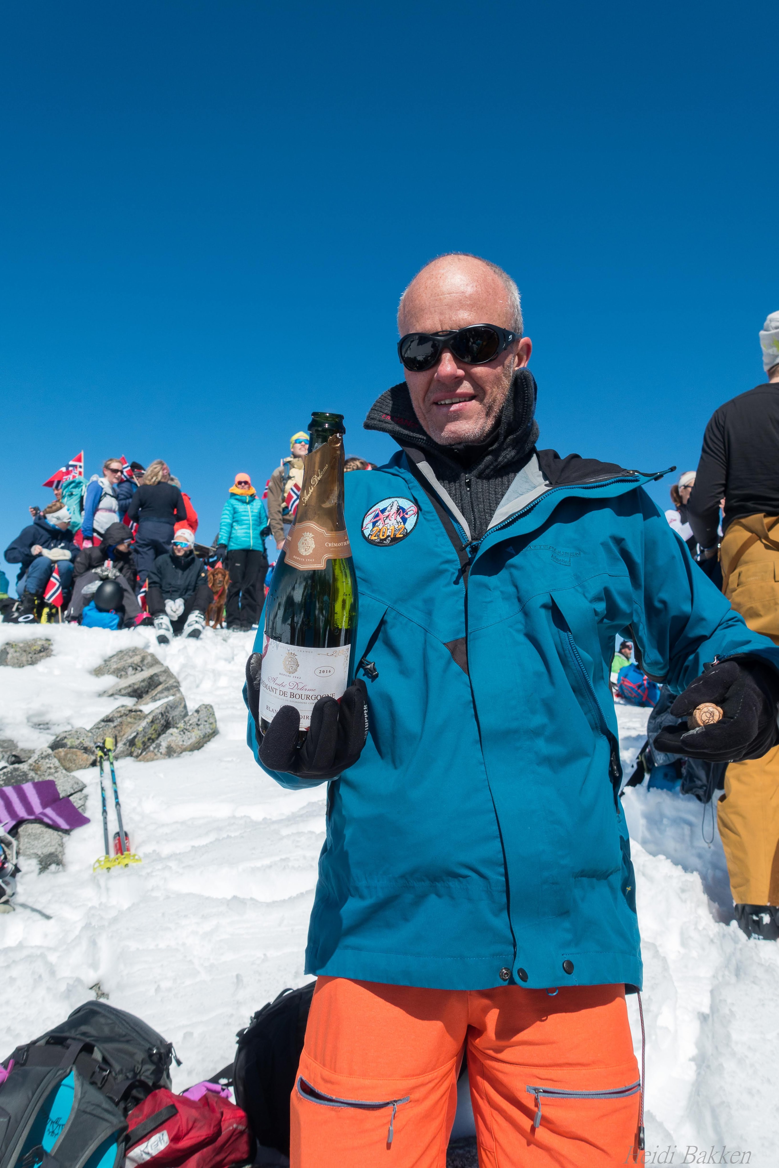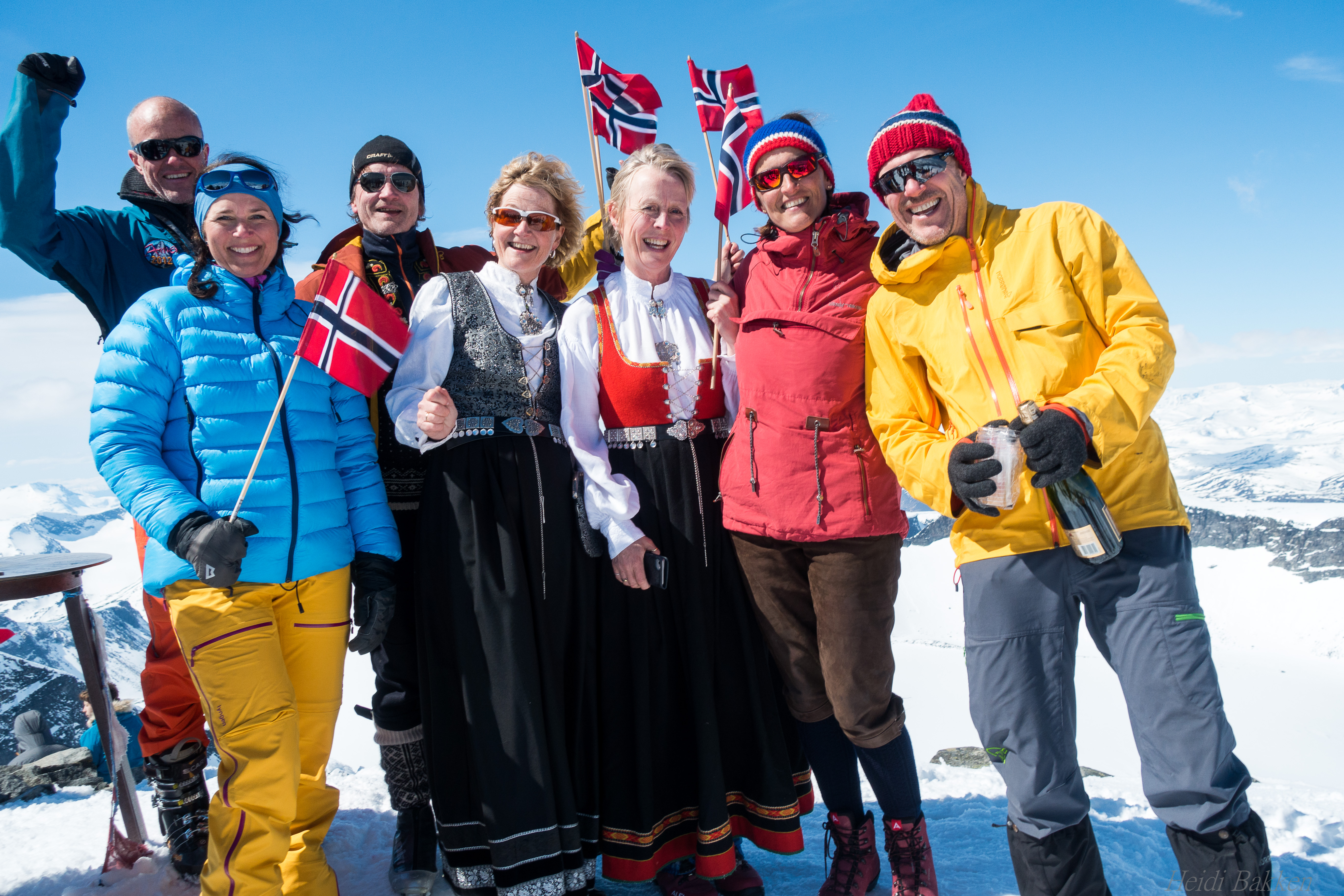 På toppen var det veldig god stemning! Nasjonalsangen ble sunget 2 ganger – den ene gangen akkompagnert av en trompetspiller. Det var folk i bunad, med dress, i nikkers og lusekofte og i sukkertøyfargede gortex klær. Det ble skålet i Champagne, spist sjokoladekake, nistemat, kransekake og grillmat. Det ble ropt 3 x 3 hurra! Det vil si, akkurat det gikk ikke så veldig bra, men vi skal alle ha for forsøket. Vanskelig å bli helt synkronisert i høyden.