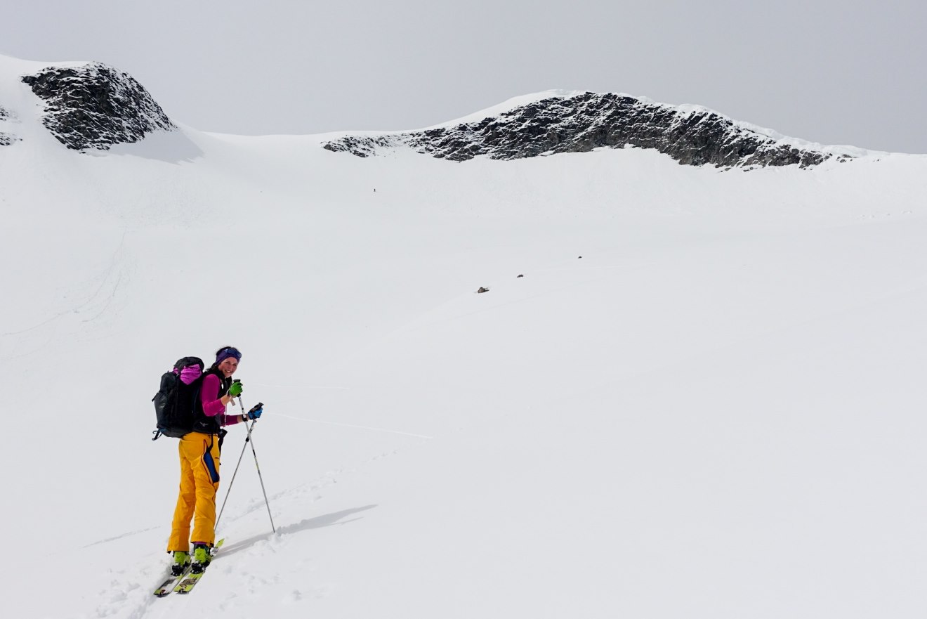 Da syklene var parkert og vi hadde rigget fra sykkelmodus til skimodus, lå fjellet der foran oss. Fullstendig uberørt. Ikke et skispor å se, ikke et menneske å se. Bare oss tre og et helt fjell for oss selv.