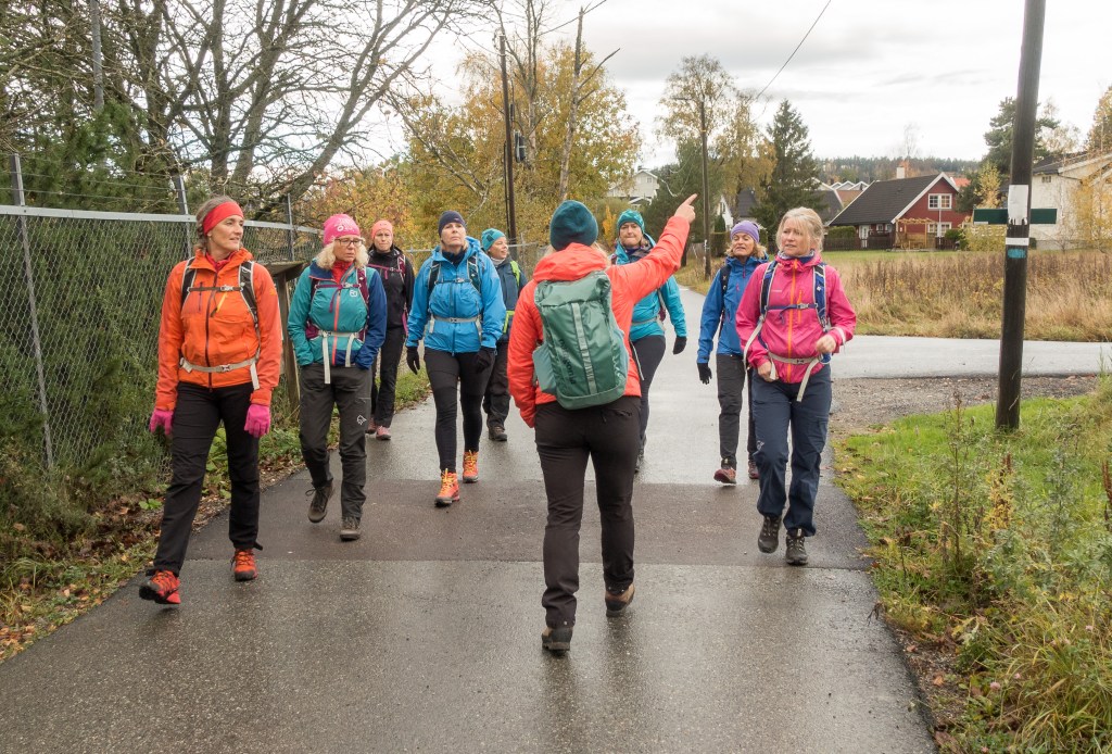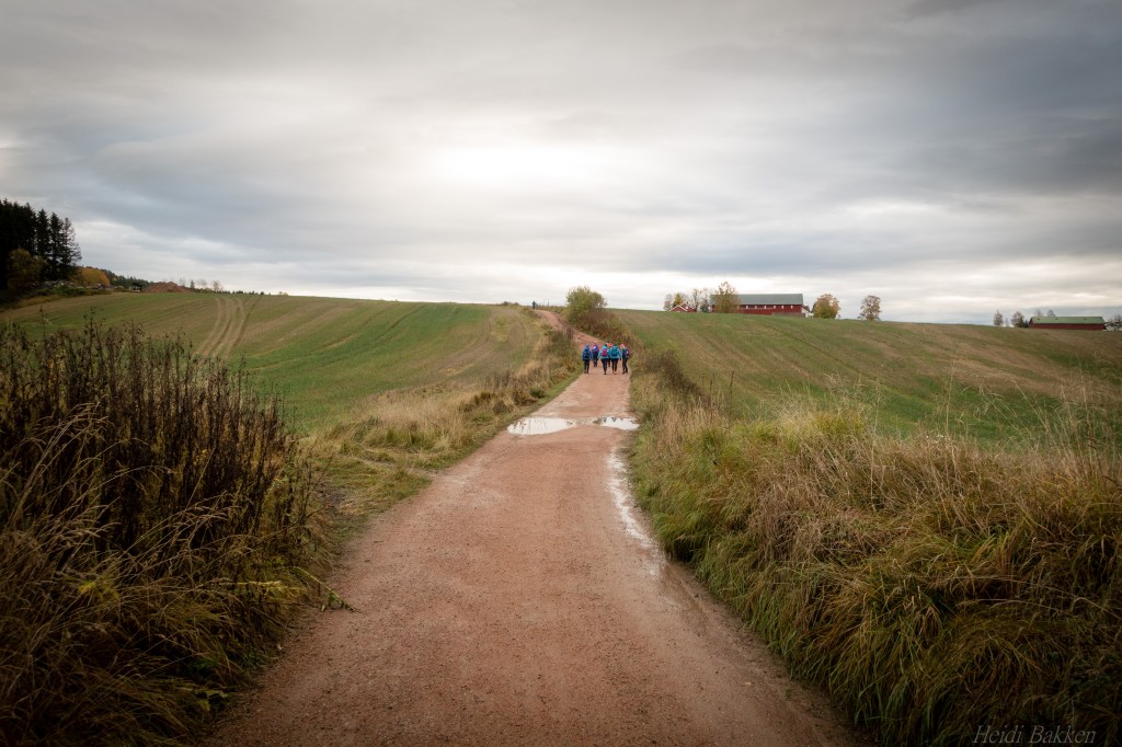 I en pause i bygene gikk vi av sted med 20 kg tung sekk på ryggen. Det tok ikke lang tid før været tok oss igjen. Regnponcho på.