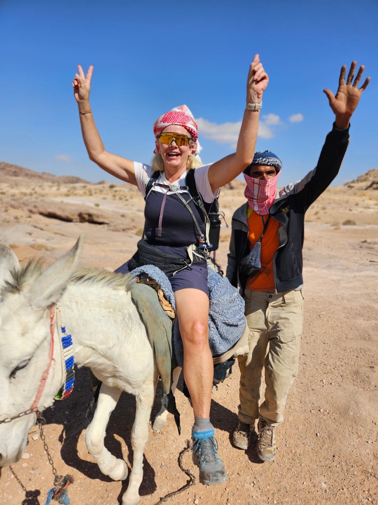 Det første Line gjør i Lille Petra er å tråkke skikkelig over. Akkurat når det ikke var esler lett tilgjengelig. Ikke isposer heller. Coca-cola fikk duge. Og en taxi. Vi andre trasket de siste kilometerene langs en vei og var veldig lykkelige da vi kom frem.
