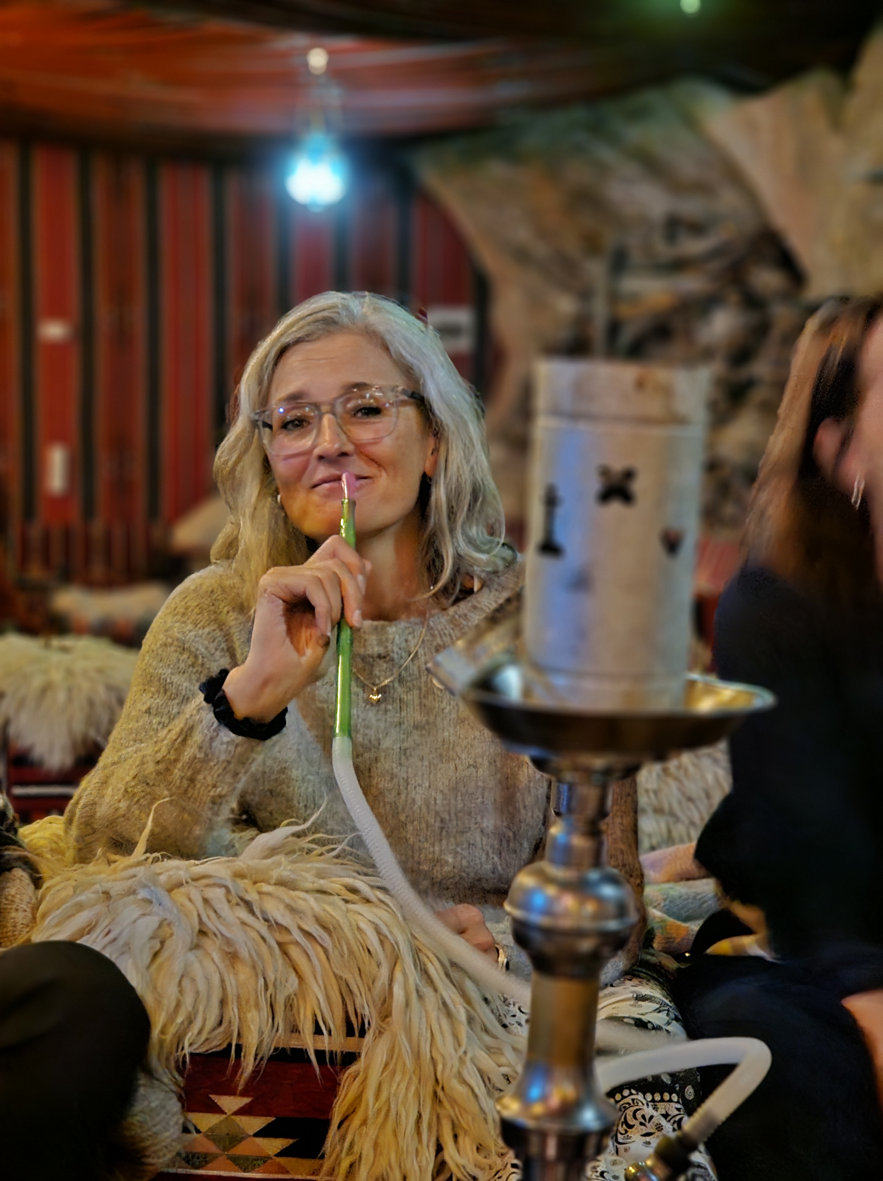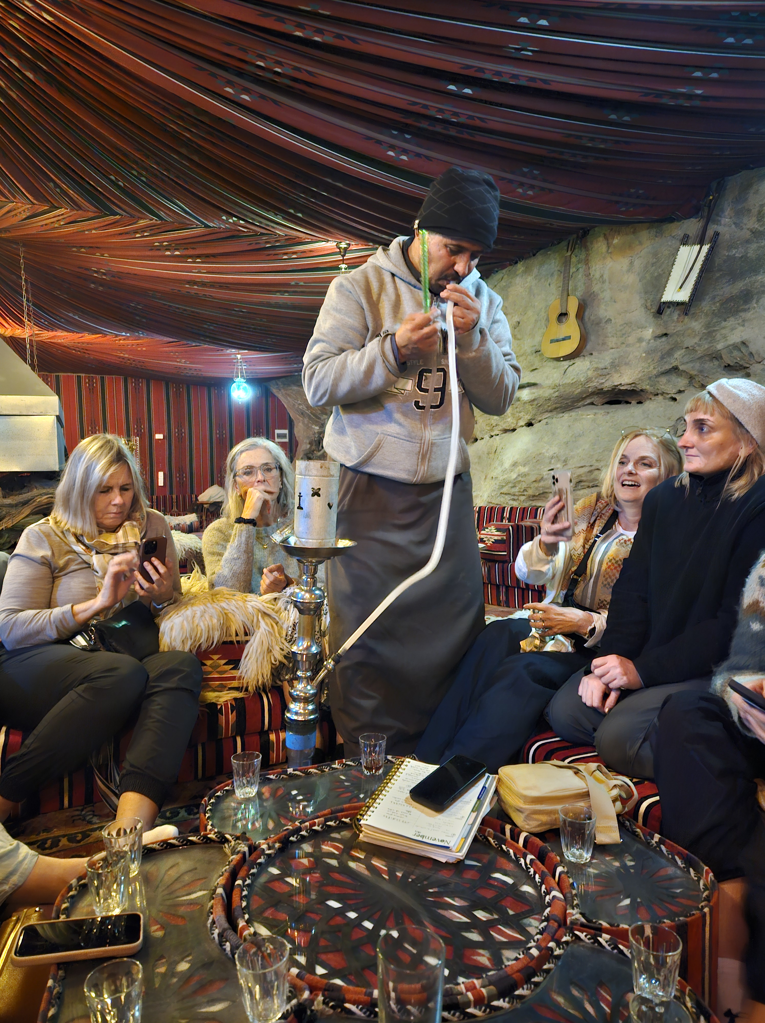 Etter nok en fortreffelig middag ble det en avslappende kveld. Gruppa var positivt preget av mange kilometer i beina, latter, sol og mange inntrykk. Det var god stemning, massasje for de heldige og vannpipe for de «modige».