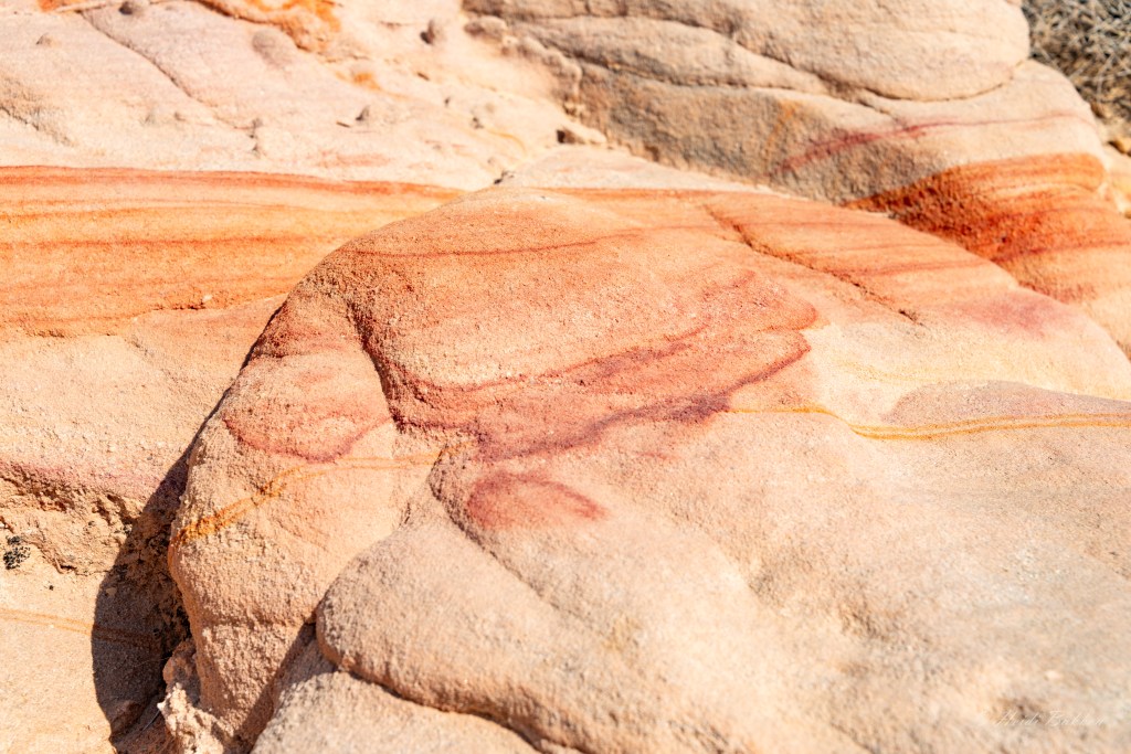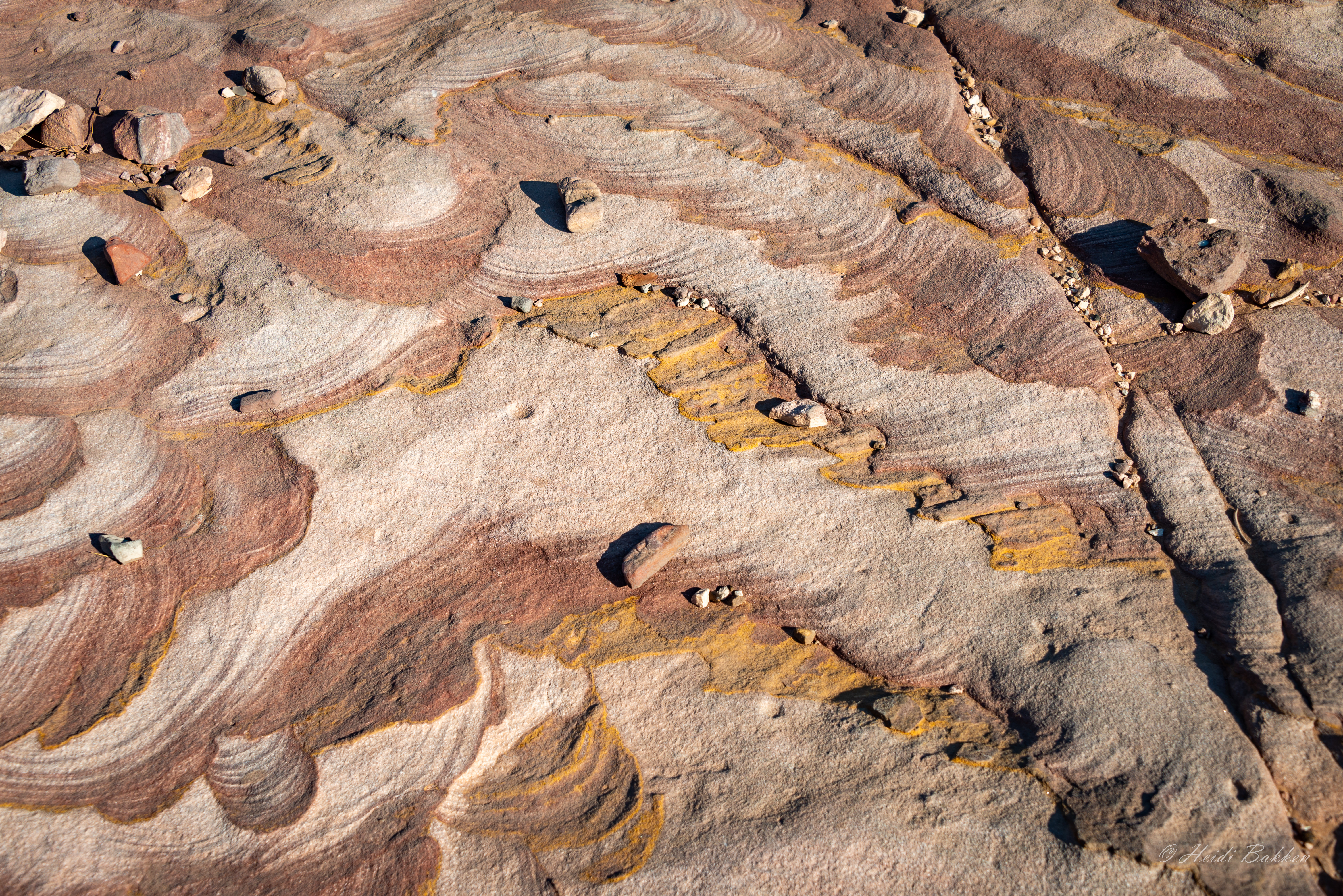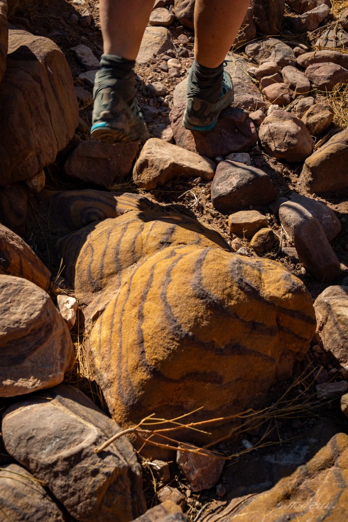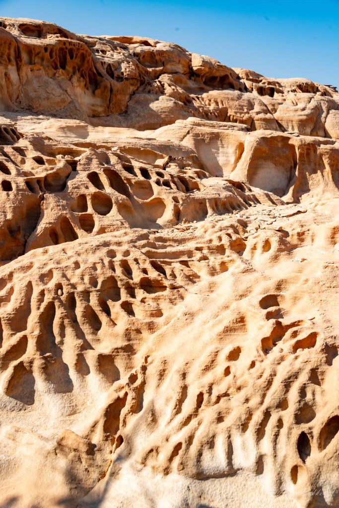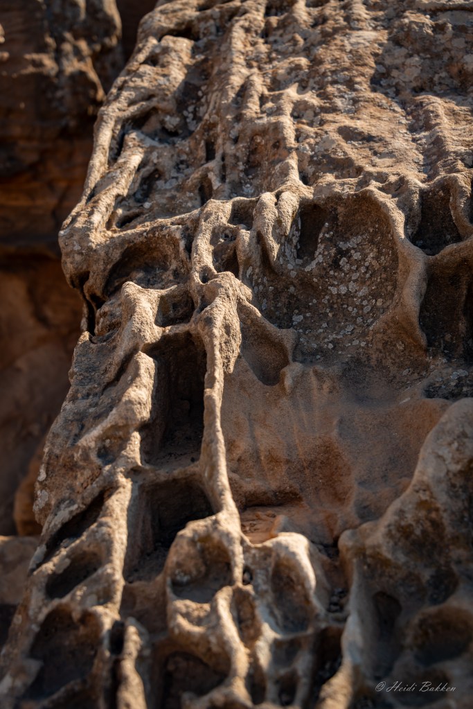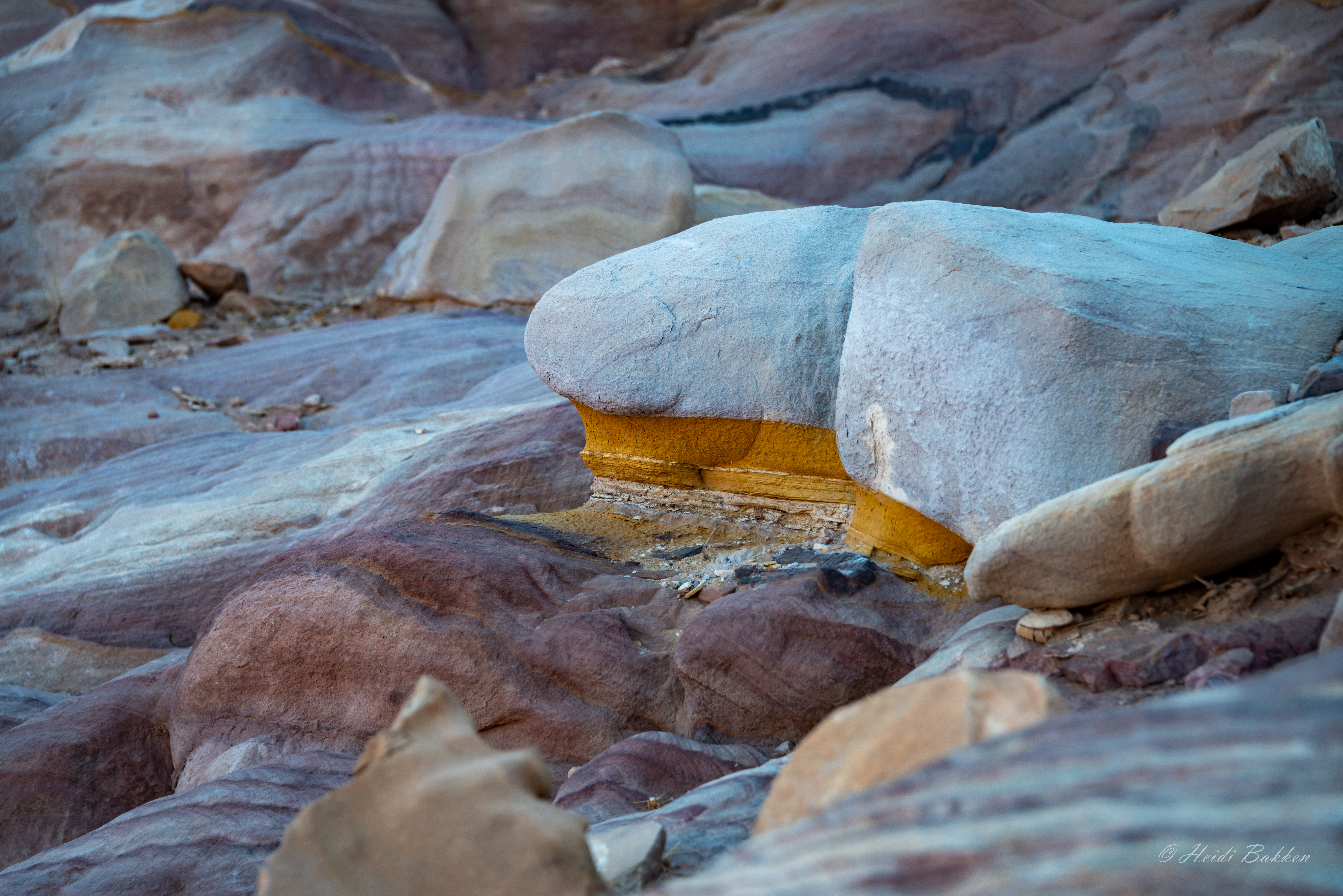 Videre herfra gikk vi gjennom partier med fantastiske farger på fjellet. Fargene kommer av de ulike mineralene som er i sandsteinen. Gult = sulfid, grå = jern + silica, bronse/lilla = kobber og jern, rød = jern, hvit = silica (silisiumoksid) og blå = magnesium. Her må noen som kan dette bedre gjerne korrigere meg. Guiden snakket fort på engelsk med arabisk accent. Noe kan ha blitt borte i oversettelsen. Uansett – akk så vakkert!