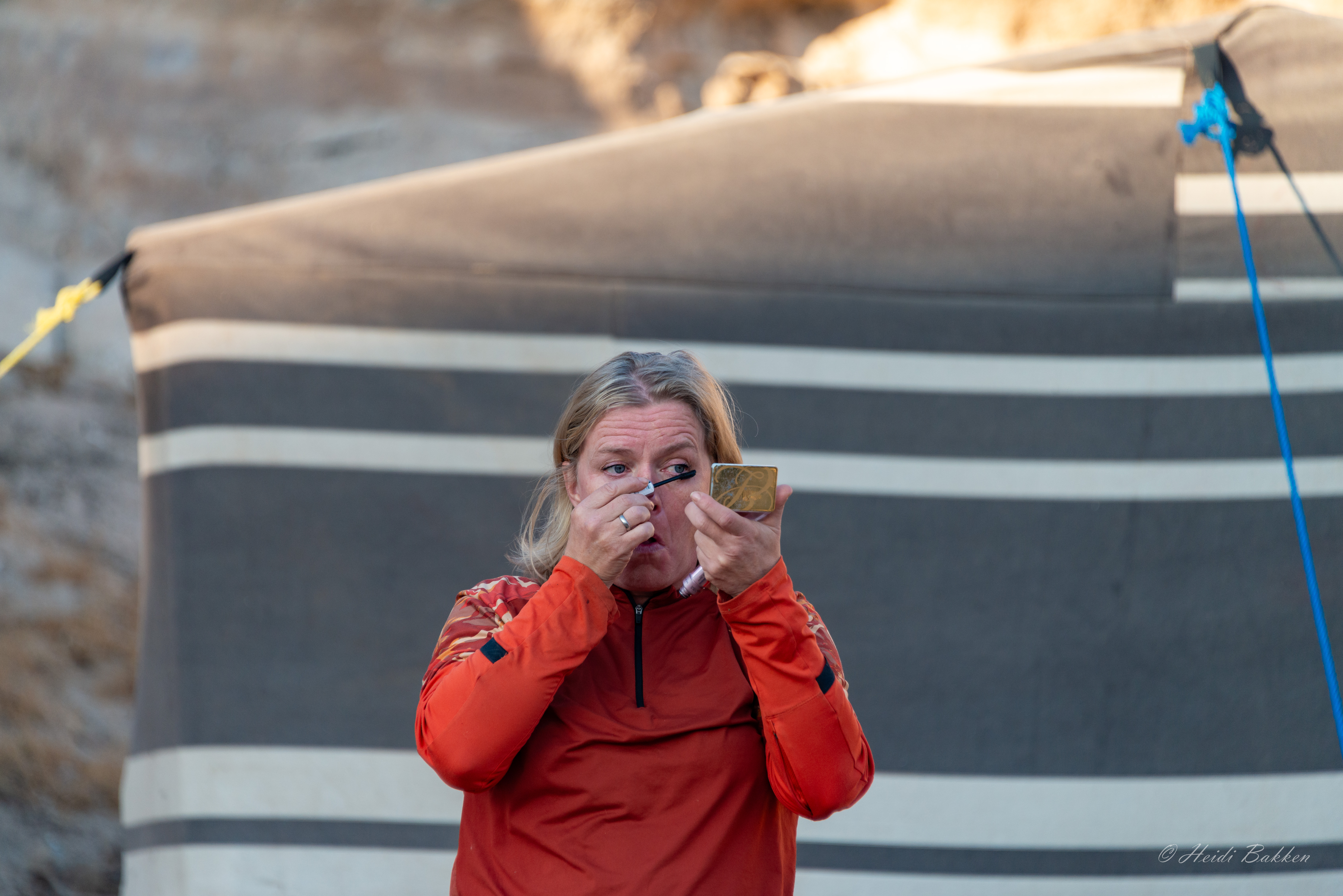 Det er god morgenstemning i campen; de sminkes, tøyes og bøyes, pakkes, pusses tenner – alt samtidig som campen rigges ned.