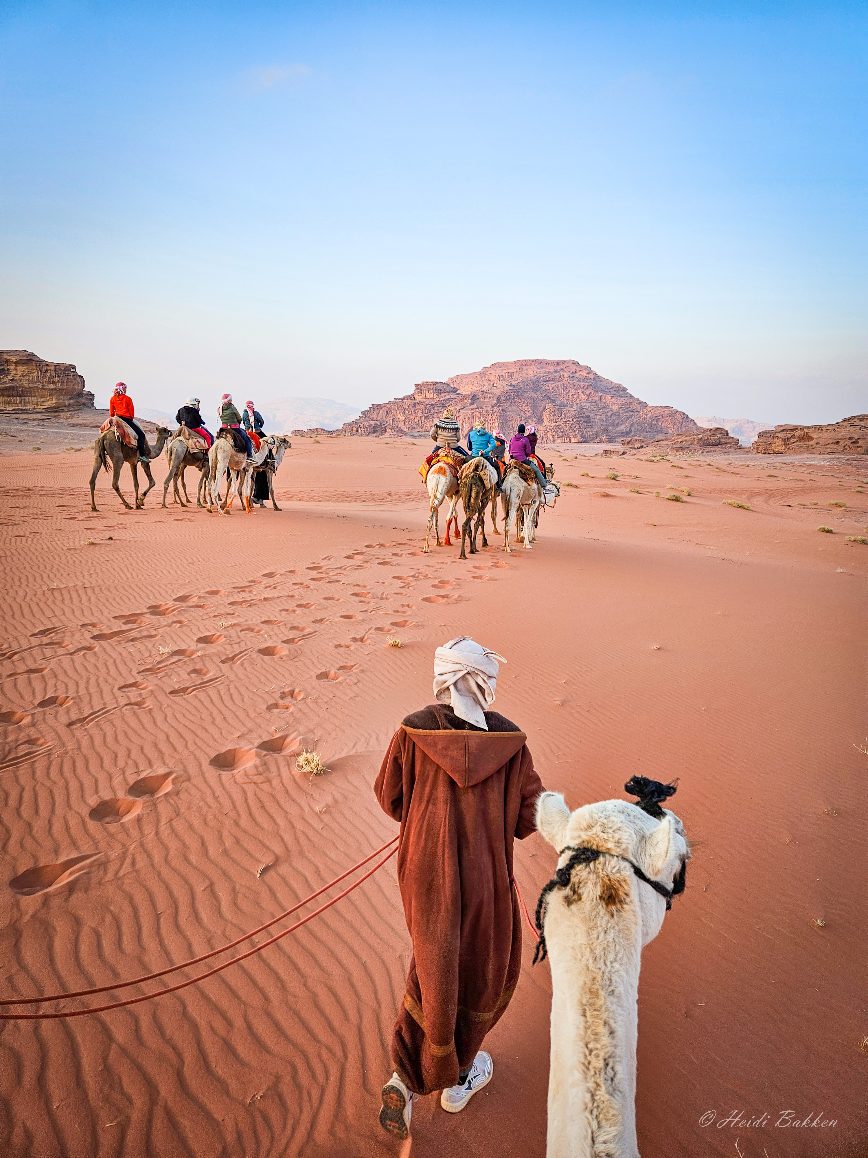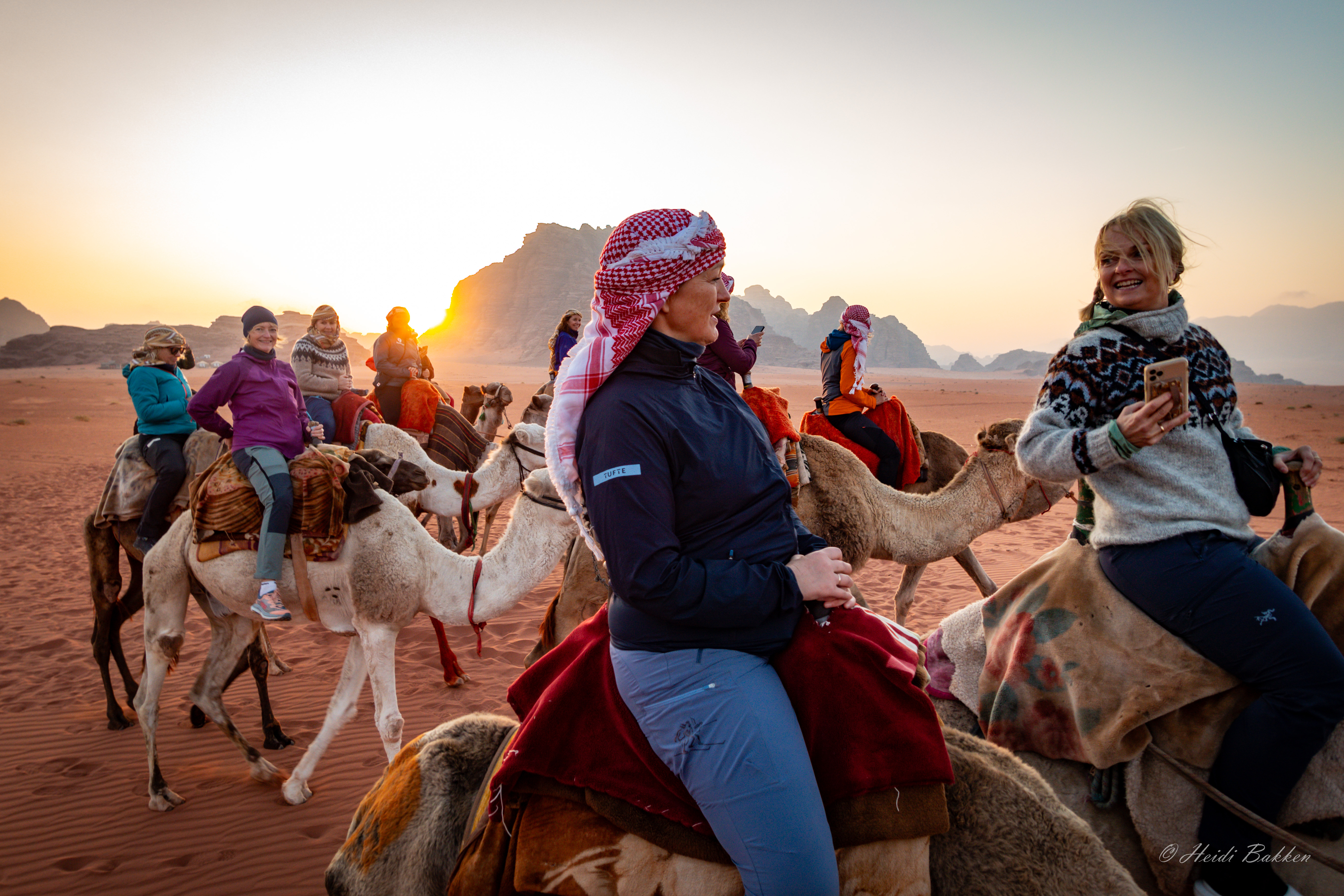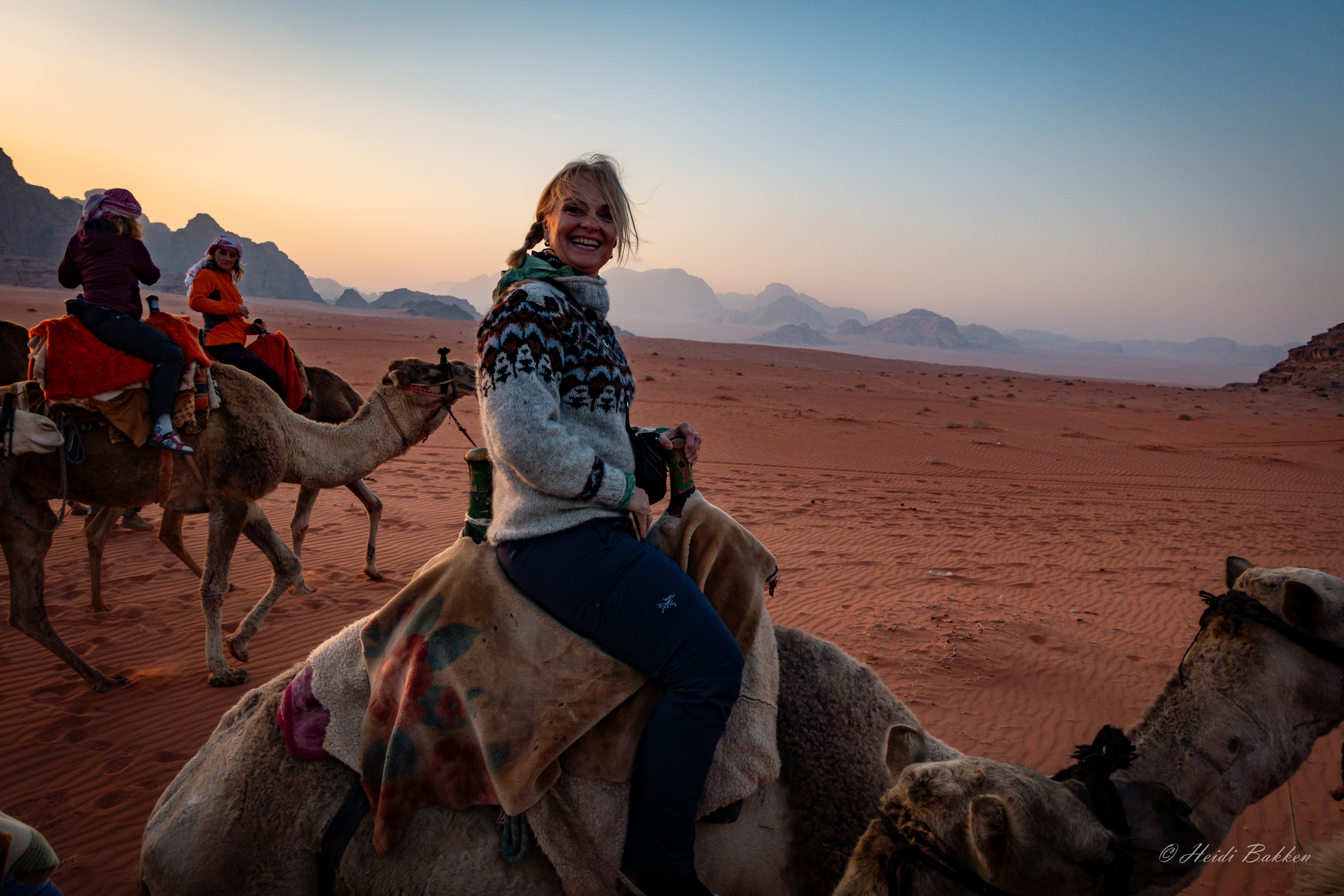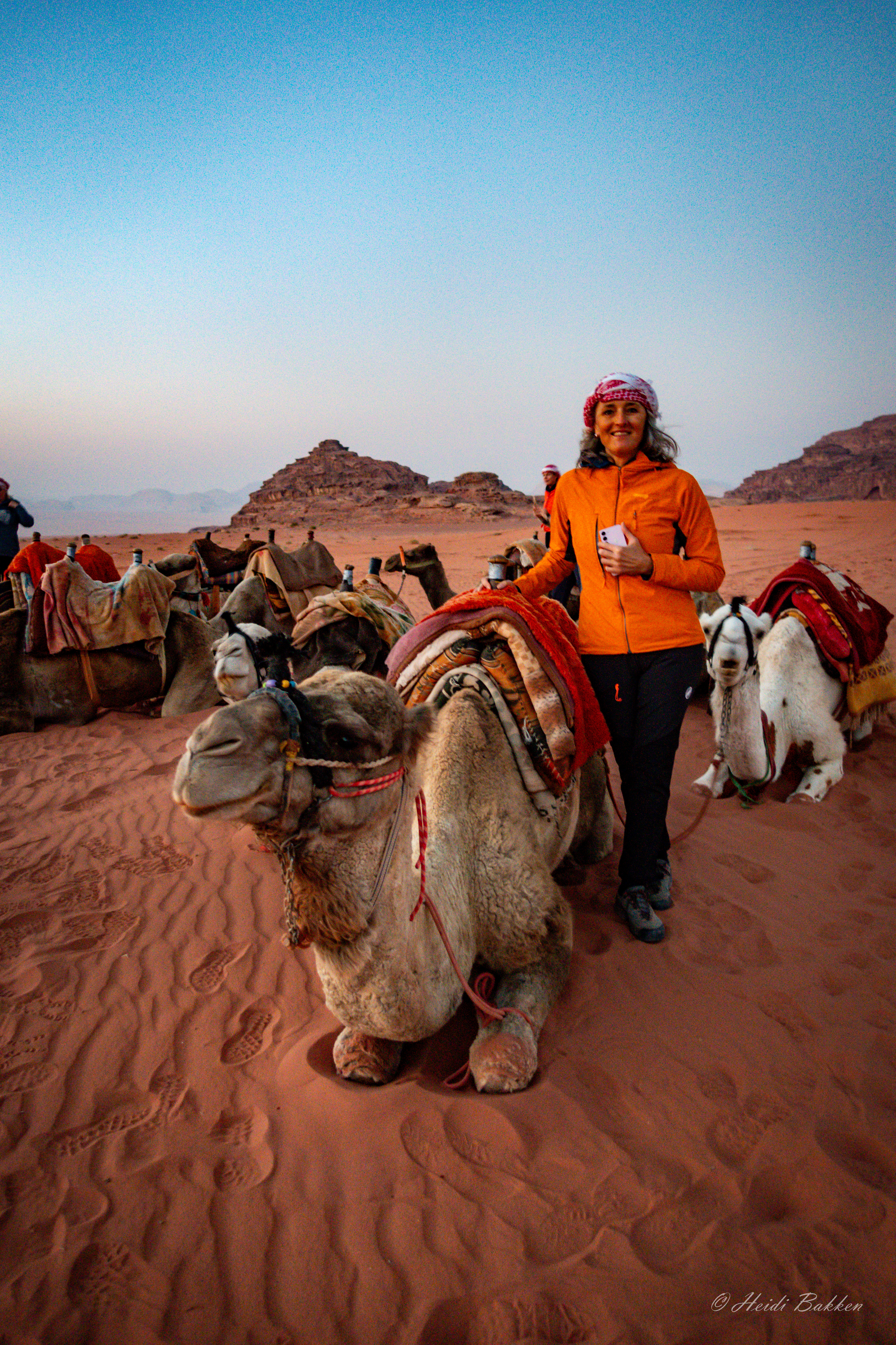 Vi skulle få hver vår dromedar og ri på den ut i ørkenen for å se soloppgangen. Gruppa små-fniste og summet av spenning. Dette var det få av oss som hadde noe erfaring med, men det gikk selvfølgelig helt strålende.