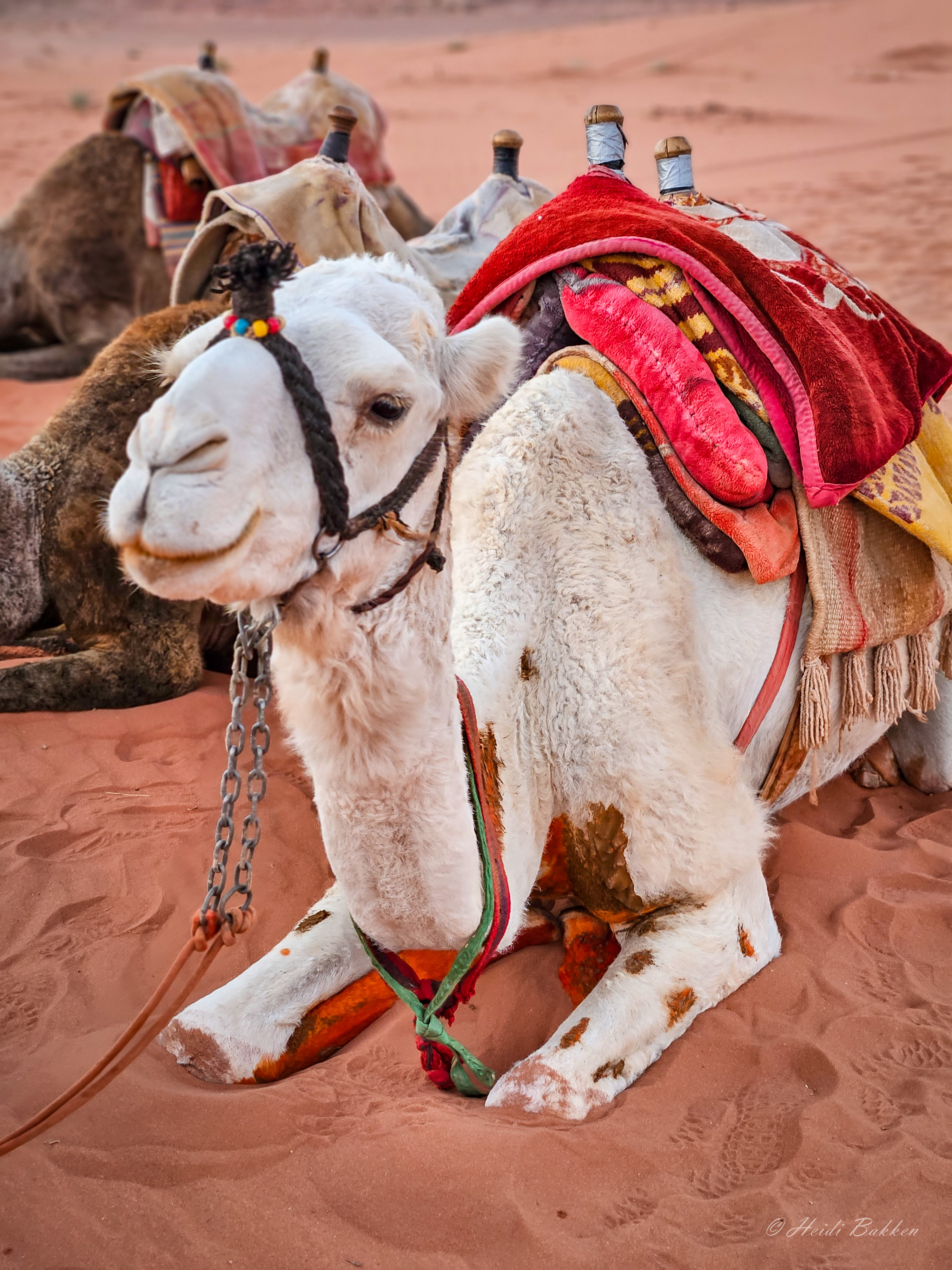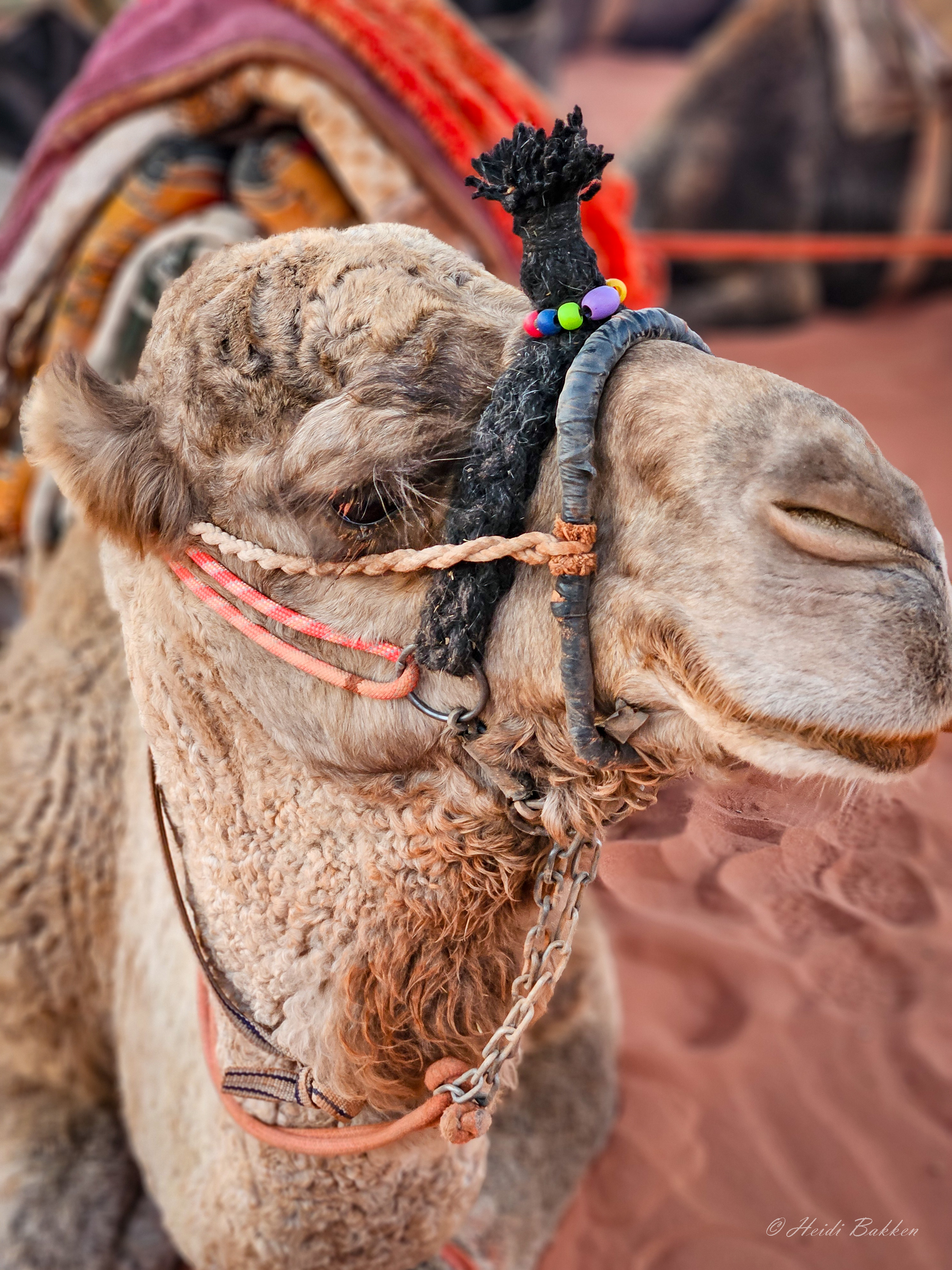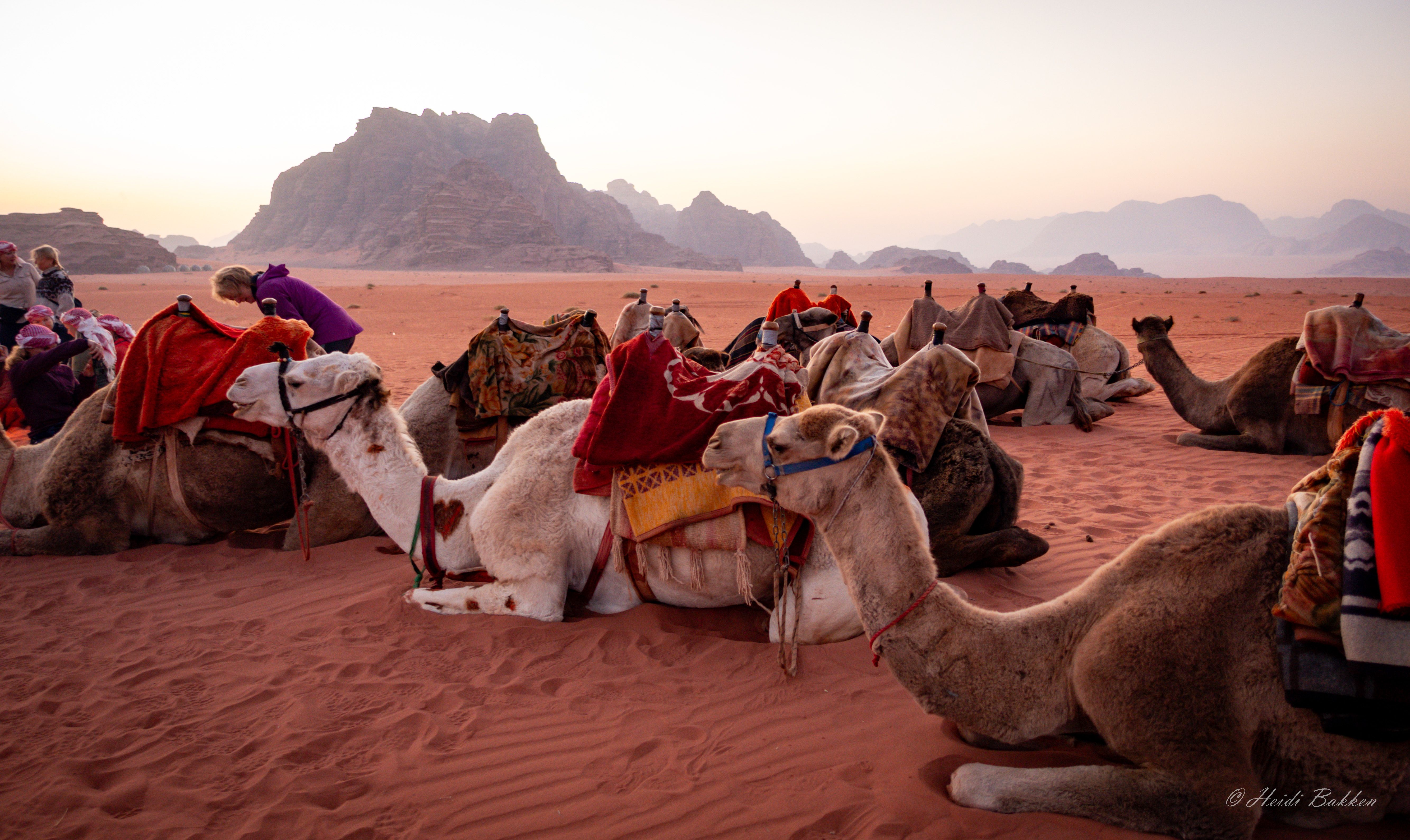 Vi skulle få hver vår dromedar og ri på den ut i ørkenen for å se soloppgangen. Gruppa små-fniste og summet av spenning. Dette var det få av oss som hadde noe erfaring med, men det gikk selvfølgelig helt strålende.