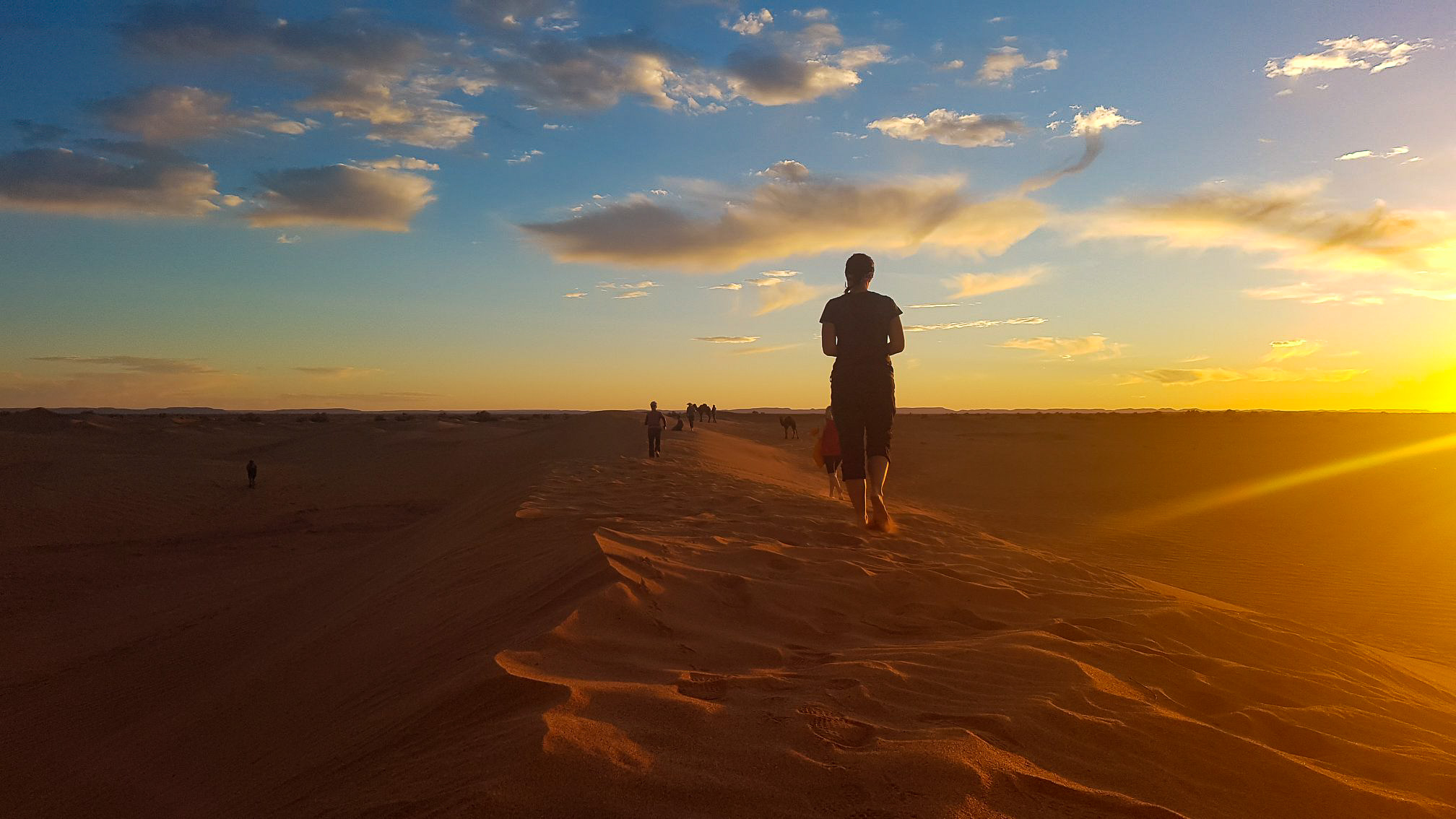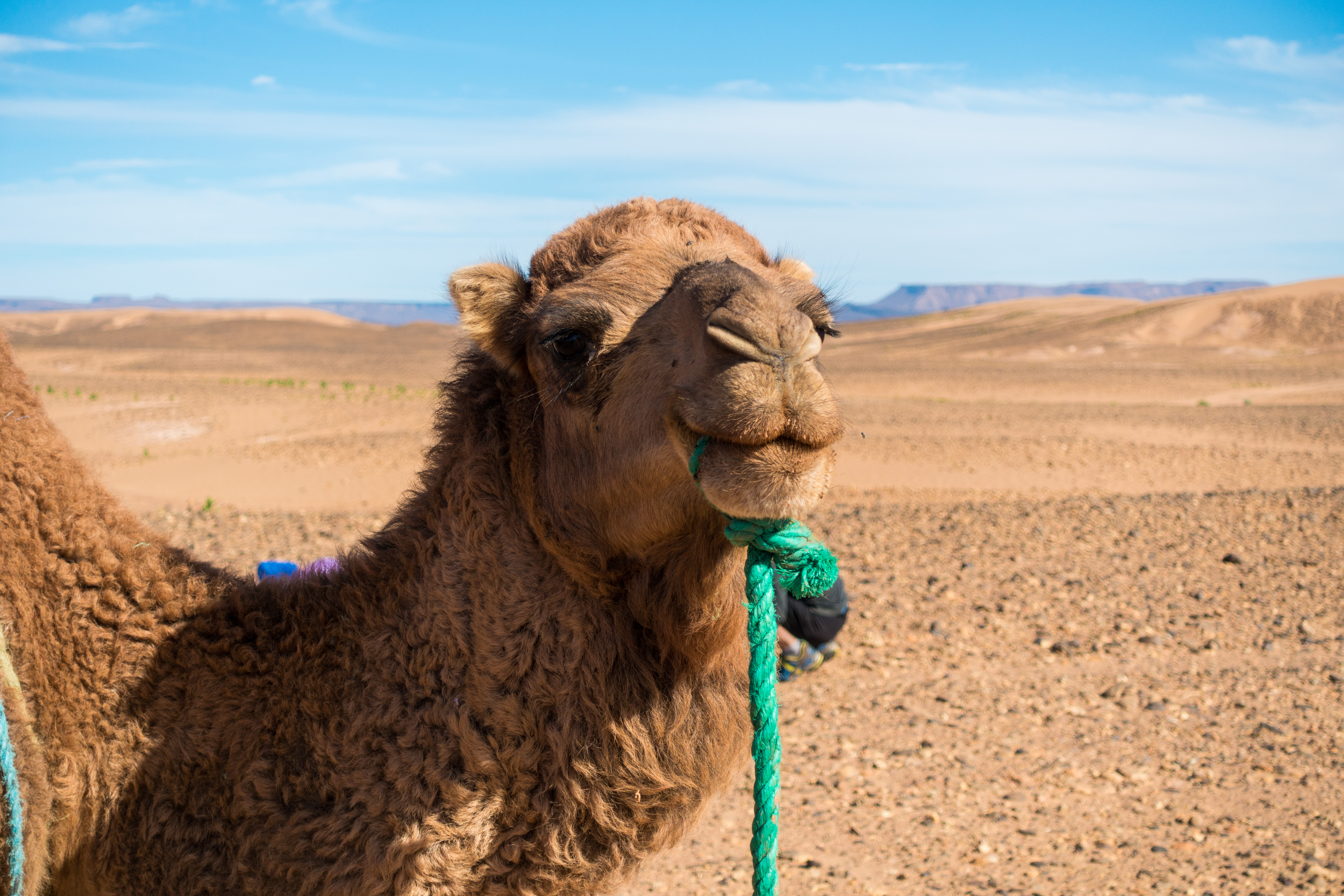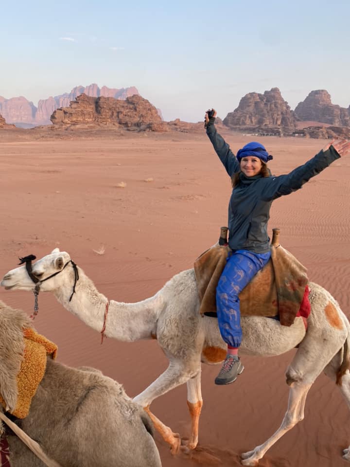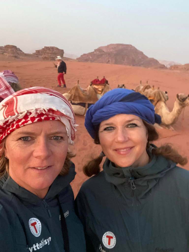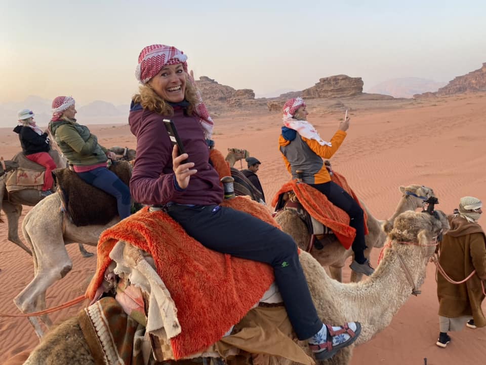 Vi skulle få hver vår dromedar og ri på den ut i ørkenen for å se soloppgangen. Gruppa små-fniste og summet av spenning. Dette var det få av oss som hadde noe erfaring med, men det gikk selvfølgelig helt strålende.