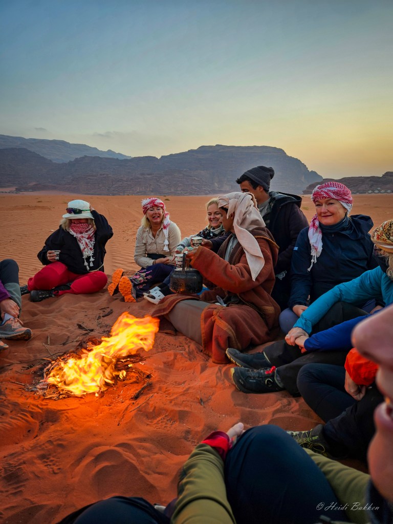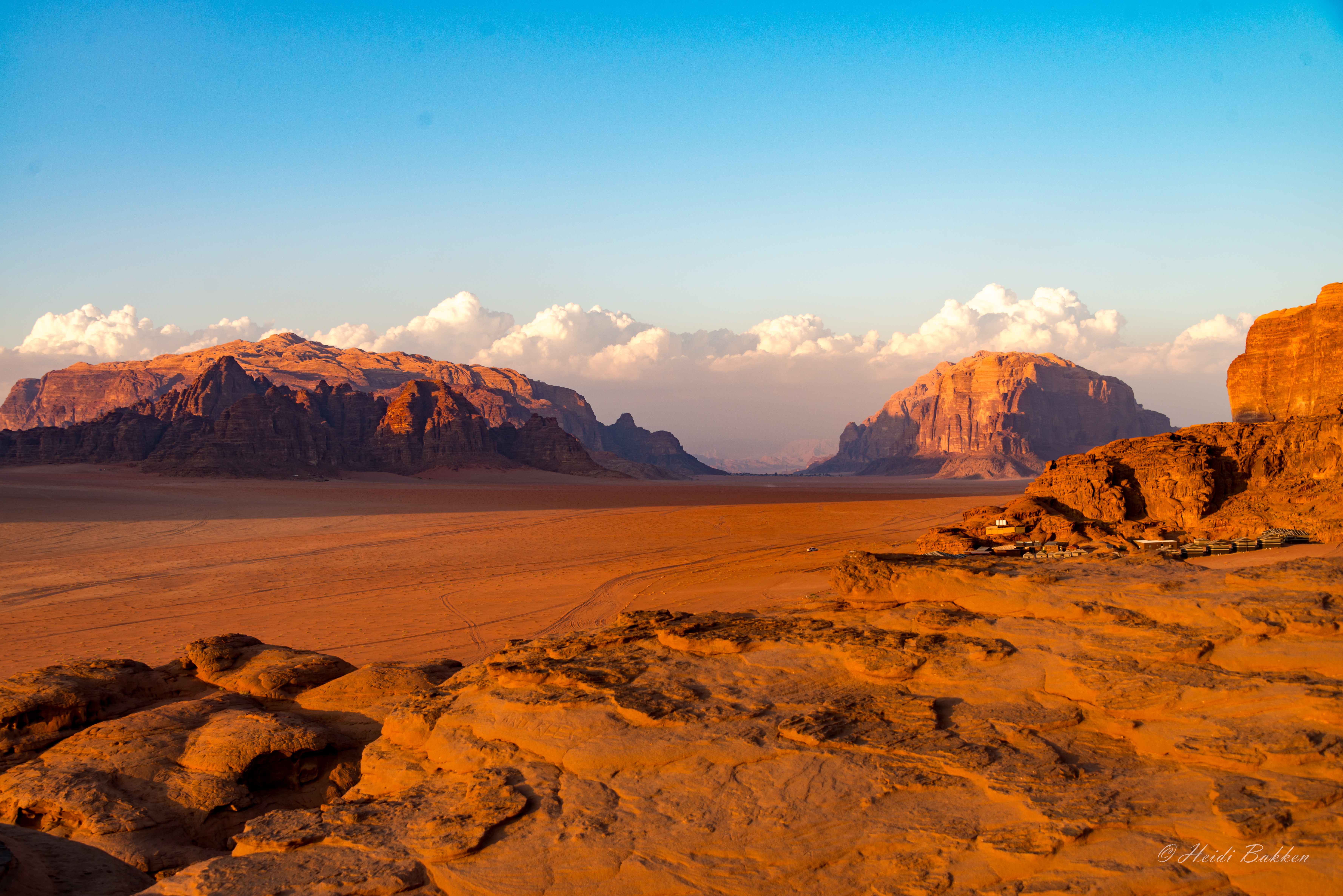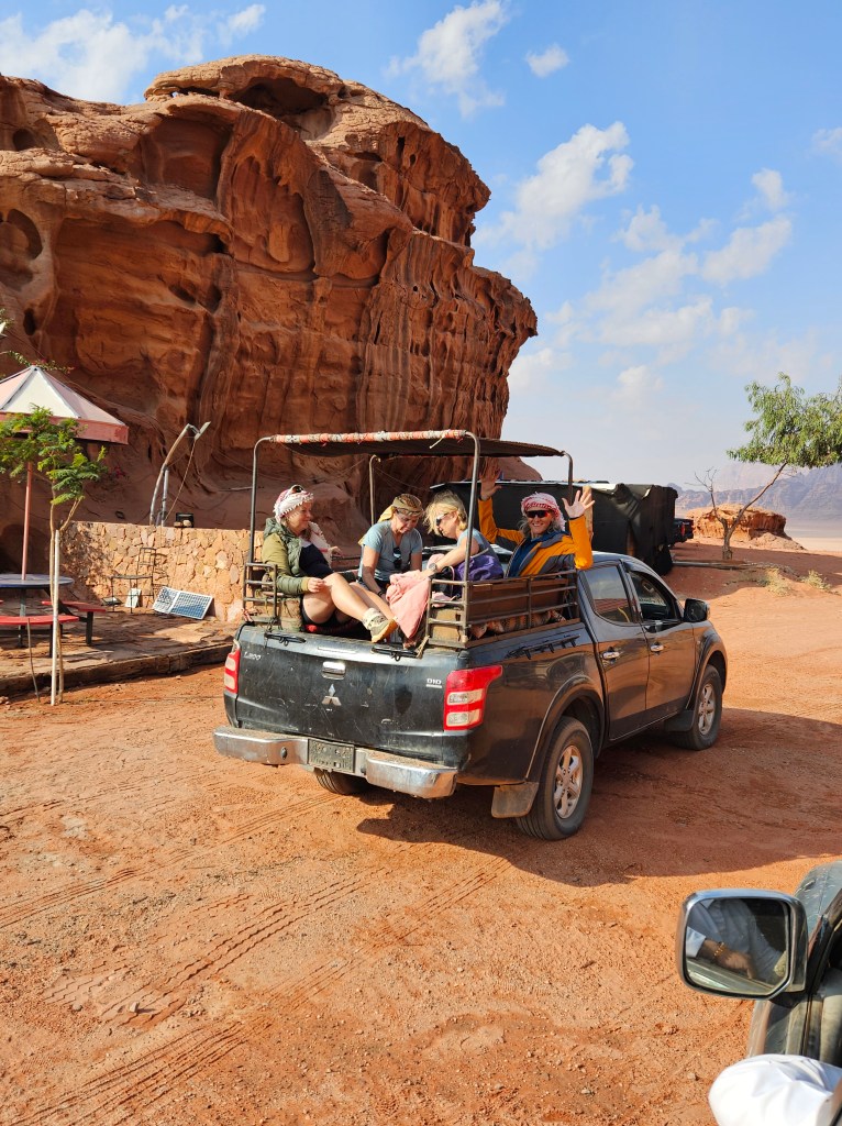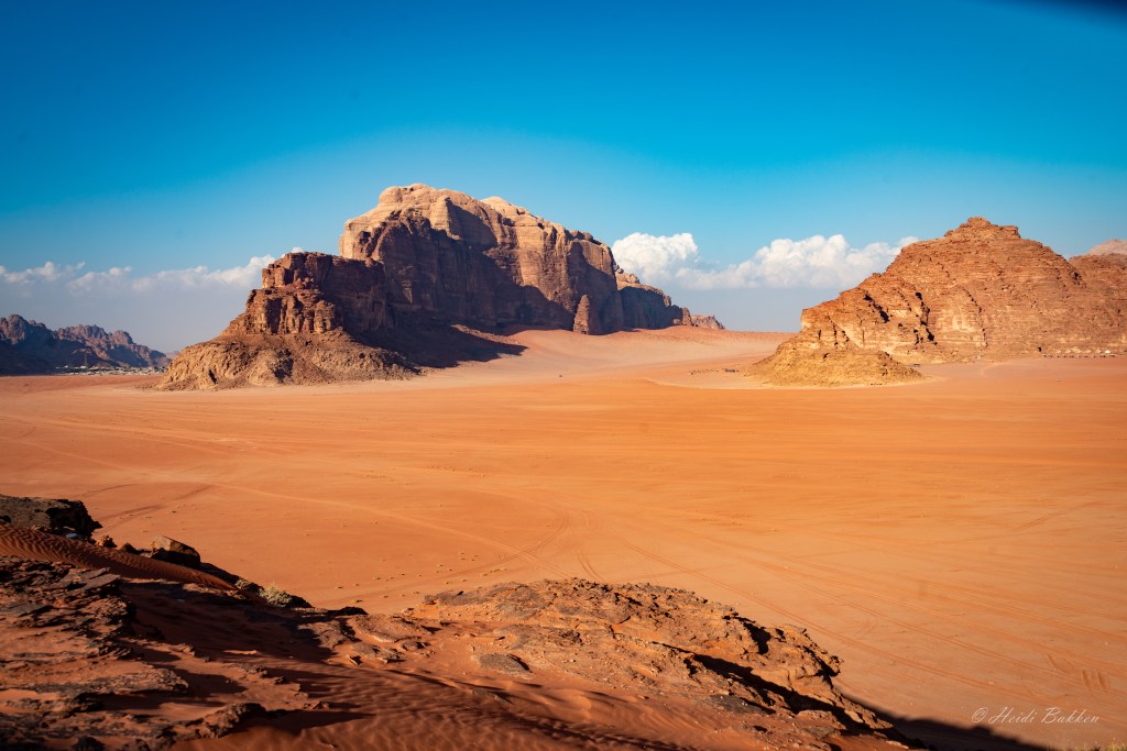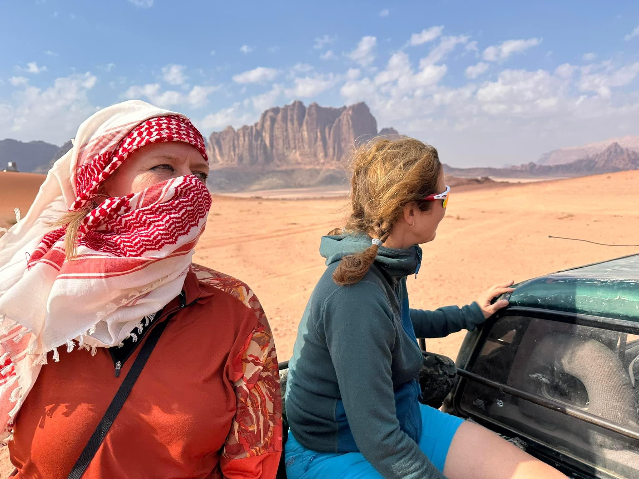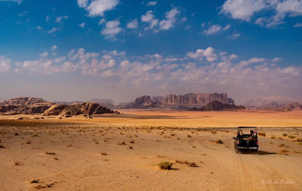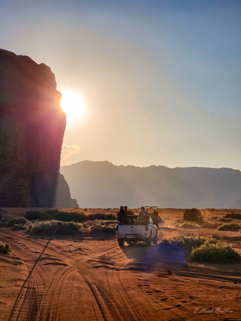 Ute av bussen tok jeeper oss med ut i det mektige ørkenlandskapet i Wadi Rum. De dramatiske fjellene steiler opp av den røde ørkensanden, himmelen er blå over oss, fargene og landskapet rundt oss er praktfullt!