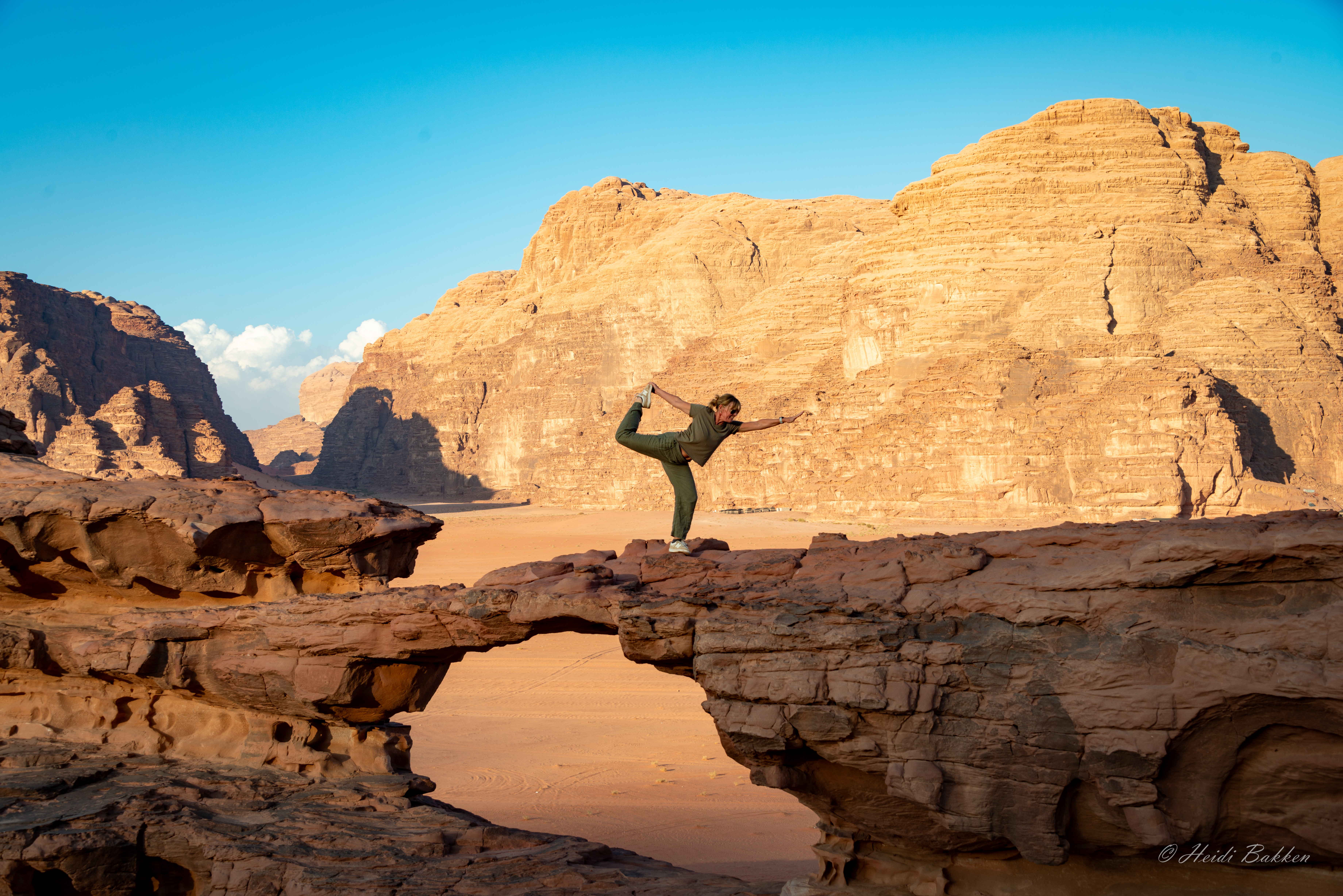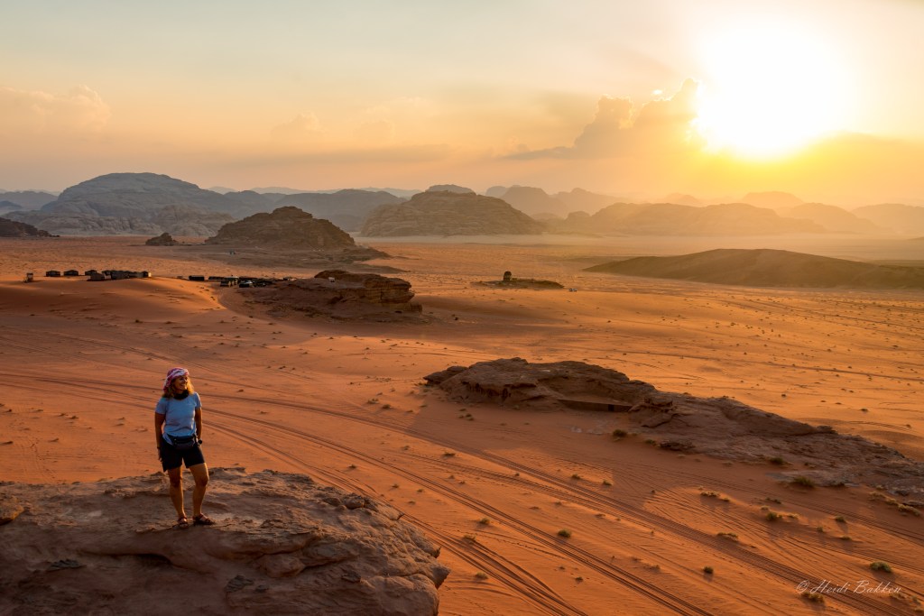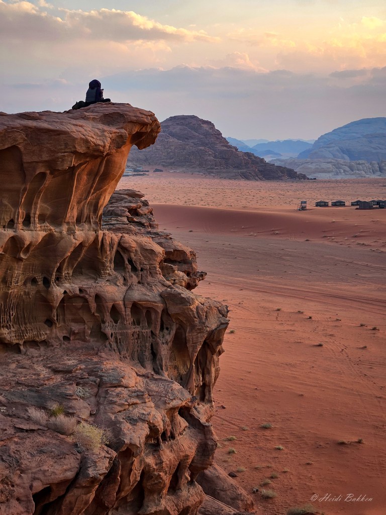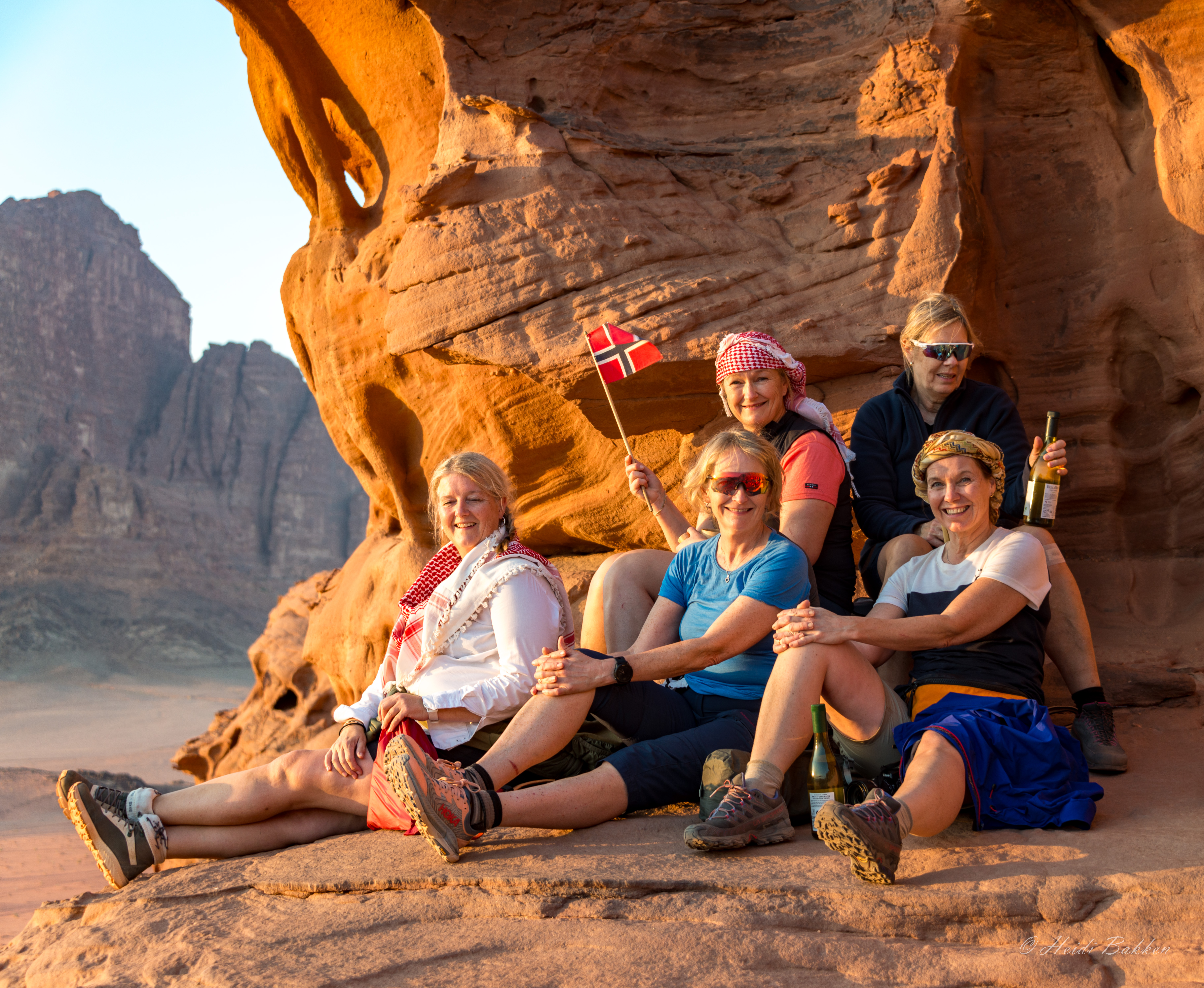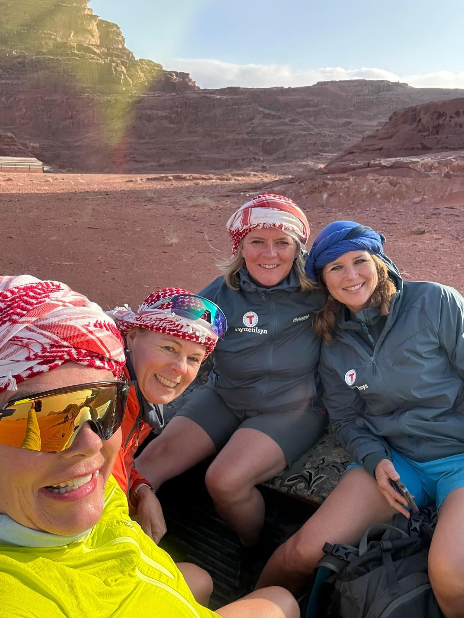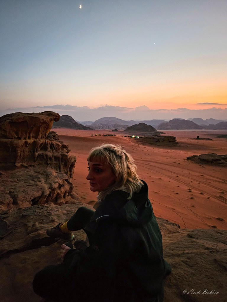 Ute av bussen tok jeeper oss med ut i det mektige ørkenlandskapet i Wadi Rum. De dramatiske fjellene steiler opp av den røde ørkensanden, himmelen er blå over oss, fargene og landskapet rundt oss er praktfullt!