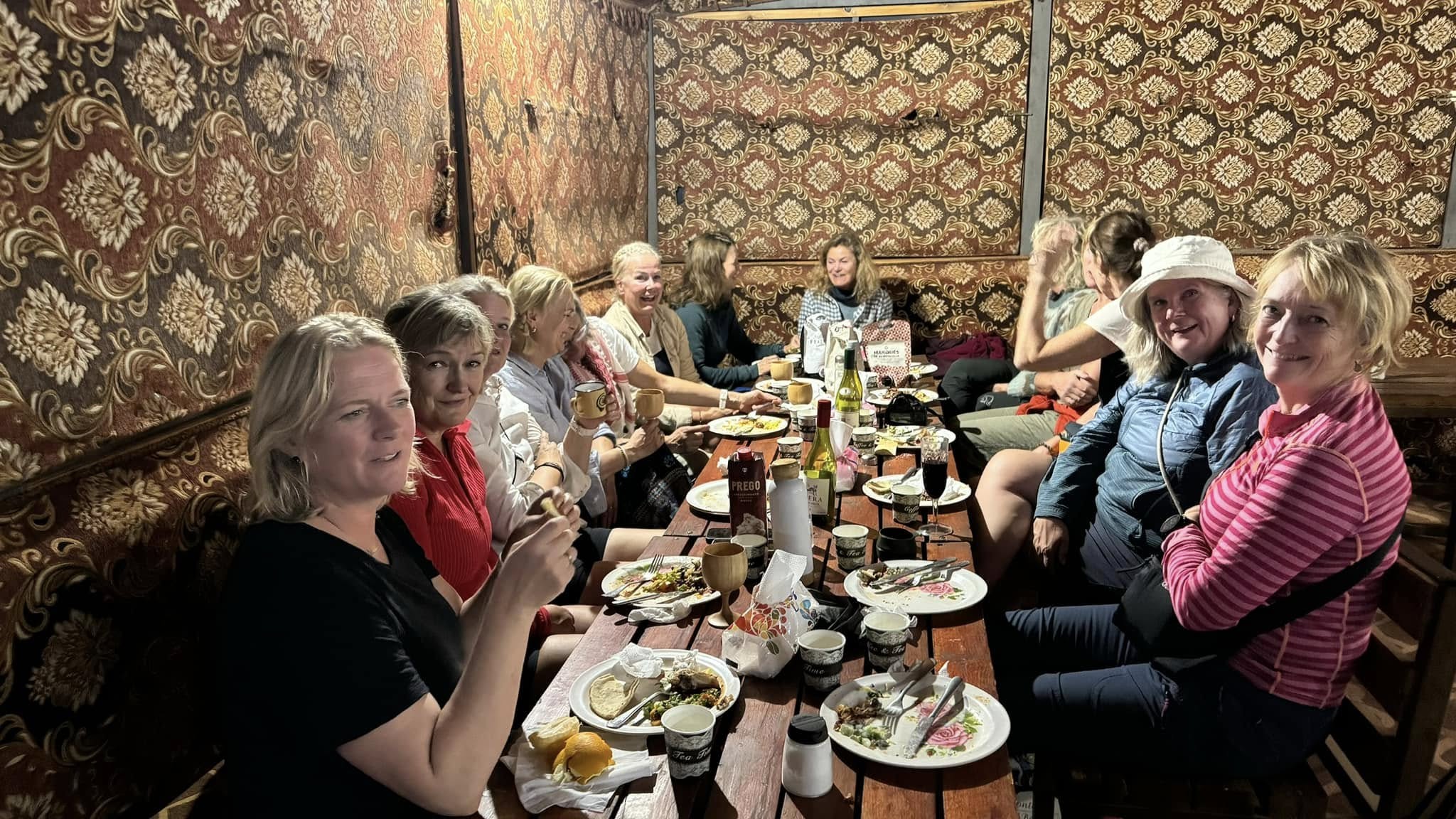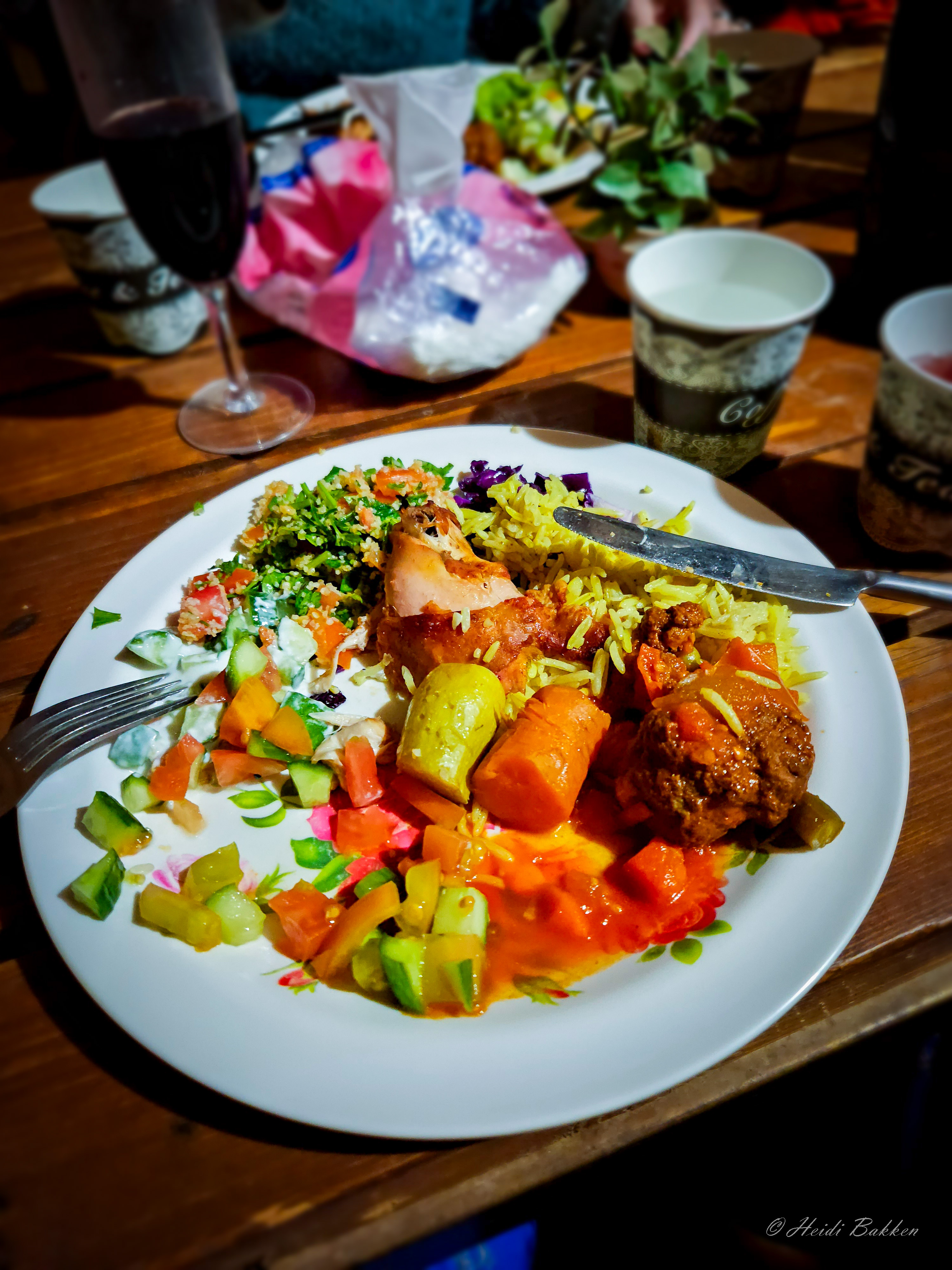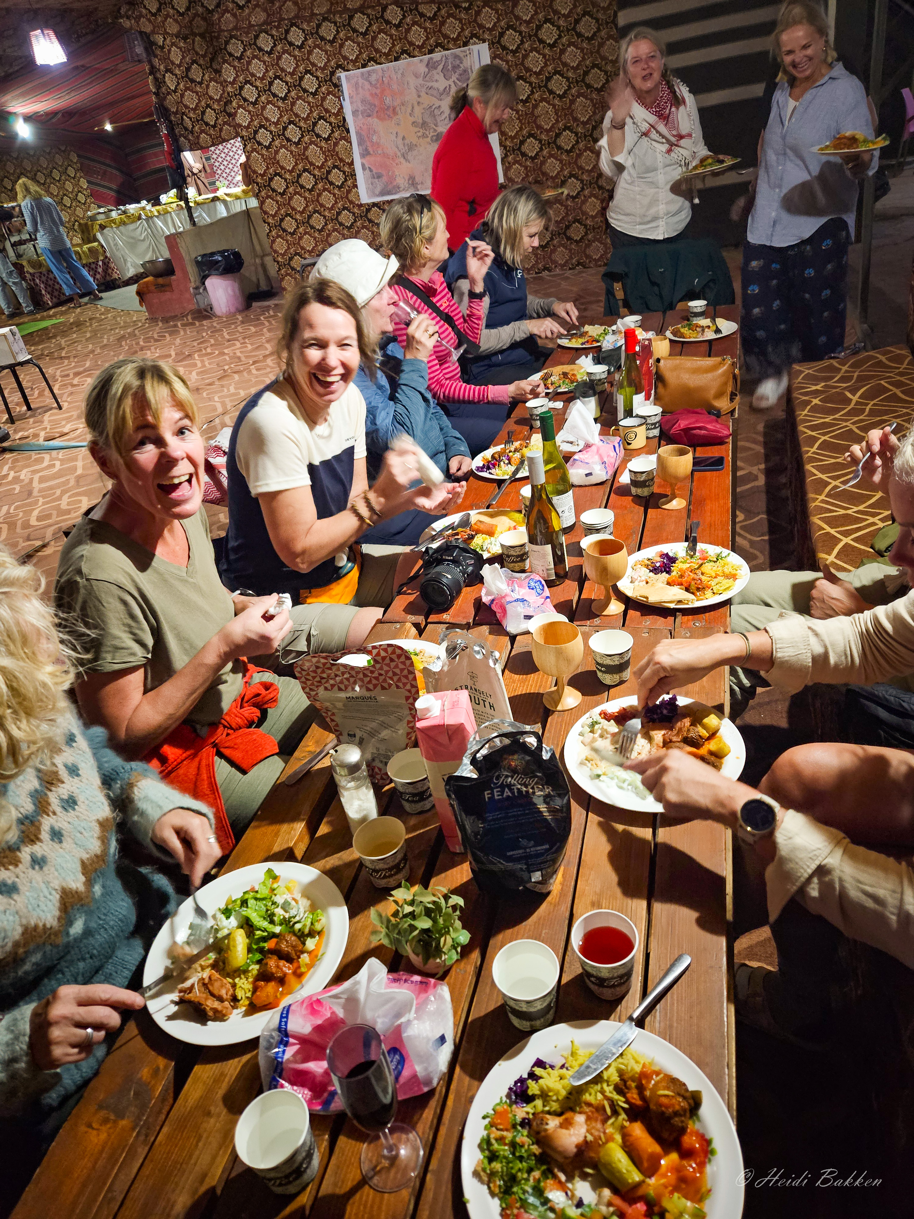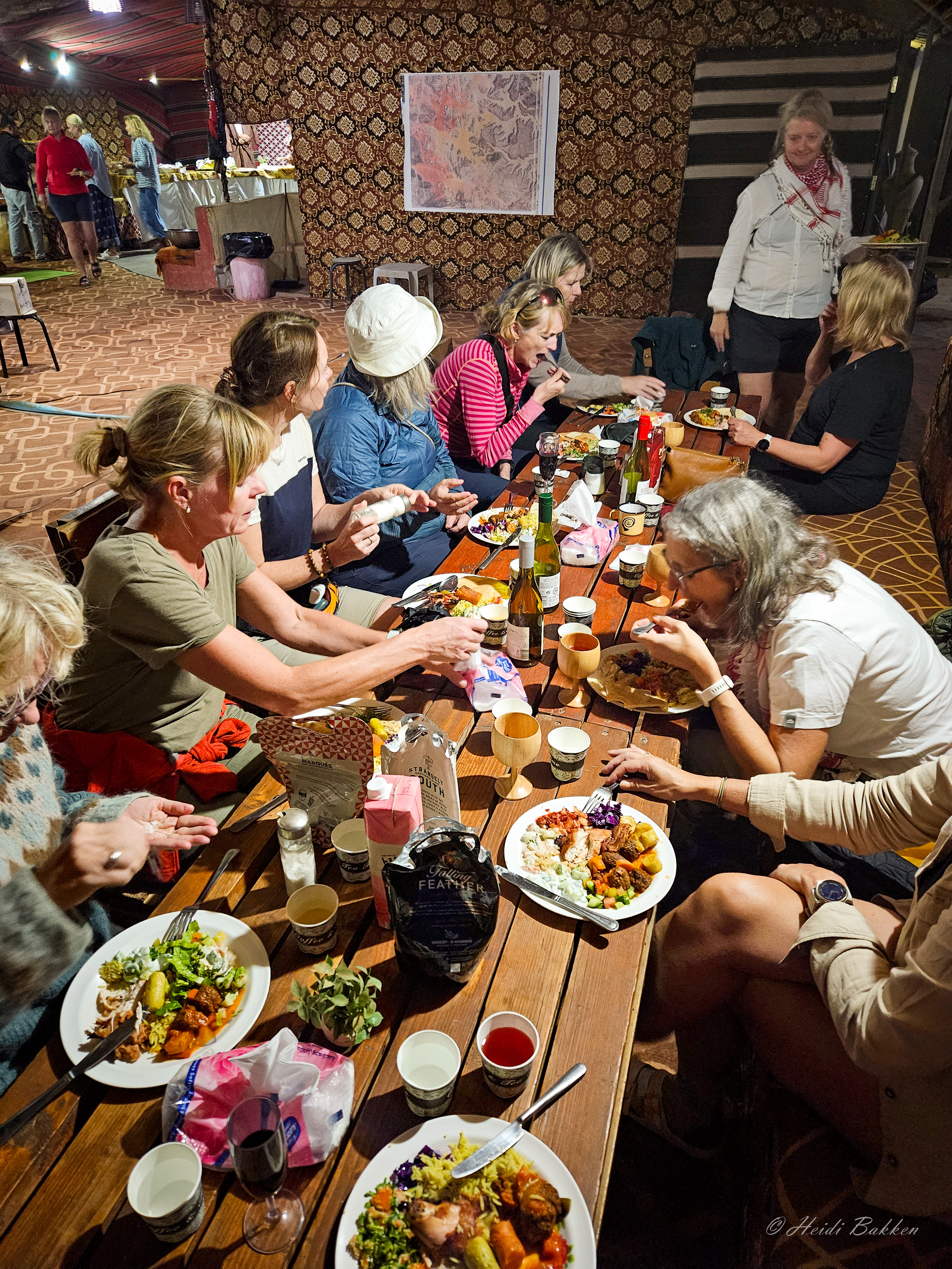Middagen ble spist i et stor beduintelt som var dekortert med ikke bare vegg til vegg tepper, men også gulv til tak tepper.