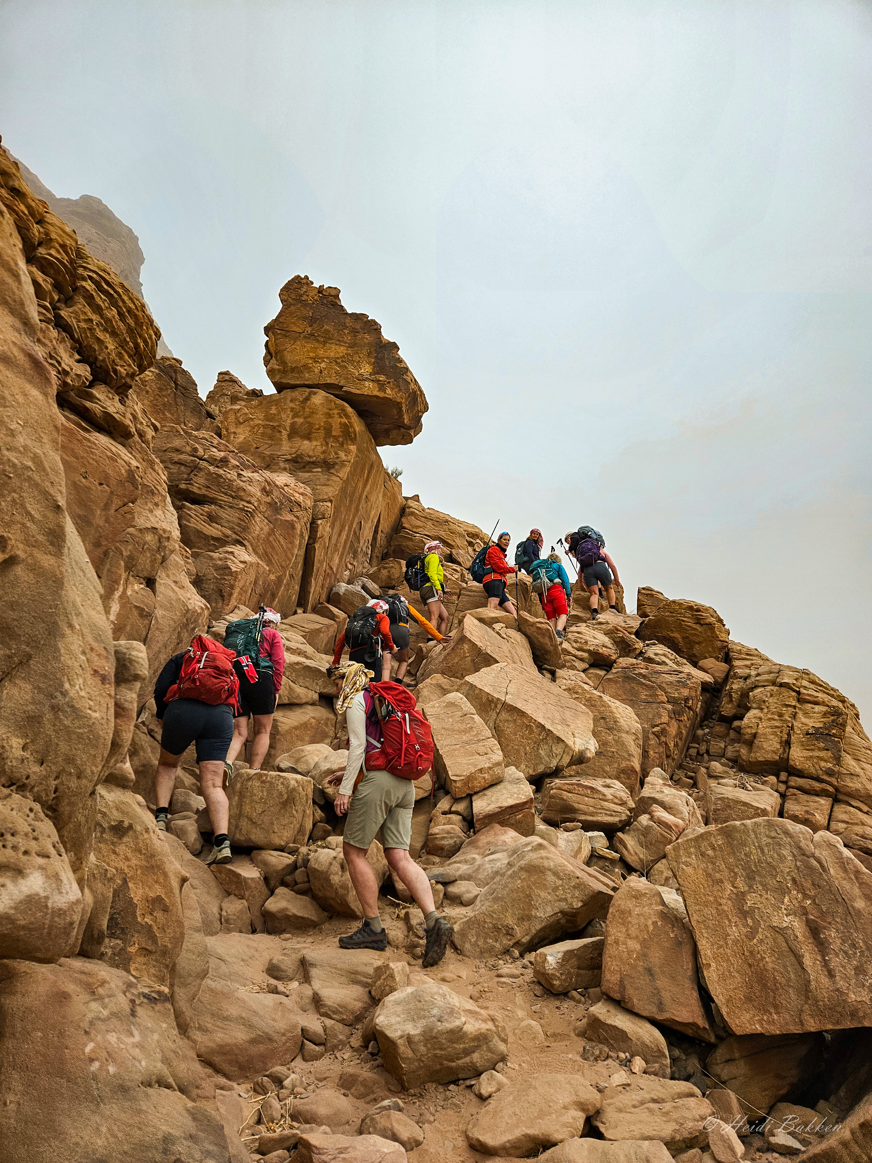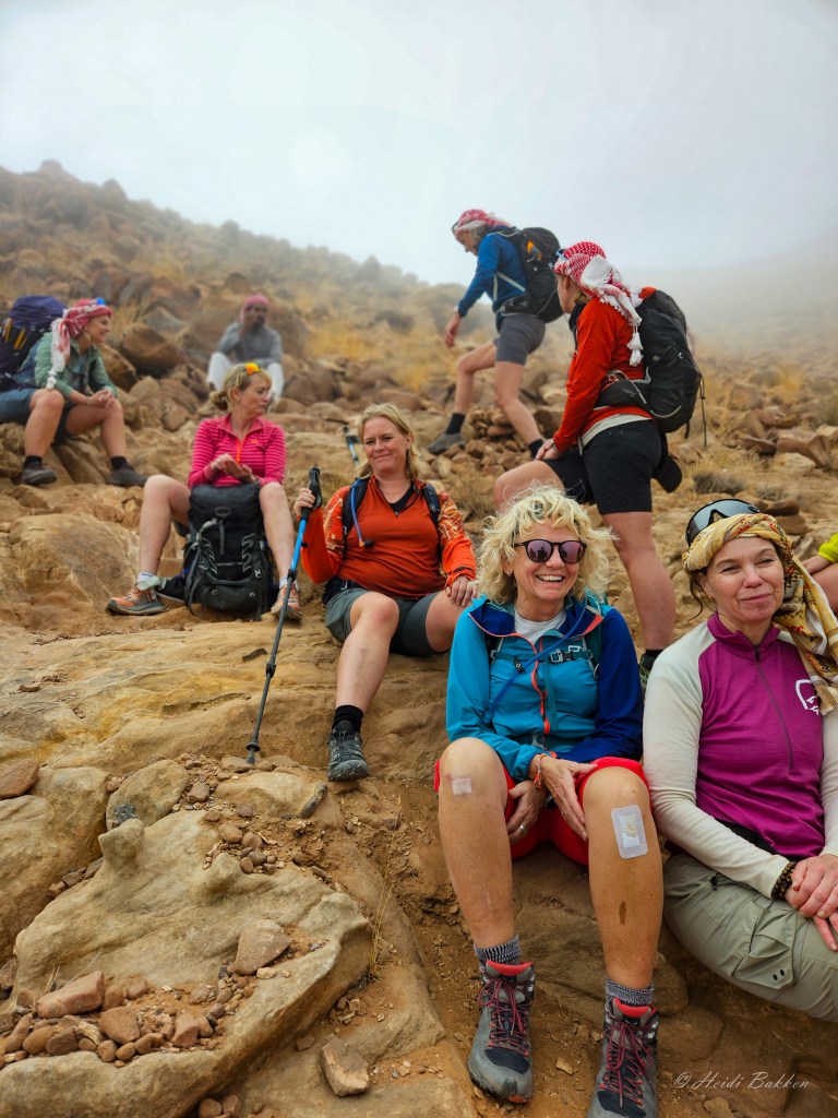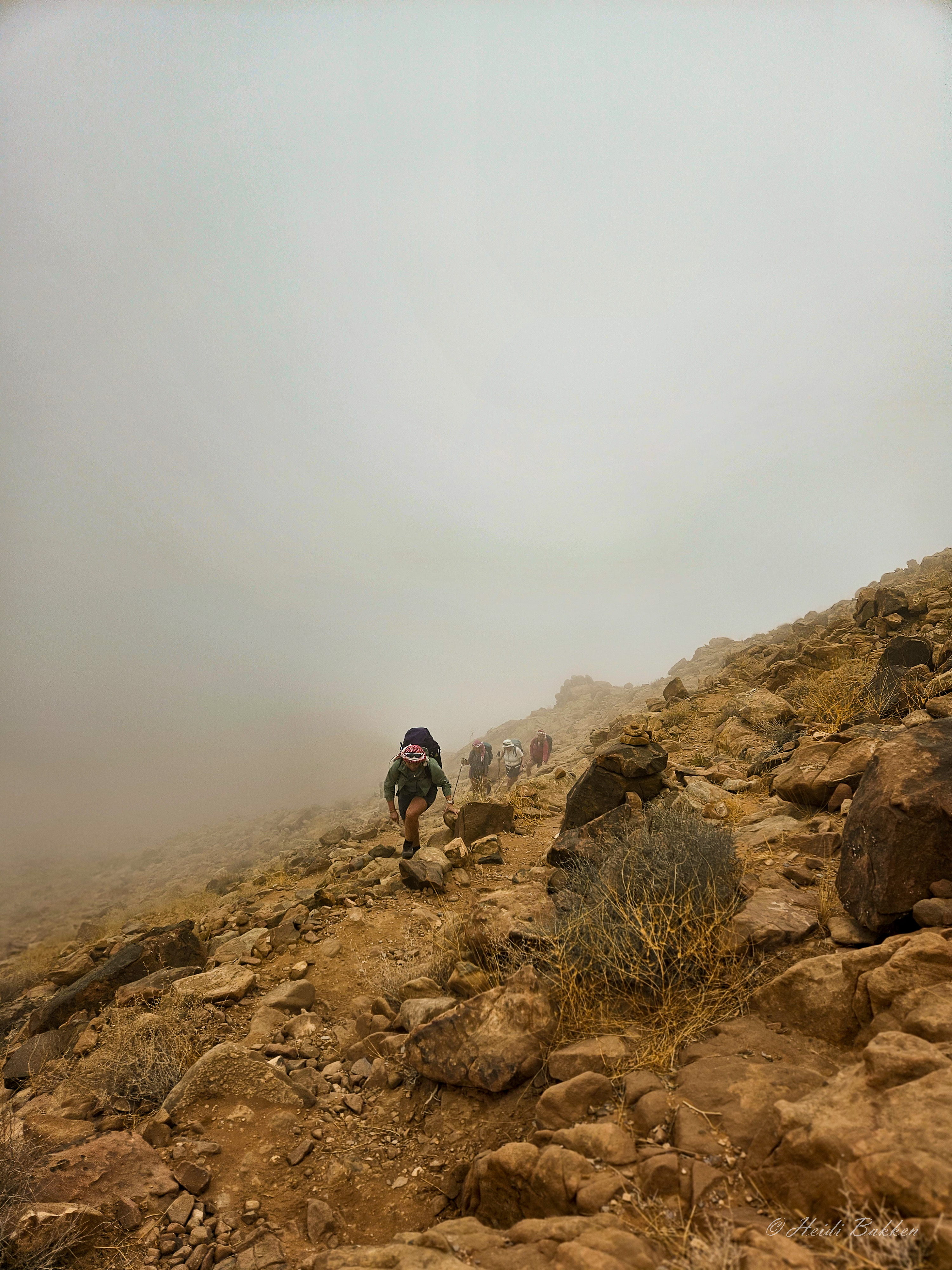 Litt lett klyving i ett par partier tok oss til topps på en drøy time, hvor vi, hadde det ikke ligget tåke på toppen, hadde blitt belønnet med en spektakulær panoramautsikt over ørkenen.