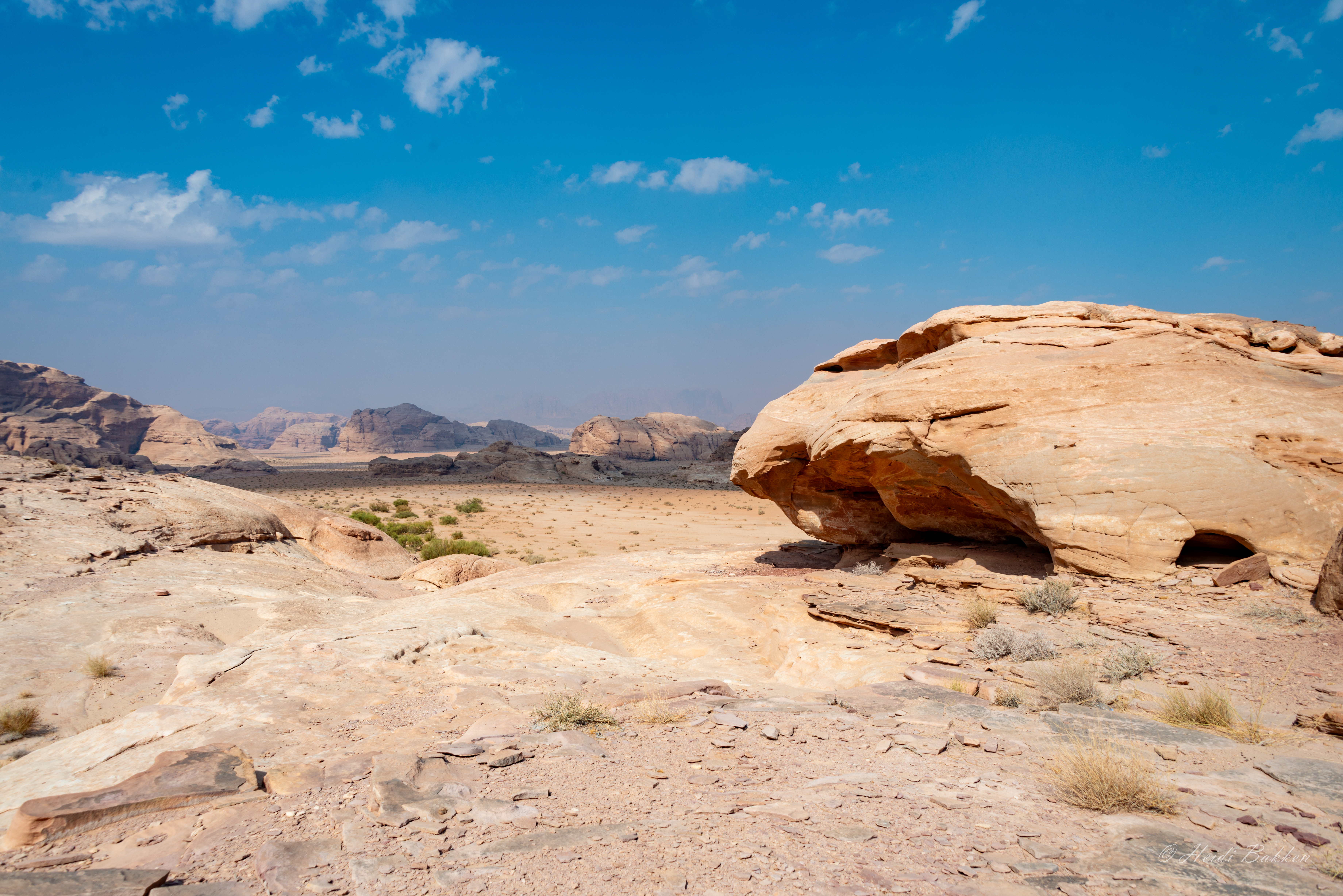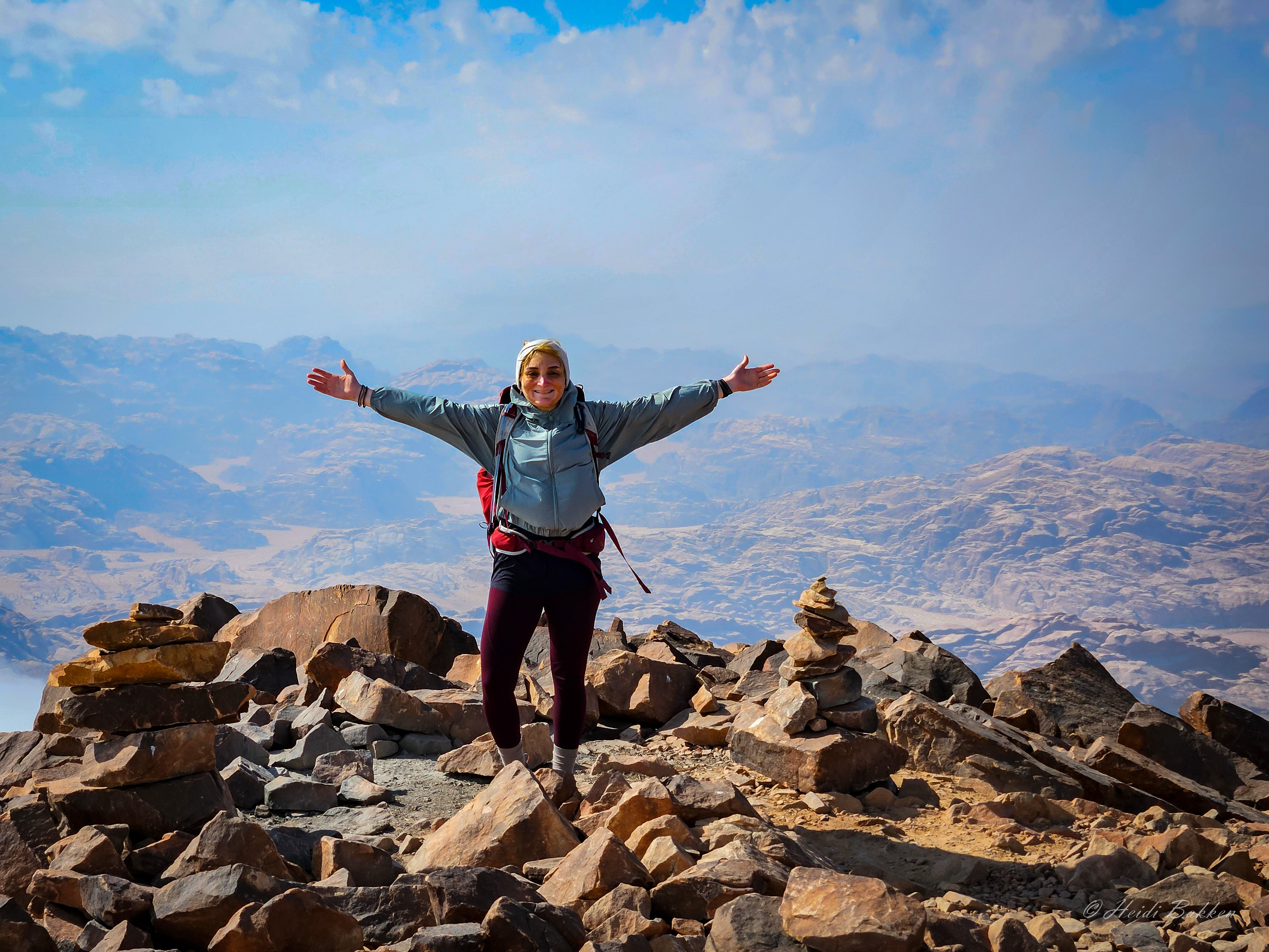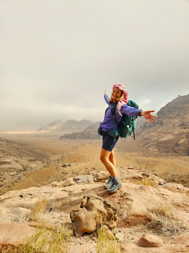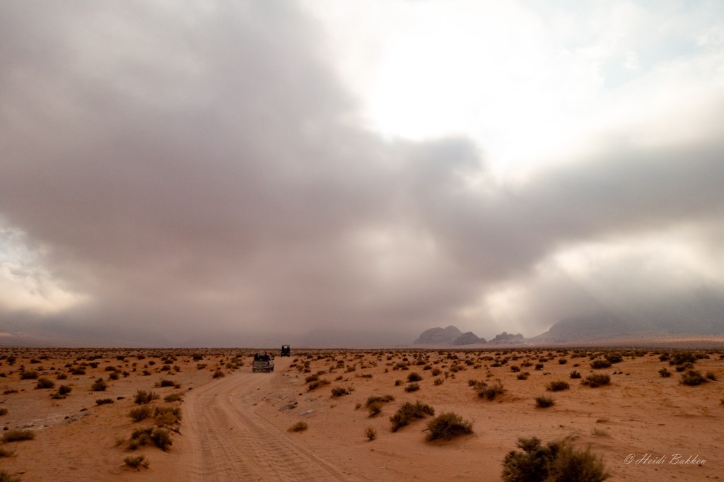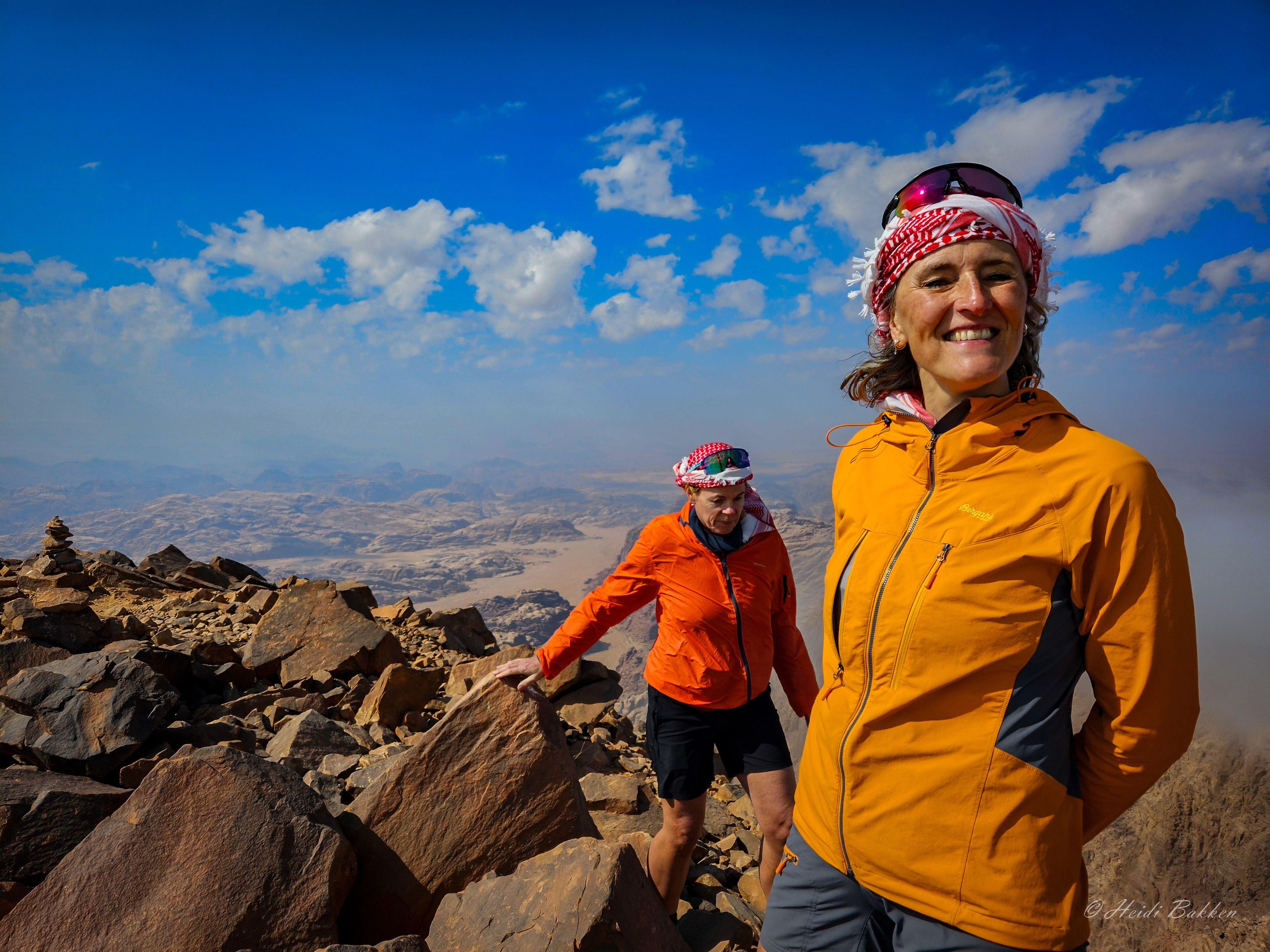 Fra toppen kan man se sørover mot grensen til Saudi-Arabia og nordover mot Jebel Rum, det nest høyeste punktet i Jordan. Vi fikk noen gløtt gjennom skyene. Det hjalp å være kjapp på avtrekkeren.