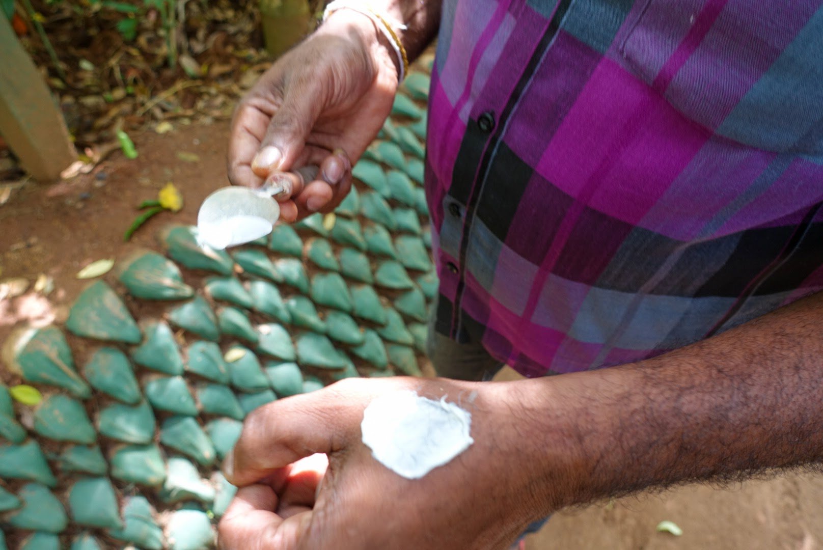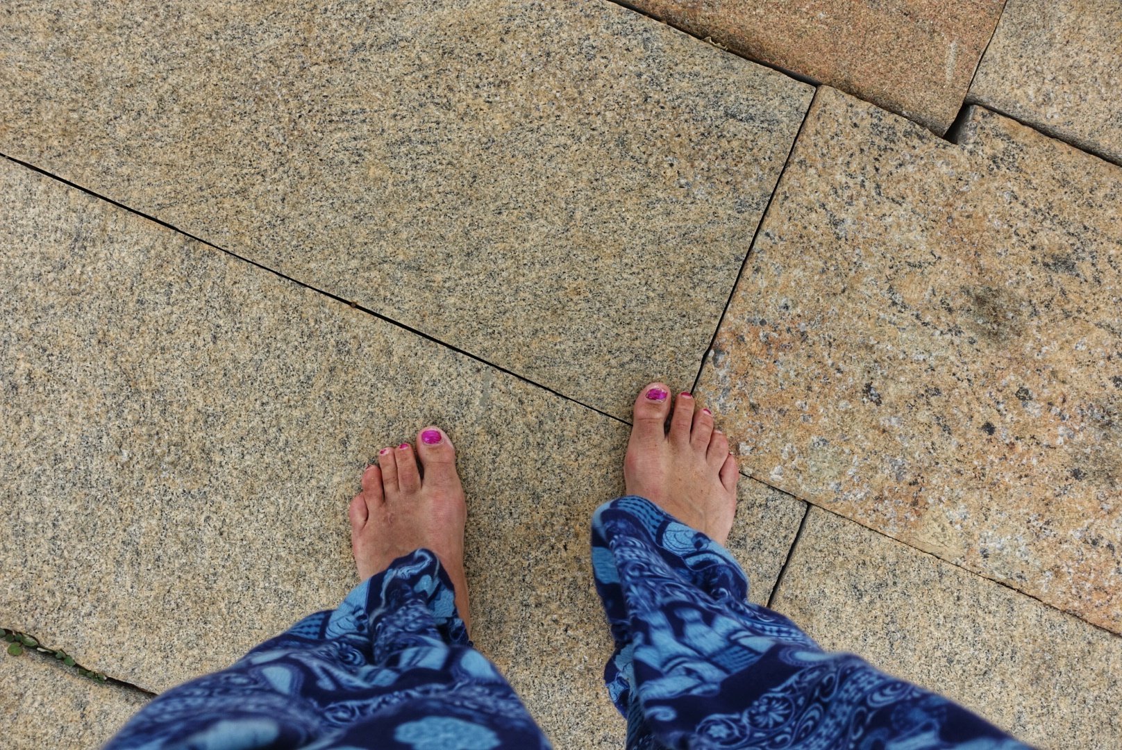 Det er også av og på med sko denne dagen og føttene mine trives visst her. Det går bedre å bedre å være barbeint og «grounded» som guiden min sier. Sko er ikke bra, du må gå barbeint for å være nærmere jorda. Jeg begynner å bli enig – helt til jeg tråkker på spiss stein.