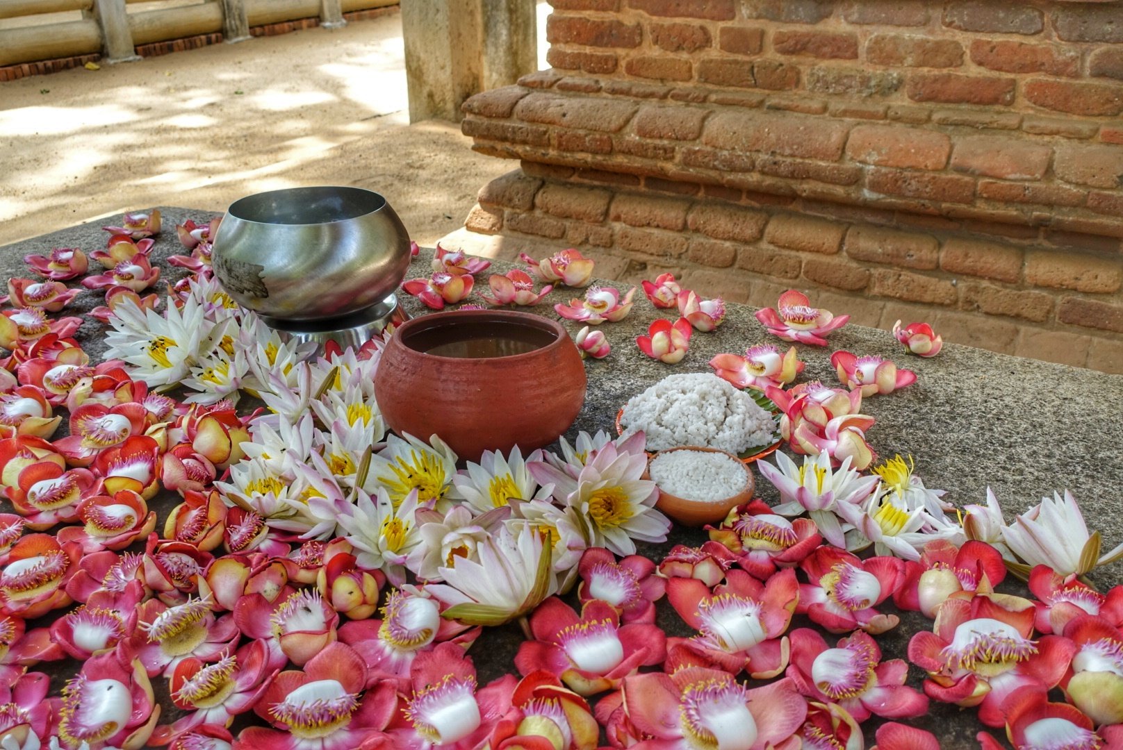 Jeg har spurt og fått beskjed om at det ikke (vanligvis) er noe inne i stupaene. De er bare kolosser av murstein, med stor betydning for Buddhistene. De kommer hit for å be, for å ofre blomster, mat, hellig vann og røkelse. De kler seg i hvitt for å vise respekt for Buddha. Heldigvis hadde jeg en hvit topp med meg. Den er på i dag.