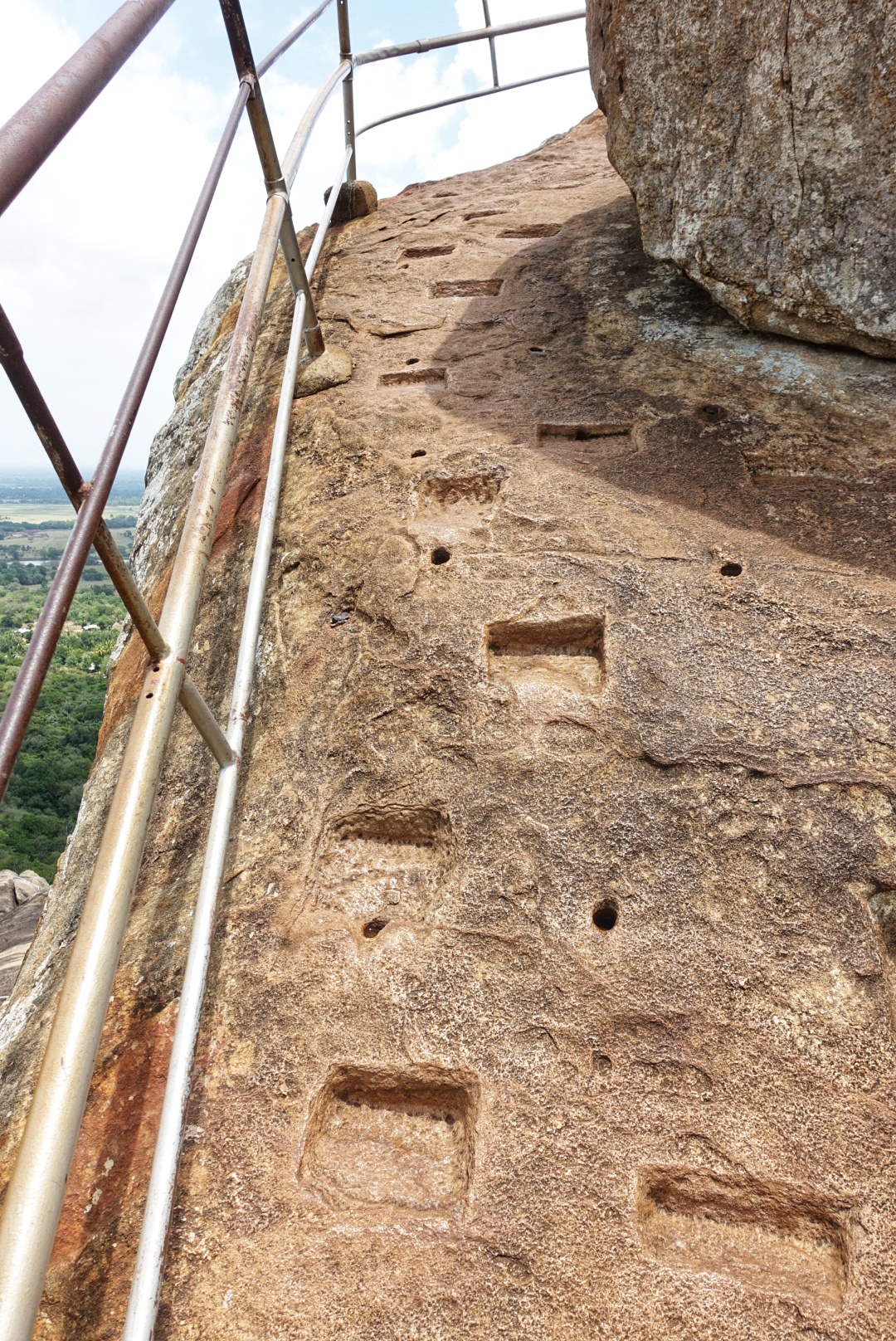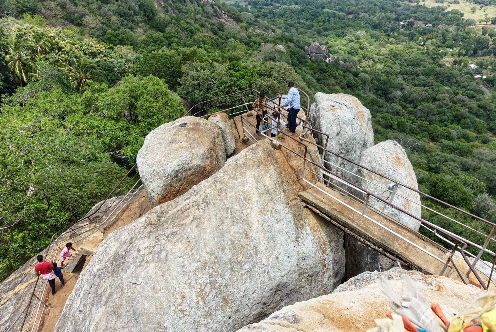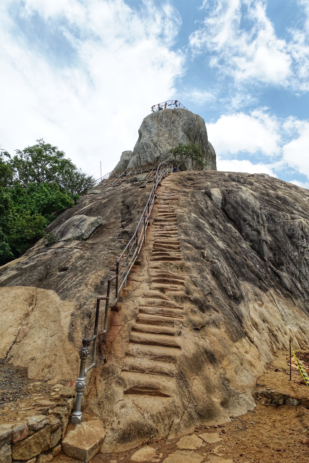 På toppen er det en stor åpen plass med tre høyder i form av store kampesteiner. På den ene er det hugget små, skrå trappetrinn inn i fjellet. Vi skal selvfølgelig helt til toppen. Artig å klatre barbeint.