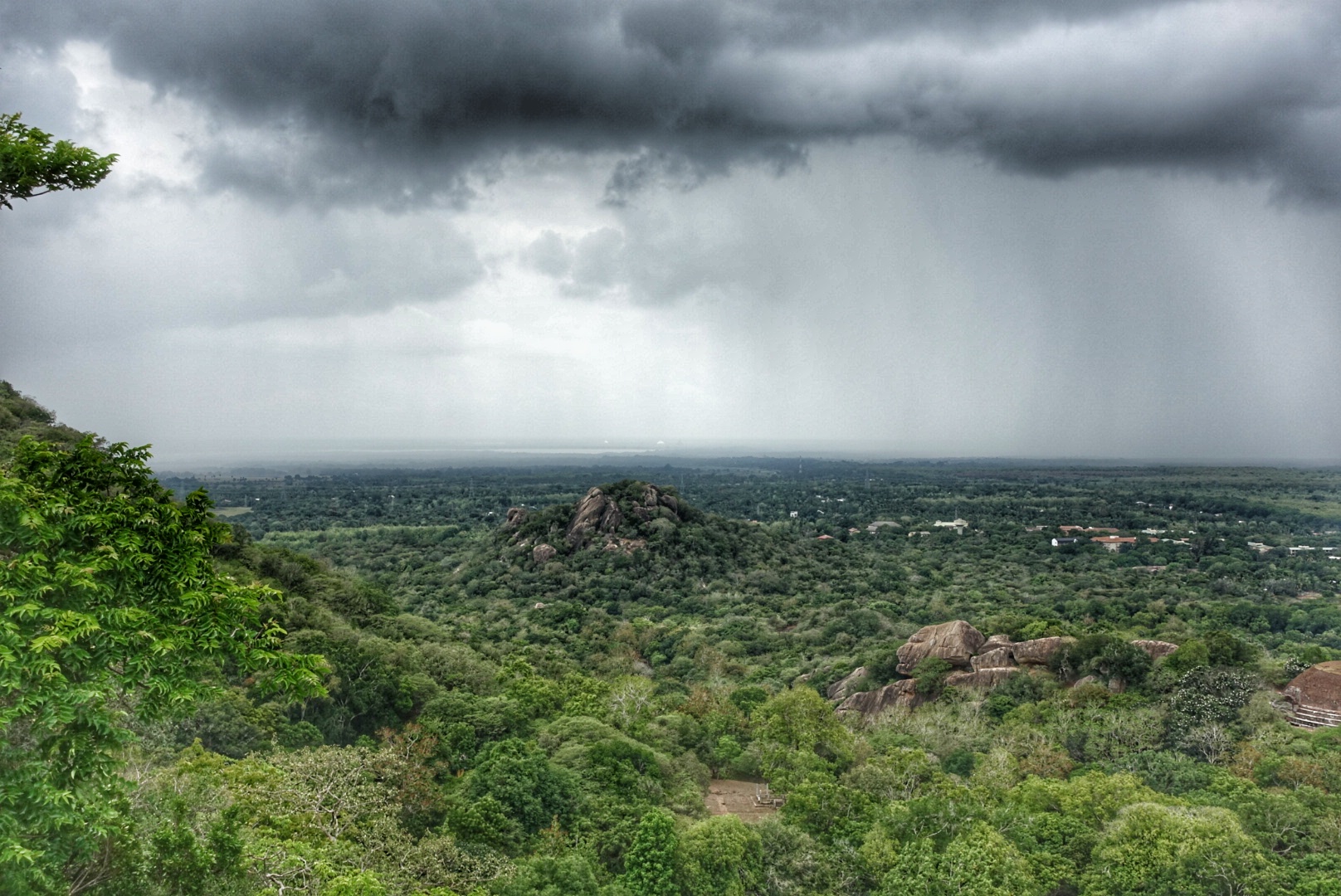 På nabotoppen er det en stupa – utrolig nok. Den er veldig lik andre stupaer jeg har sett i dag. Det er imidlertid dramatisk utsikt fra toppen for nå kommer det et skikkelig regnvær mot oss.